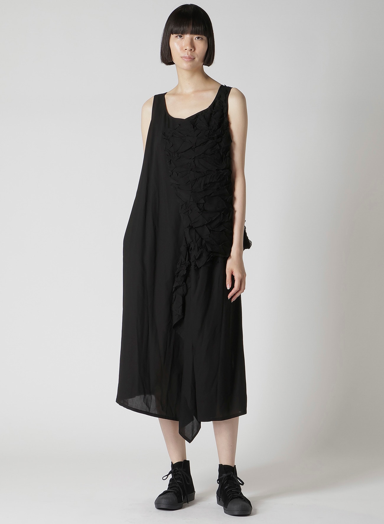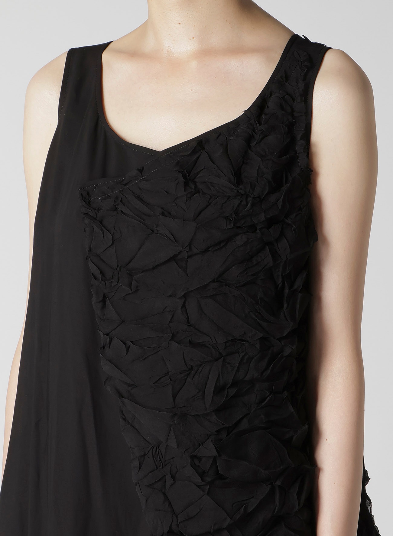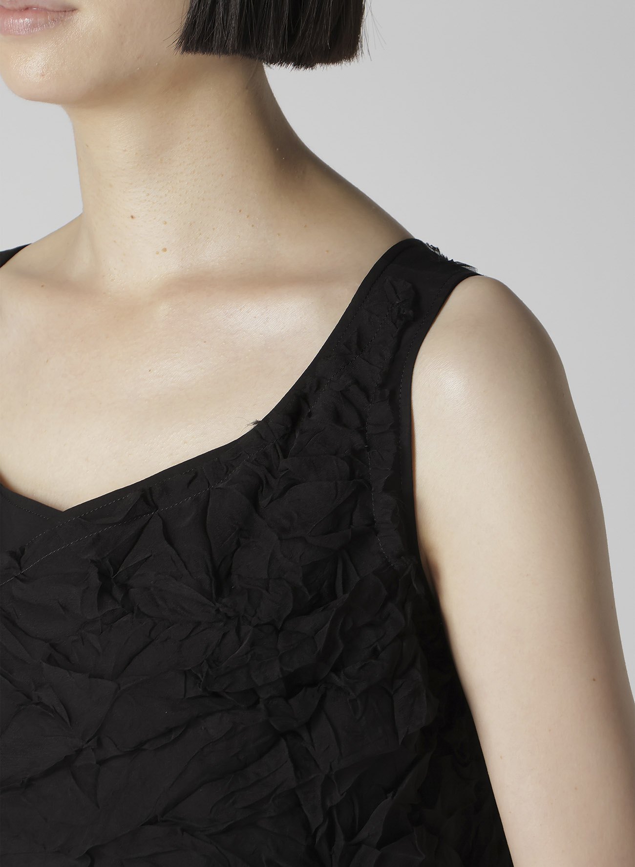 清涼感あふれるシルクシフォンが軽やかなノースリーブドレス。独特なシワ加工を施すことで表情のある素材感に仕上げました。1枚で華やかなスタイルを演出します。モデル着用画像はサンプルアイテムを使用しています。製品とサイズや風合いが異なる場合がございます。詳しくはSIZE INFOをご確認下さい。