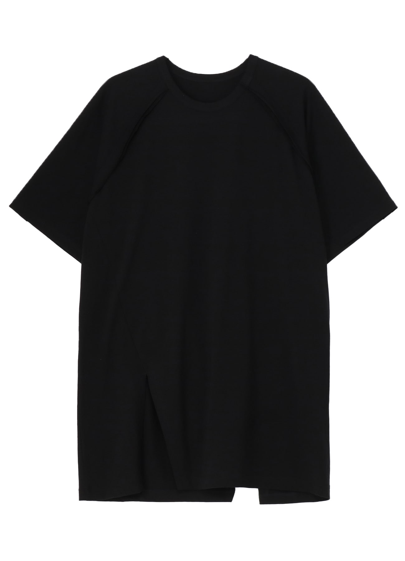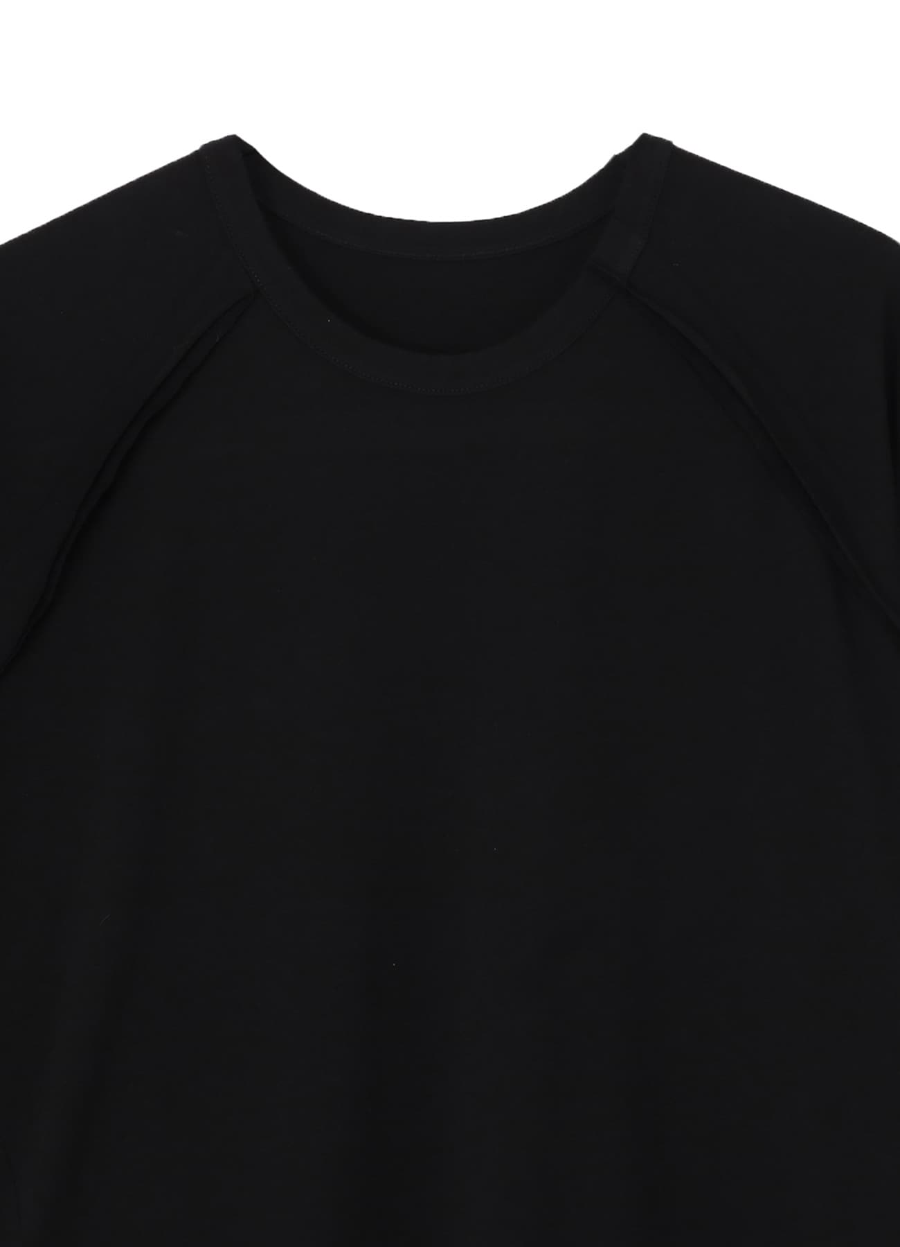随所に断ち切り縫い代を表に出し動きを出したデザイン半袖カットソー。ヨーク続きの前ラグラン、後ろドルマンの変形袖で仕上げています。ユニセックスにお使いいただけます。きめ細やかな織り目とハリとコシが特徴的な定番コットン天竺を使用しています。上質で柔らかく、自然なドレープをお楽しみいただけます。