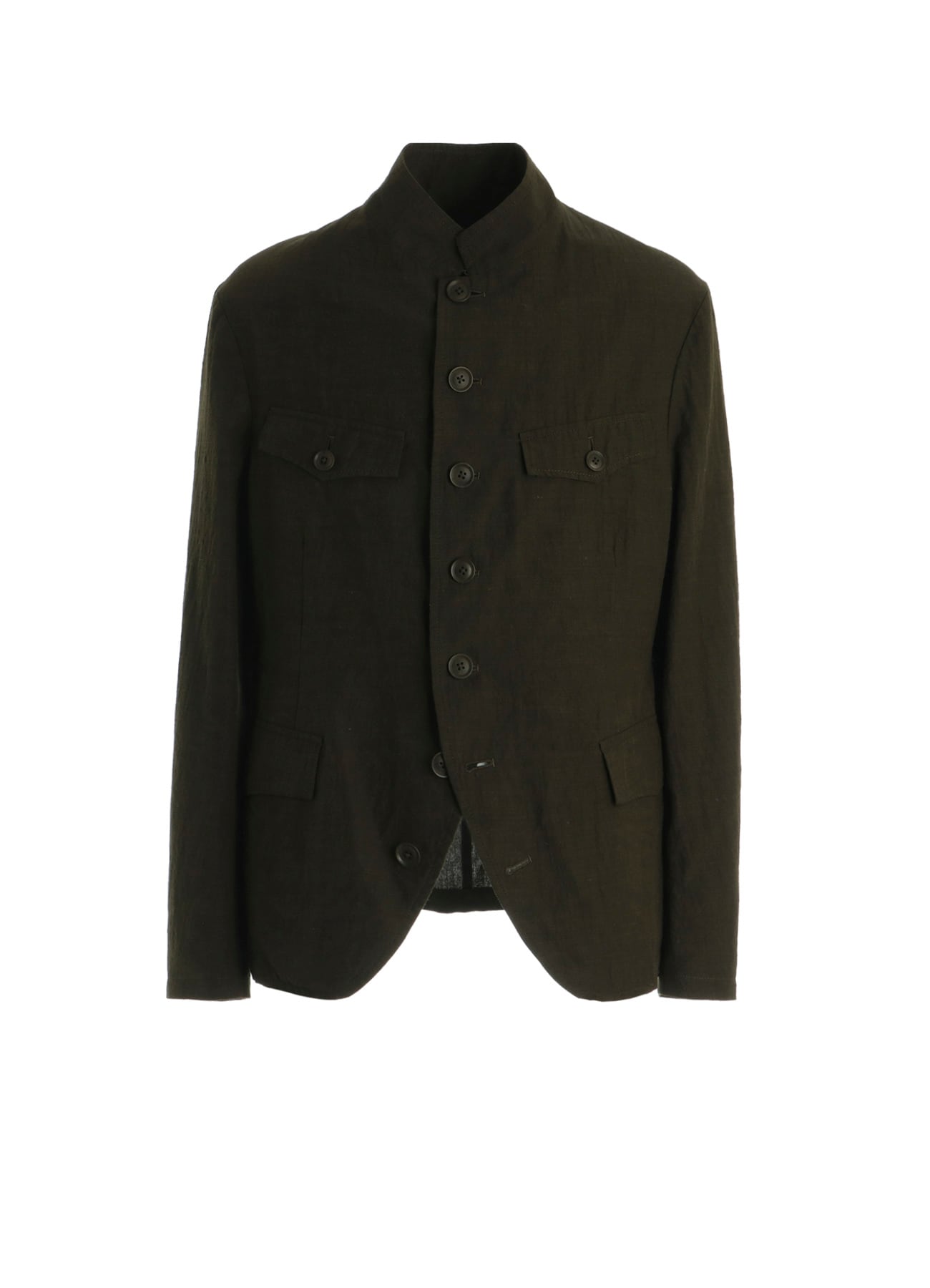Ground Y 2026 Spring/Summer Collection綿ウール×ウール麻の三者混素材を使用し、洗い加工でナチュラルなシワ感と凹凸を表現したショートジャケット。襟元のボタンを開閉することで、変化のあるスタイリングをお楽しみいただけます。