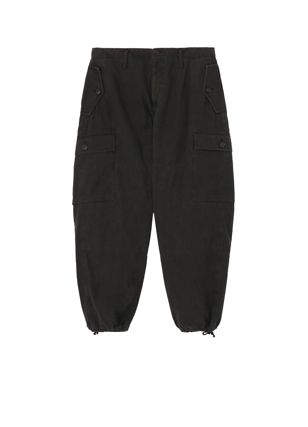 ワークウエアのラフなイメージが強いカーゴパンツをテーパードシルエットに仕立て、すっきりとお召しいただきやすいパンツに仕上げました。裾にはスピンドルが配され、シルエットの調節が可能です。生地には、オーガニックコットン糸を用いたコットンリップストップを採用。その生地を顔料染料で揉み込むように染色することで、下地の先染めの色相と顔料染料の色相が調和し、二浴染めならではの複雑な色合いを生み出しています。さらに染色後に洗い加工を施すことで、顔料特有のフェード感が加わり、表情豊かな生地に仕上げています。
