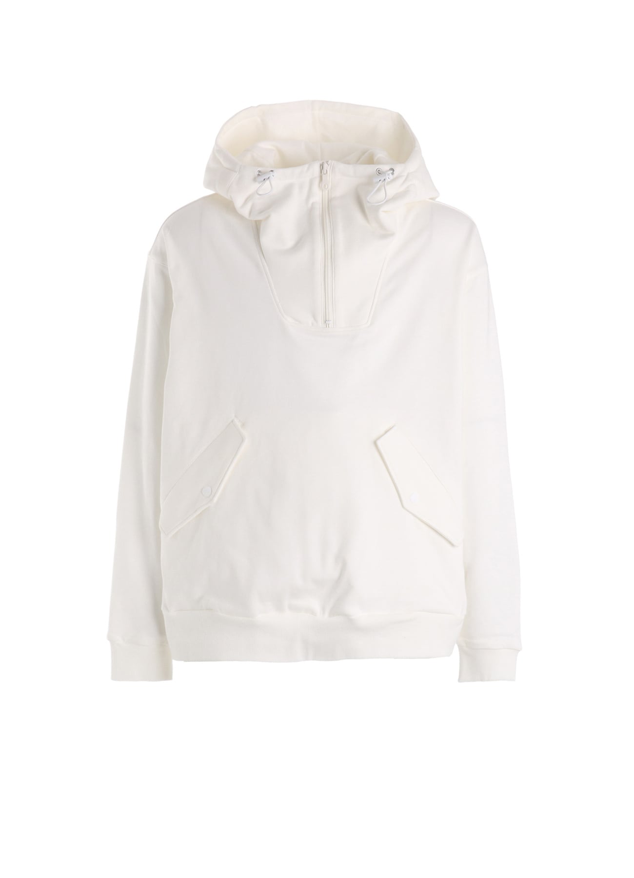 上までファスナーを閉めた際のスタンドカラーシルエットが特徴的な裏毛パーカ。左右に配されたフラップ付きポケットは、ハンドウォーマーとしても重宝します。