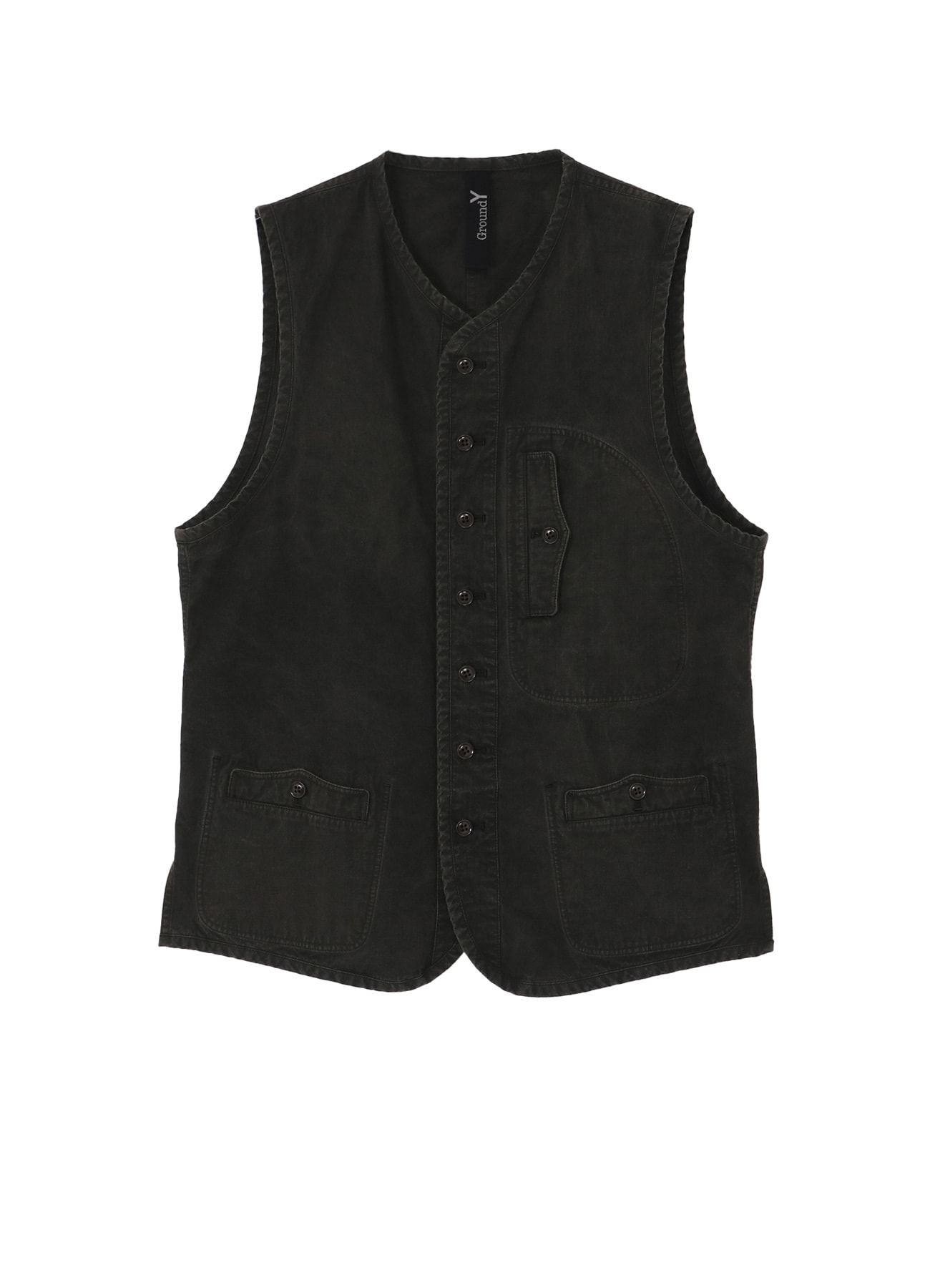 Ground Y 2026 Spring/Summer Collectionコットンリップストップパイピングベスト。フロントに配された3つのフラップポケットがデザインポイントになった、ゆったりとしたサイズ感のベストです。バックにはアジャスターベルトが配され、シルエットの調整をしてお召しいただけます。生地には、オーガニックコットン糸を用いたコットンリップストップを採用。その生地を顔料染料で揉み込むように染色することで、下地の先染めの色相と顔料染料の色相が調和し、二浴染めならではの複雑な色合いを生み出しています。さらに染色後に洗い加工を施すことで、顔料特有のフェード感が加わり、表情豊かな生地に仕上げています。