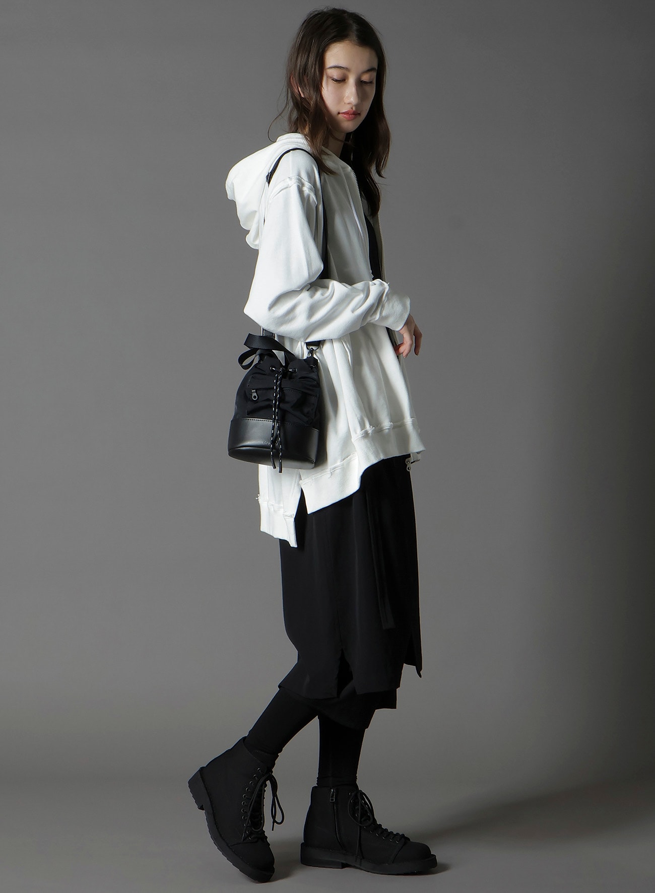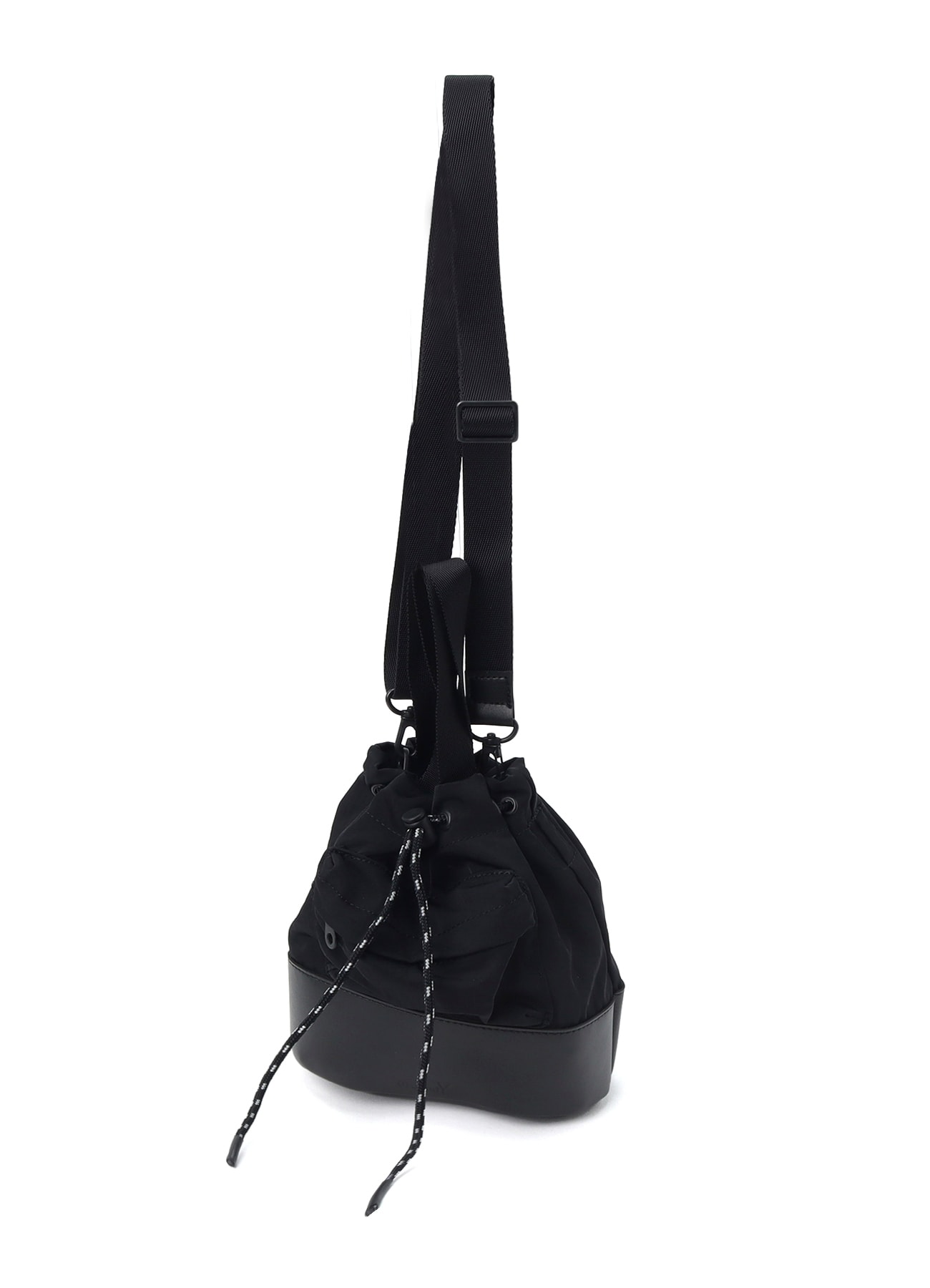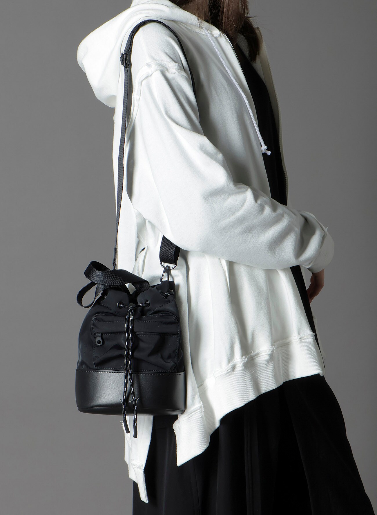 Ground Y 2025-26Autumn/Winter Collectionモードカジュアルなデザインの小ぶりなショルダーバッグです。便利な前ポケット収納付きで、実用性も高いアイテムです。手持ちでもショルダーでもお使いいただける、2WAY仕様です。シワ加工を施した味のあるナイロン素材を用いた、デイリー使いにおすすめのアイテムです。本体の下部分の切り替えは、サスティナビリティの観点から丈夫な特殊不織布を用いて作られた人工皮革を使用しています。