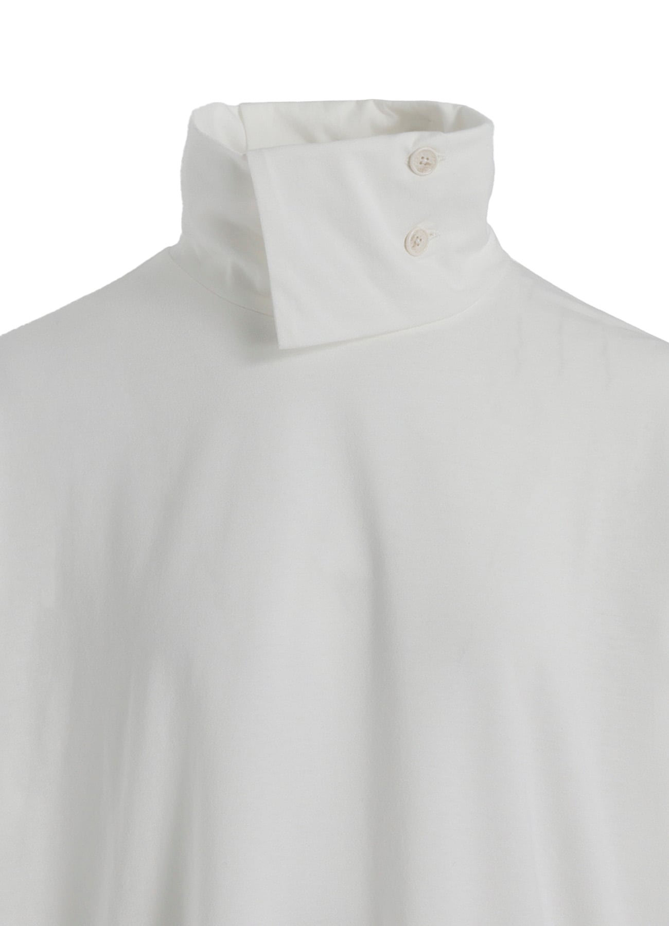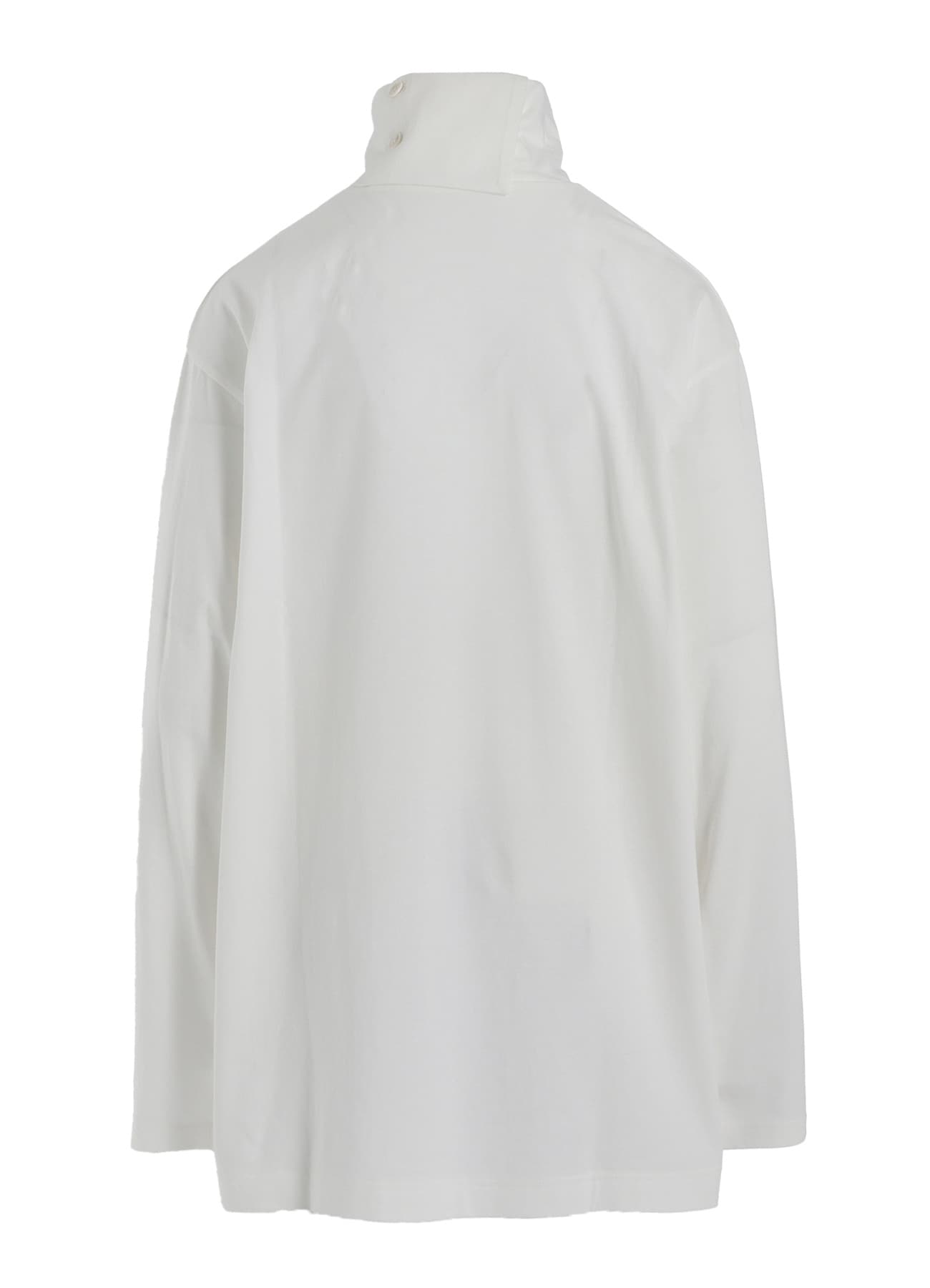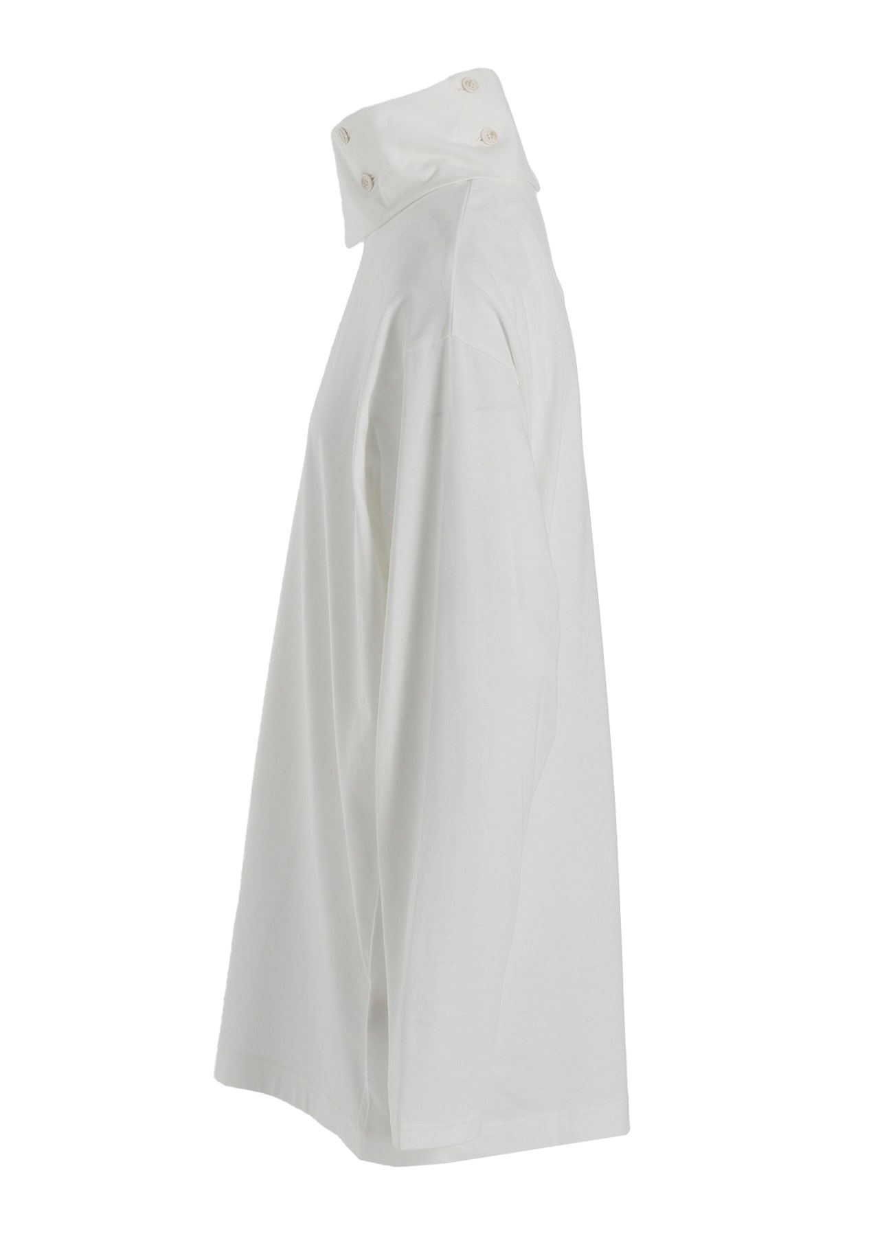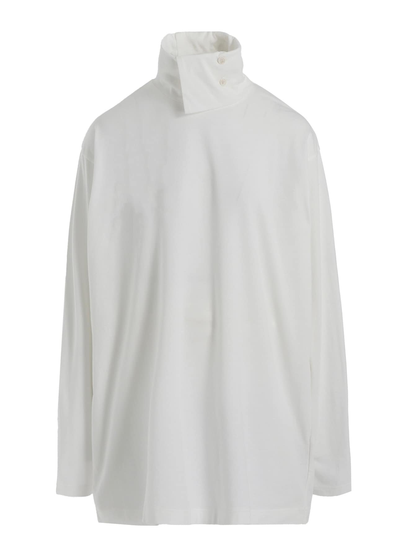 Ground Y 2025-26Autumn/Winter Collection着丈の長い定番タートルネック長袖Tシャツです。衿が左右で段違いのアシンメトリーなデザインになっており、ボタンの開閉で表情を変えることができます。きめ細やかな織り目とハリとコシが特徴的な定番コットン天竺を使用しています。上質で柔らかく、自然なドレープをお楽しみいただけます。