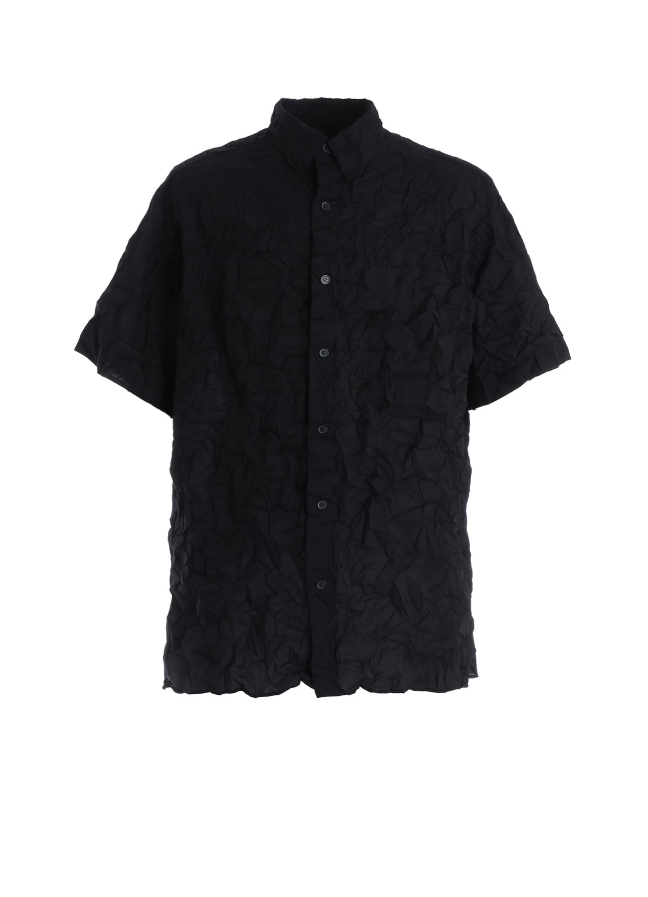 シワ加工を施した生地感が魅力的な台襟半袖シャツ。ヨークサイドにギャザーが配された開襟シャツは、可動域が広がり、ストレスなくお召しいただけます。60/-のスパン糸を経糸緯糸に使用し、綿のようなナチュラルな表情を持つポリエステル生地にシワ加工を施すことで、奥行きのある立体的な表情の生地に仕上げています。軽やかな着心地で、シーズンを問わずロングシーズン着用可能。一枚でスタイリングの主役になるアイテムで、カジュアルからモードまで幅広いスタイリングに対応します。