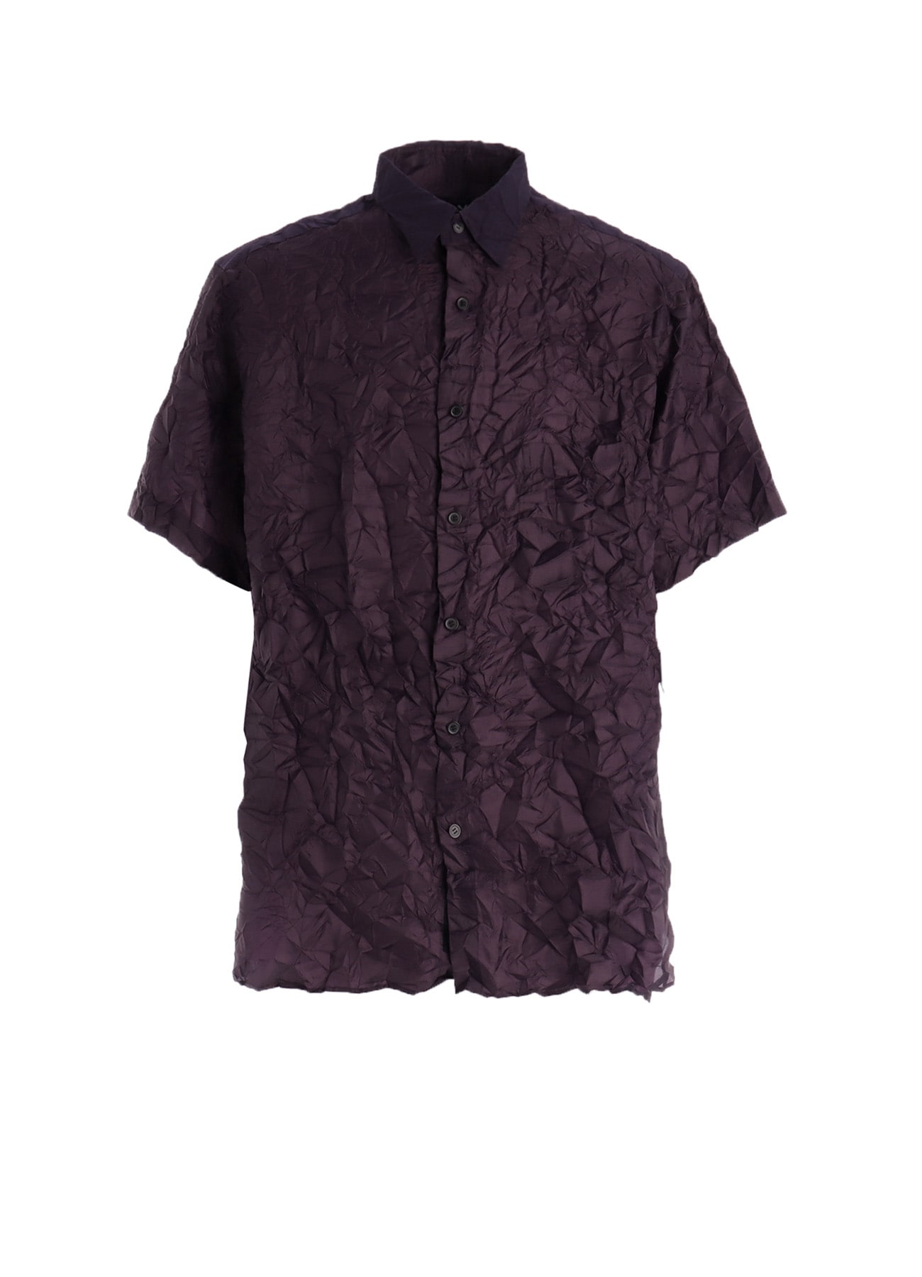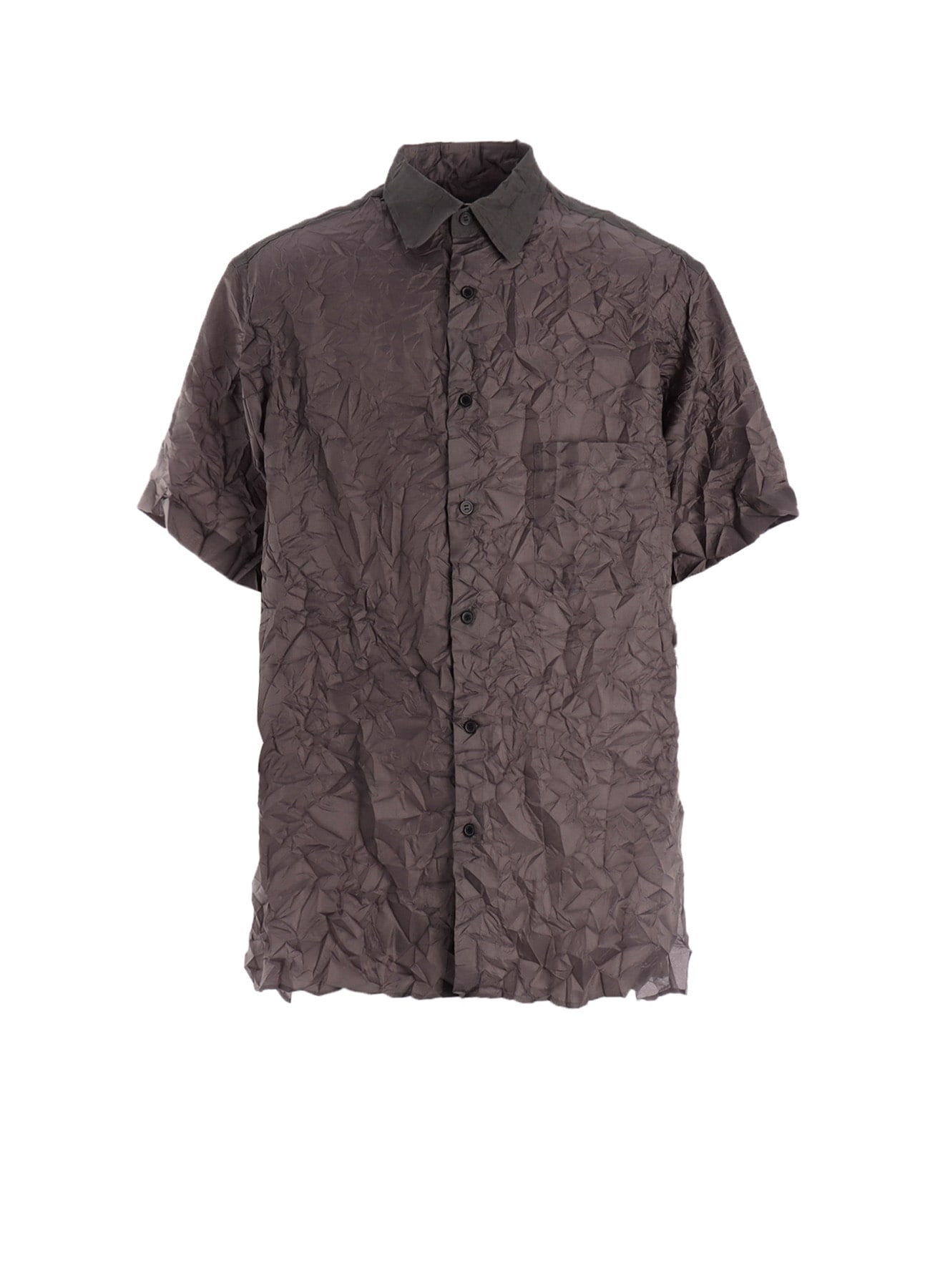 Ground Y BEYOND BORDERS-SHIWA Collection-シワ加工を施した生地感が魅力的な台襟半袖シャツ。ヨークサイドにギャザーが配された開襟シャツは、可動域が広がり、ストレスなくお召しいただけます。上品な光沢のあるポリエステルタフタ生地にシワ加工を施すことで、奥行きのある立体的な表情の生地に仕上げています。軽やかな着心地で、シーズンを問わずロングシーズン着用可能。一枚でスタイリングの主役になるアイテムで、カジュアルからモードまで幅広いスタイリングに対応します。商品は、オリジナルの洗濯ネットに入った状態でお届けします。