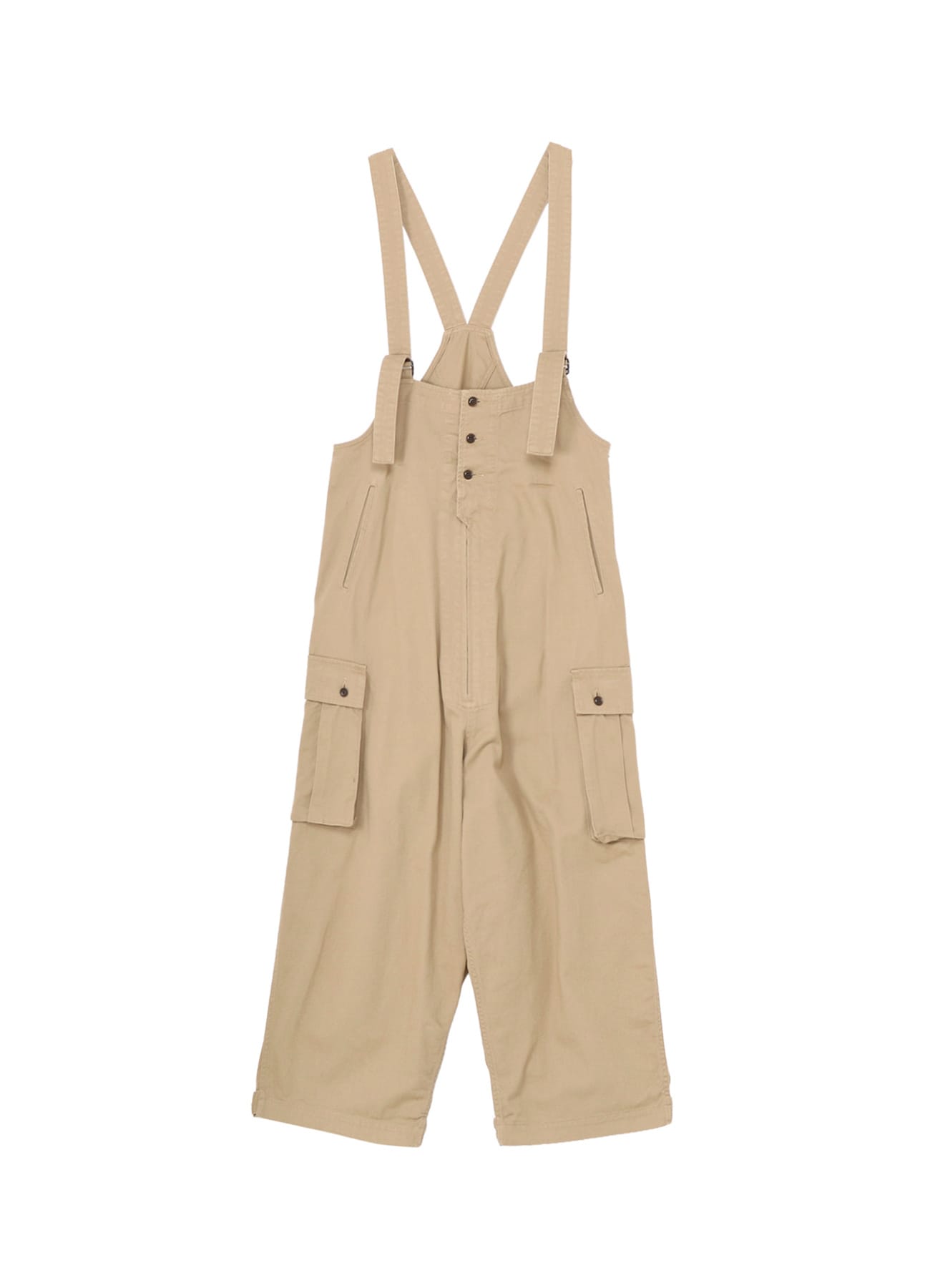 カツラギ生地を使用したワークオーバーオール。太い糸で織られた綾織物で、綾目と呼ばれる斜めの線が表面に現れるのが特徴です。綾部分が45度以上と急角度のため、水滴や雨粒が流れ落ちやすくワークウエアに適した丈夫な生地です。