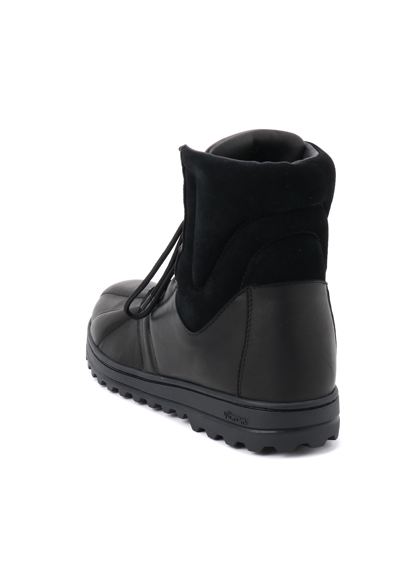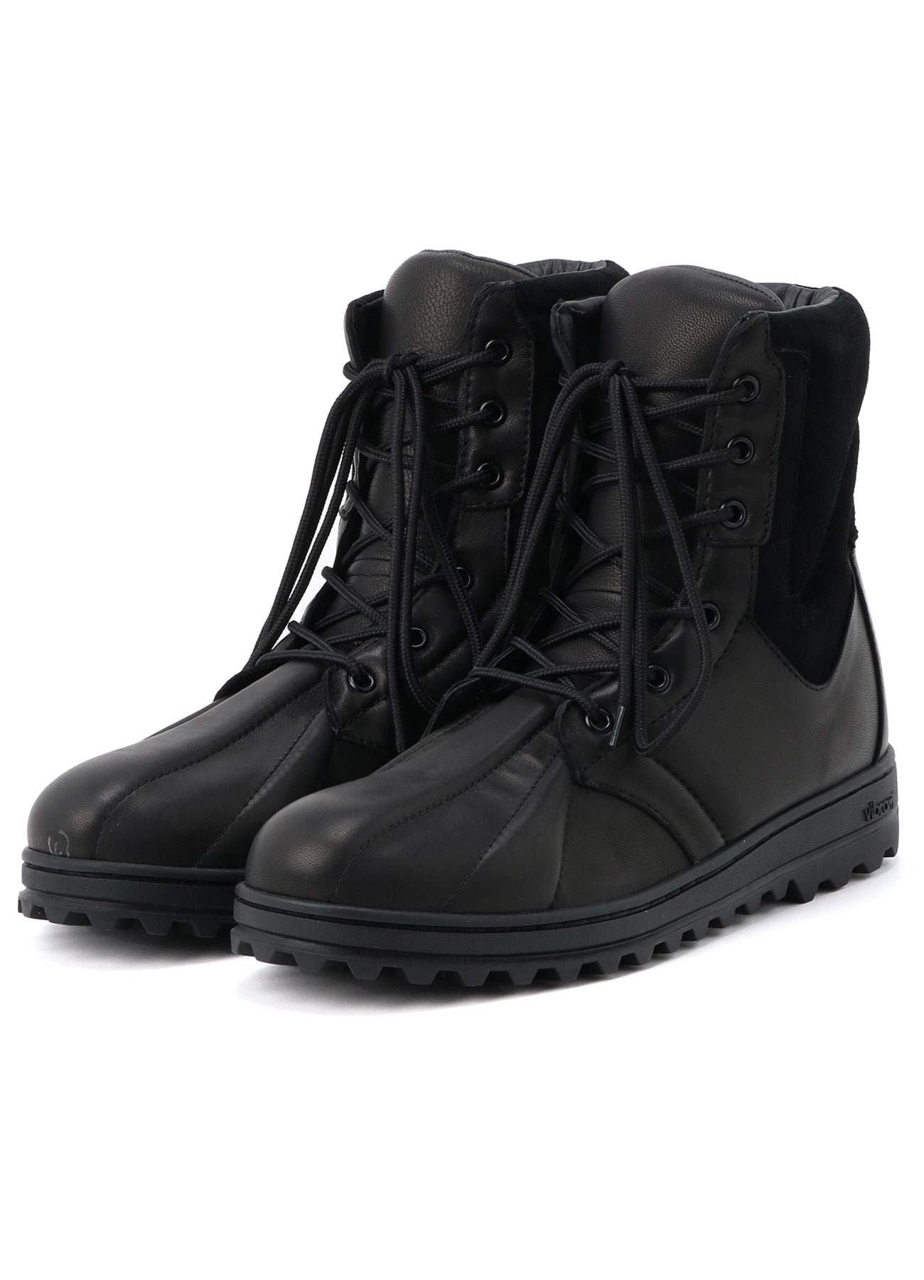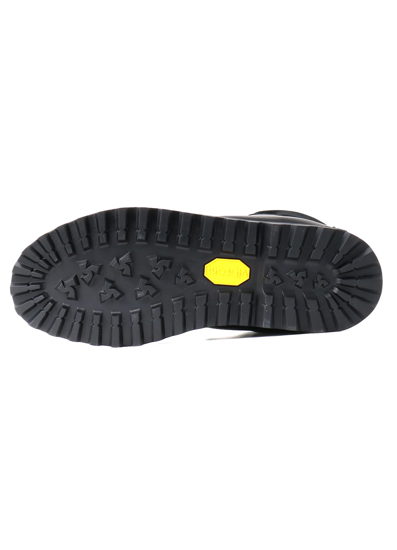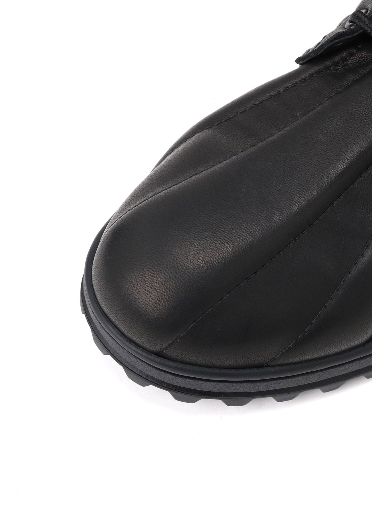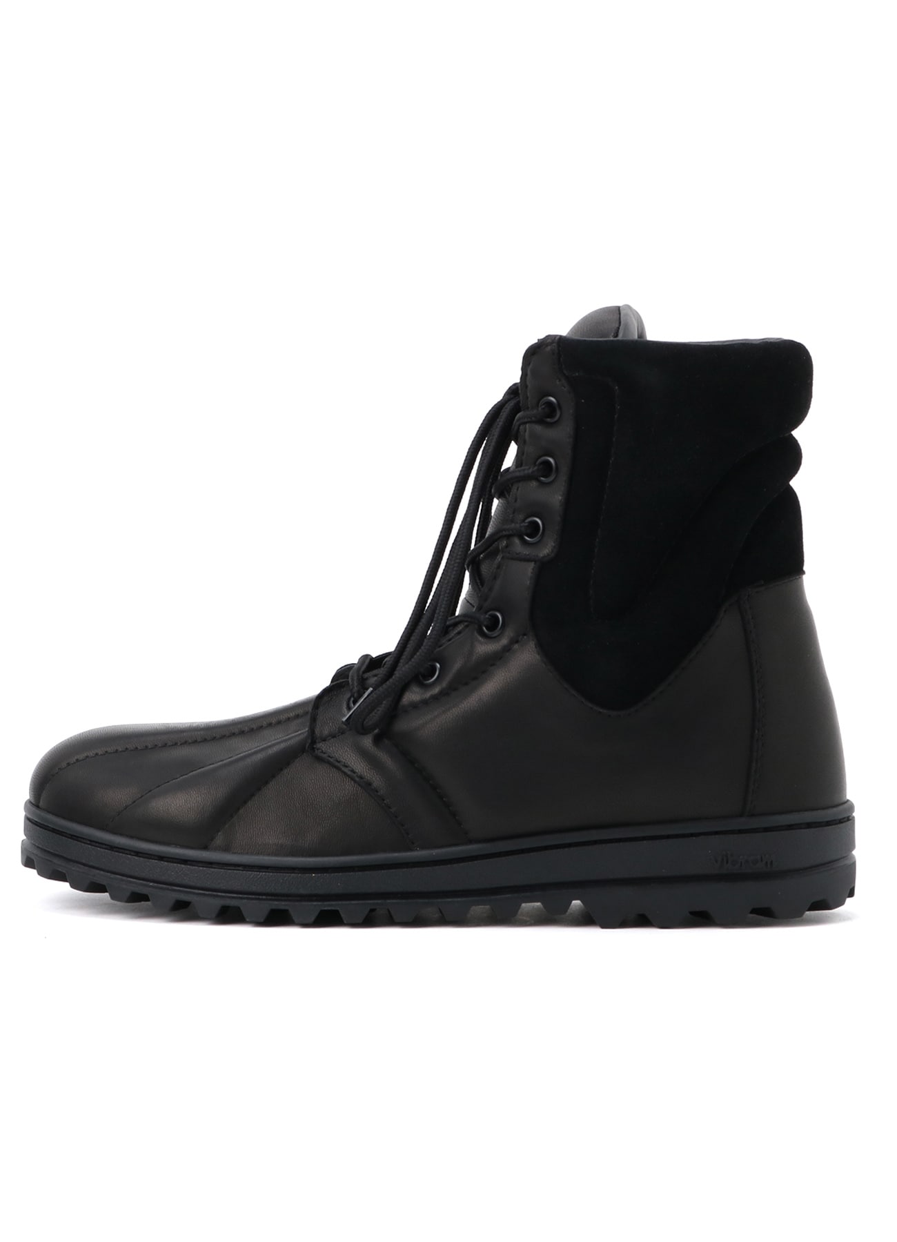 Yohji Yamamoto POUR HOMME A/W 2025-26 COLLECTION LOOK4,7,12,22,25で登場したミリタリーブーツ。アッパーはソフトなシープレザー、部分的に牛革を使用しています。ウレタンを挟みこんでステッチをかけることで凹凸を表現しています。