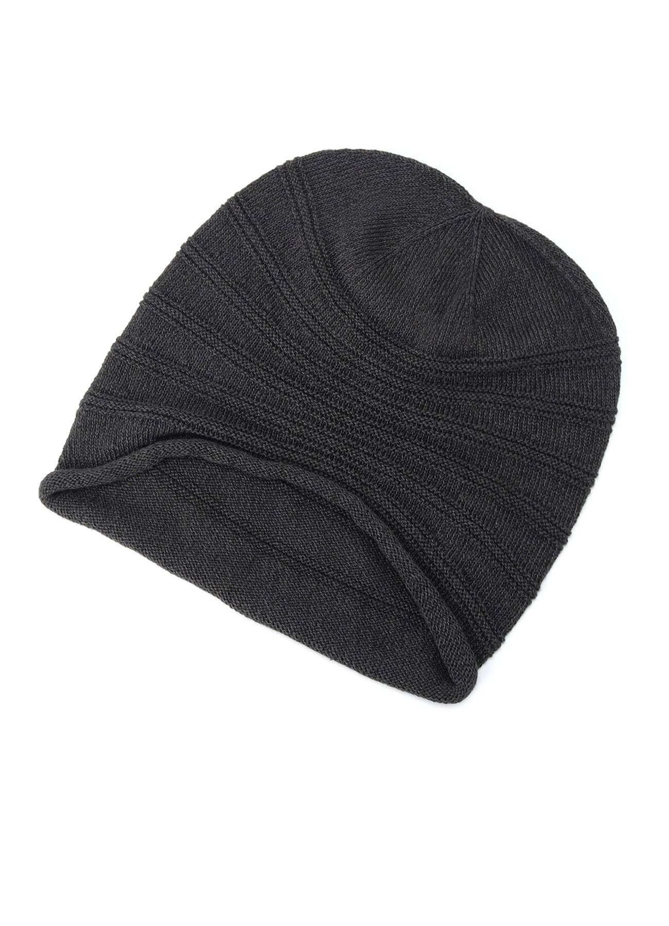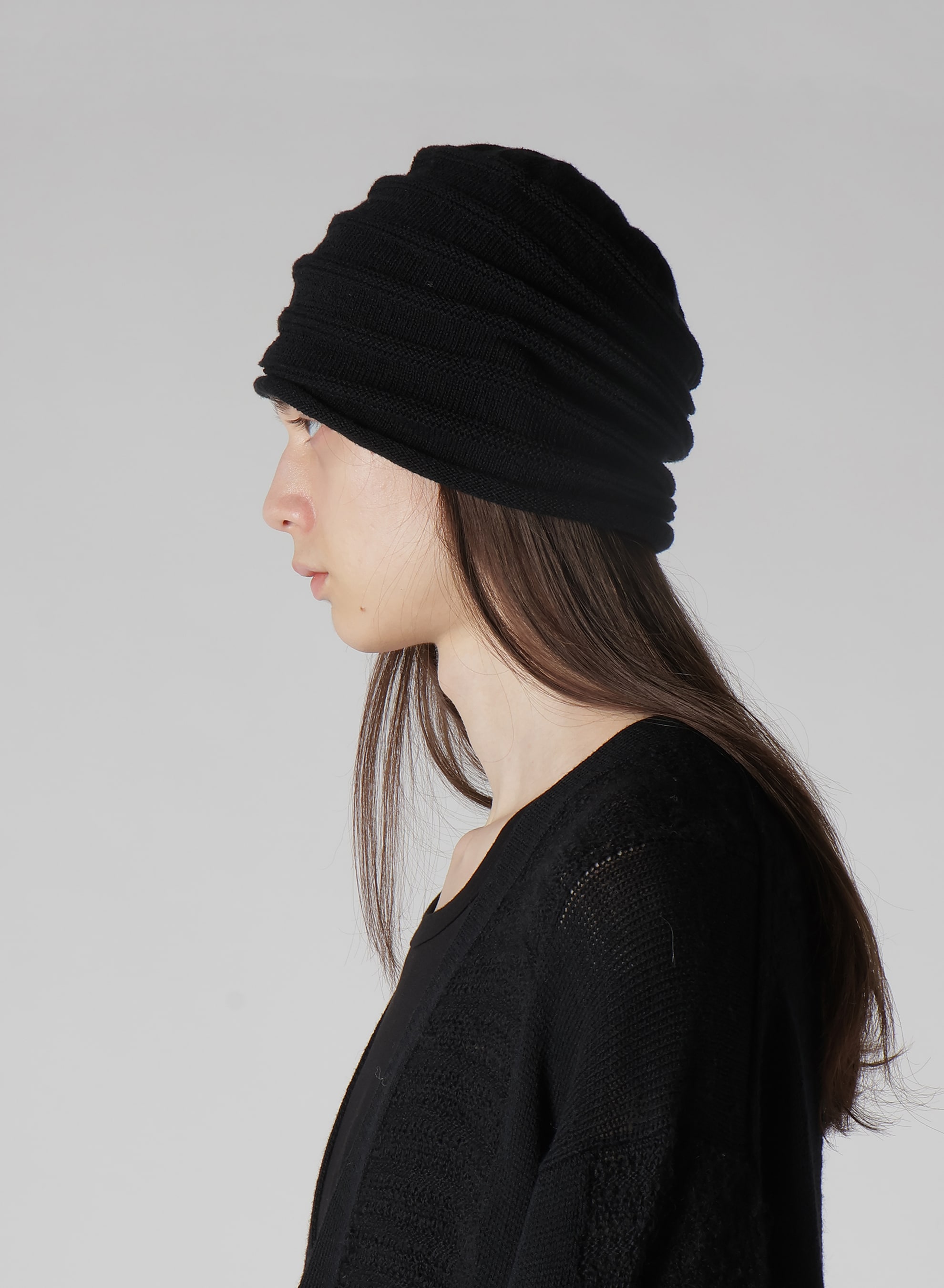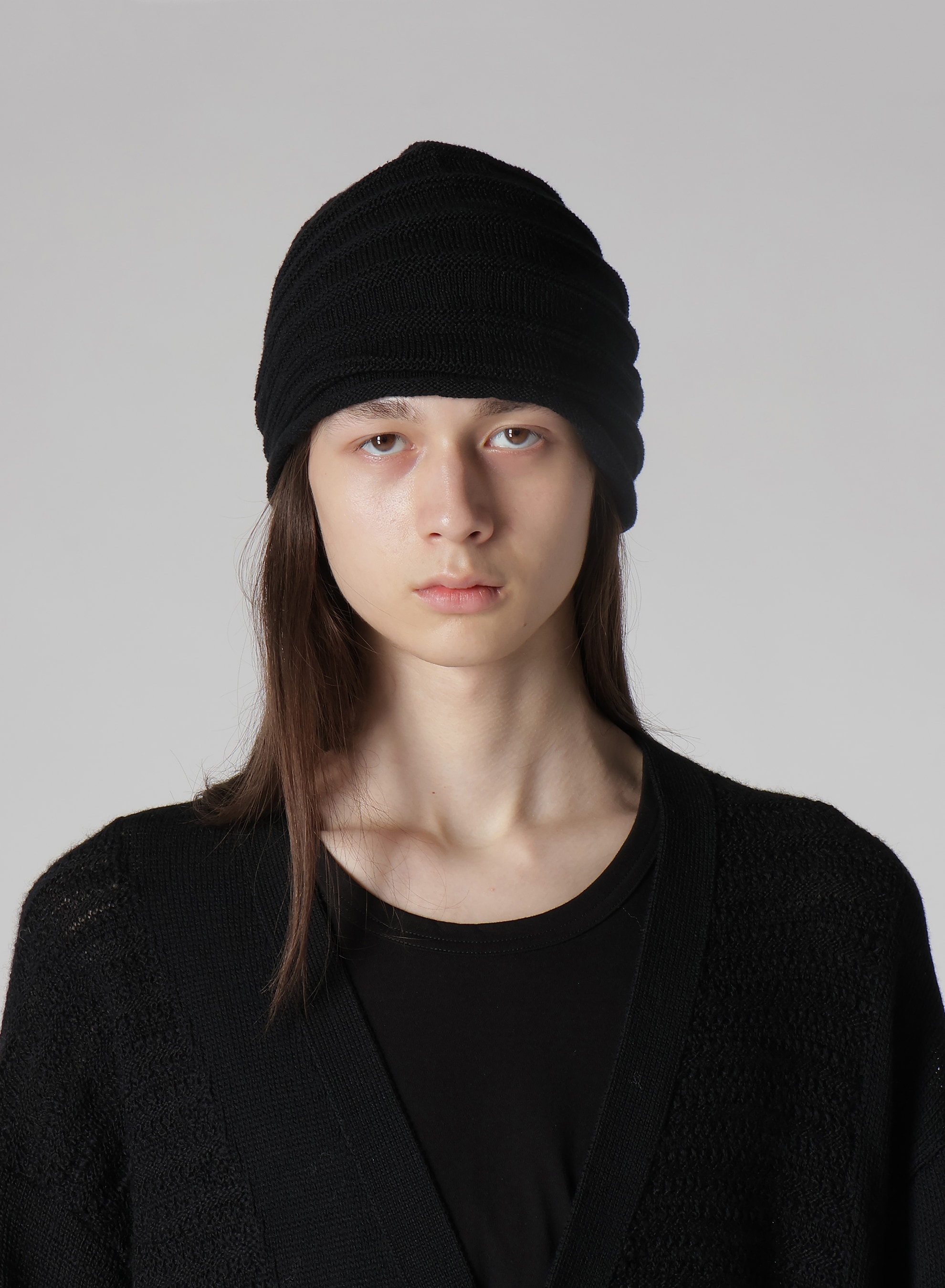 シルクコットン糸を使用しボーダー状に地柄編みを施したニットキャップ。裾部分をロールアップさせたデザインです。