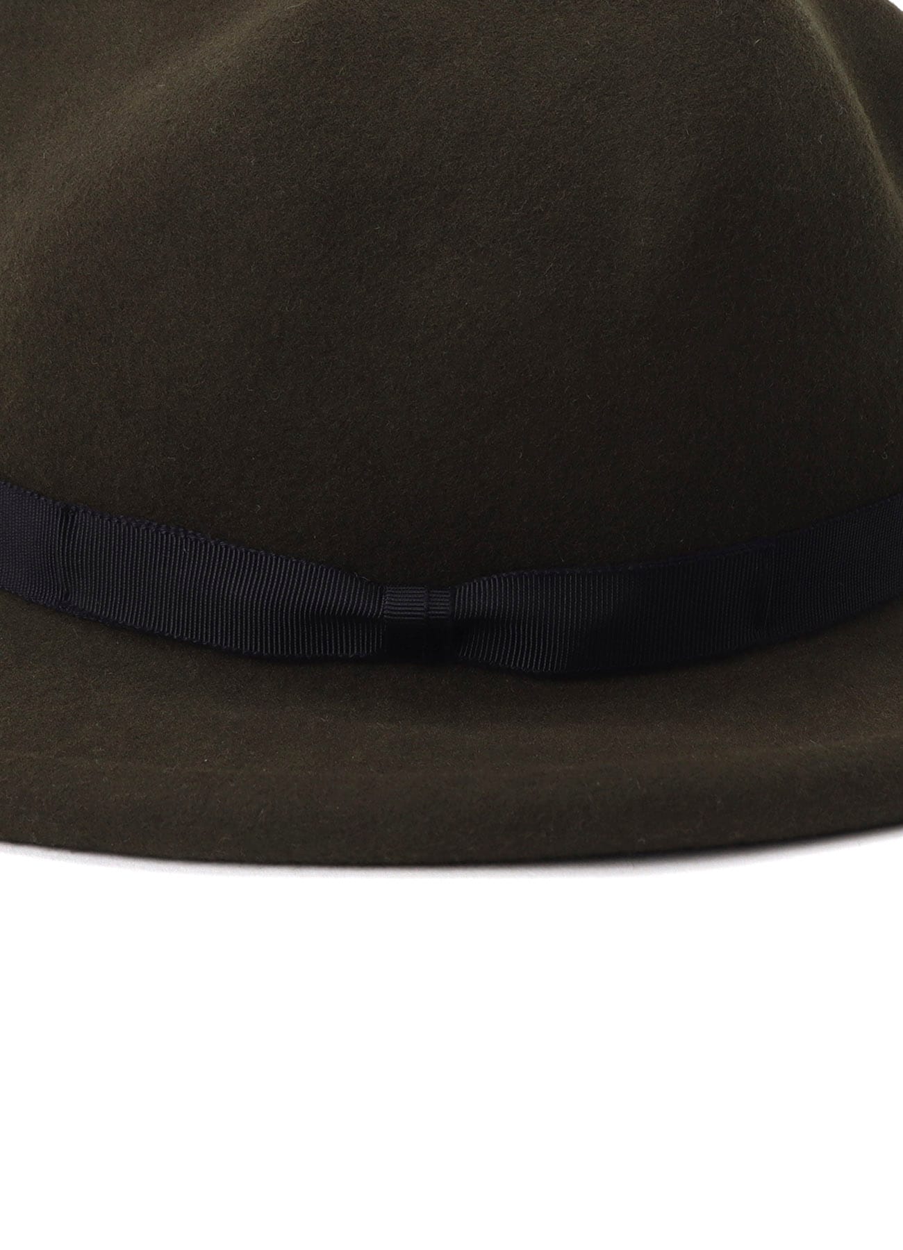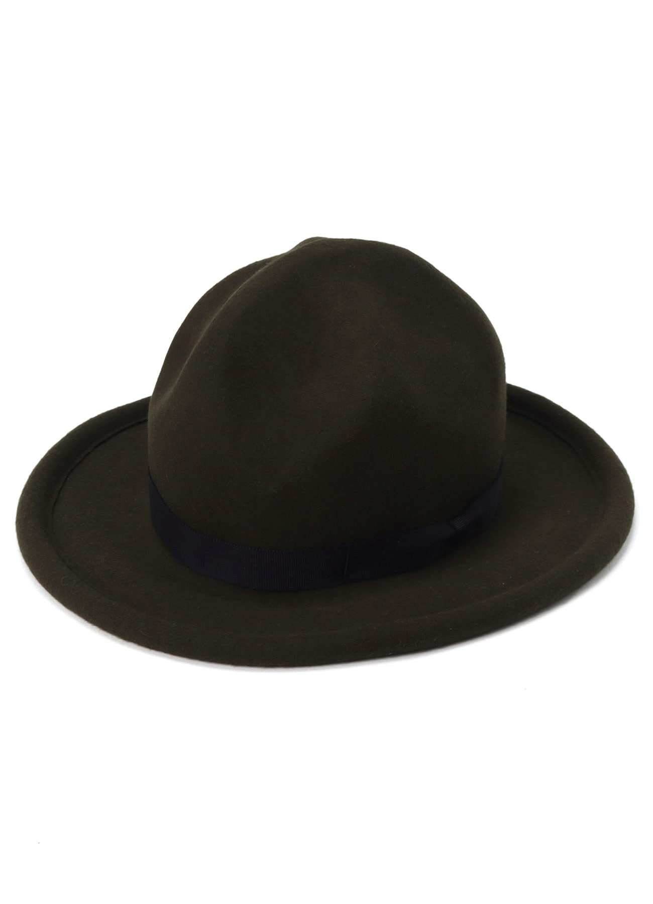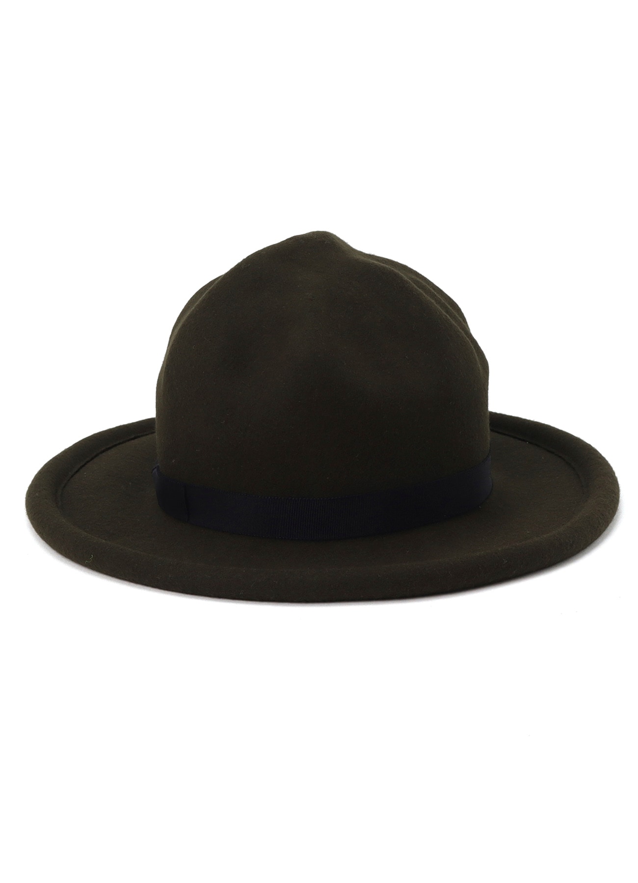 ウールフェルトを使用したマウンテンハット。やや低めにクラウンの高さがデザインされています。ブリムエッジにチューブ状のウレタンを入れ、ロールアップしています。