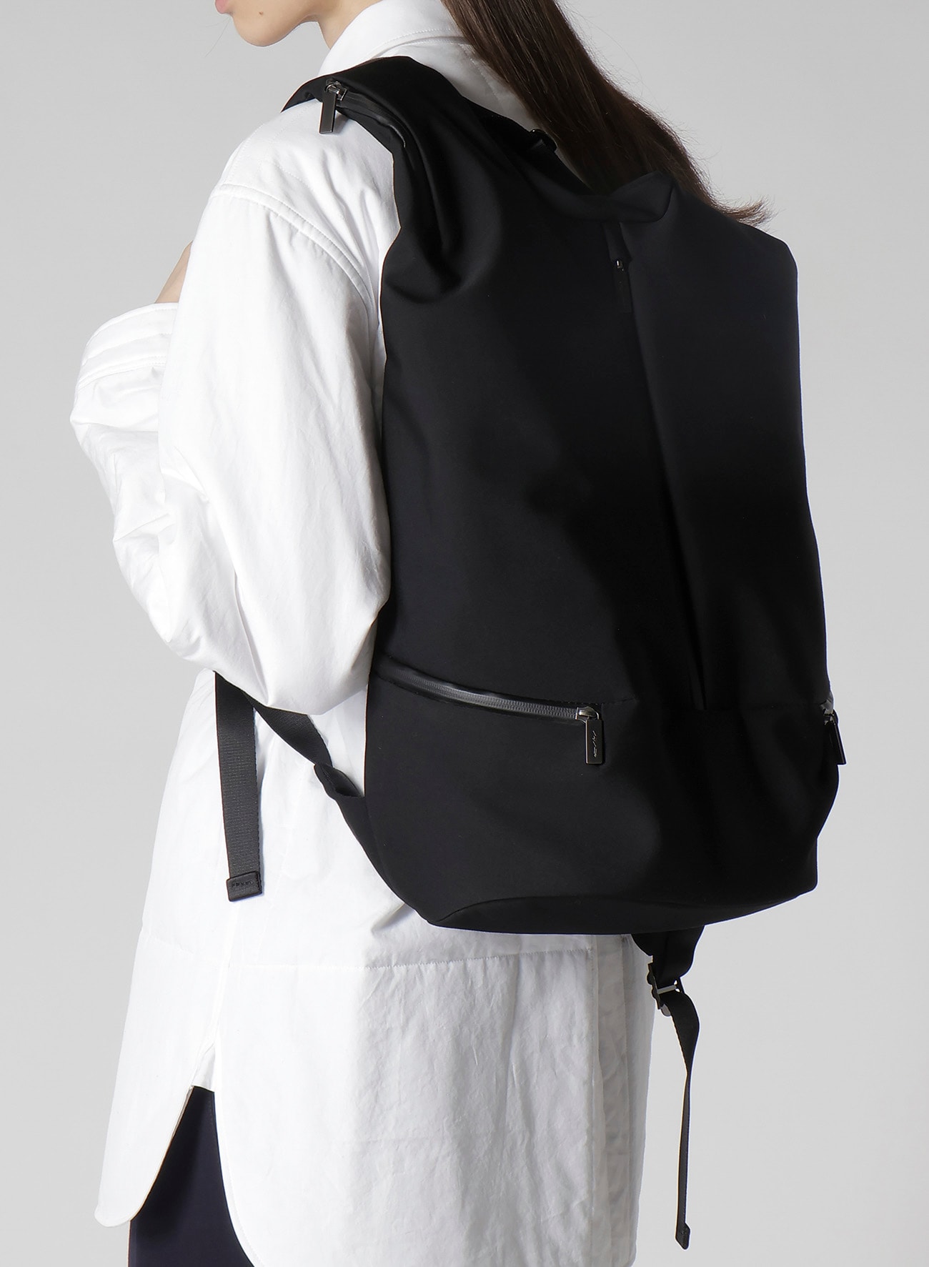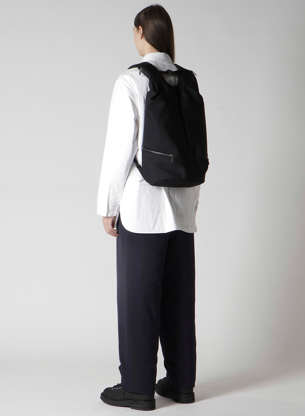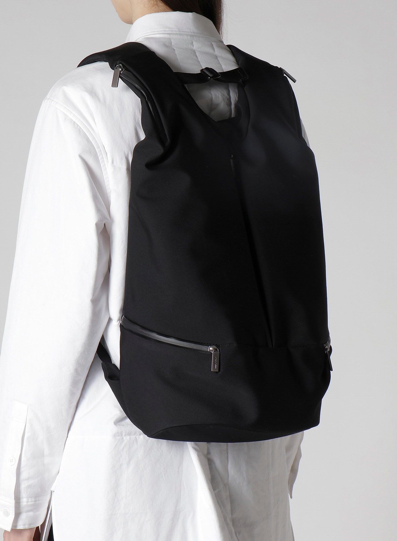 ウールギャバジン生地を使用したセンタージップのバックパック。ボンディング加工が施されしっかりとした生地感と、特徴的なファスナーの配置による洗練されたシルエットのデザインです。
