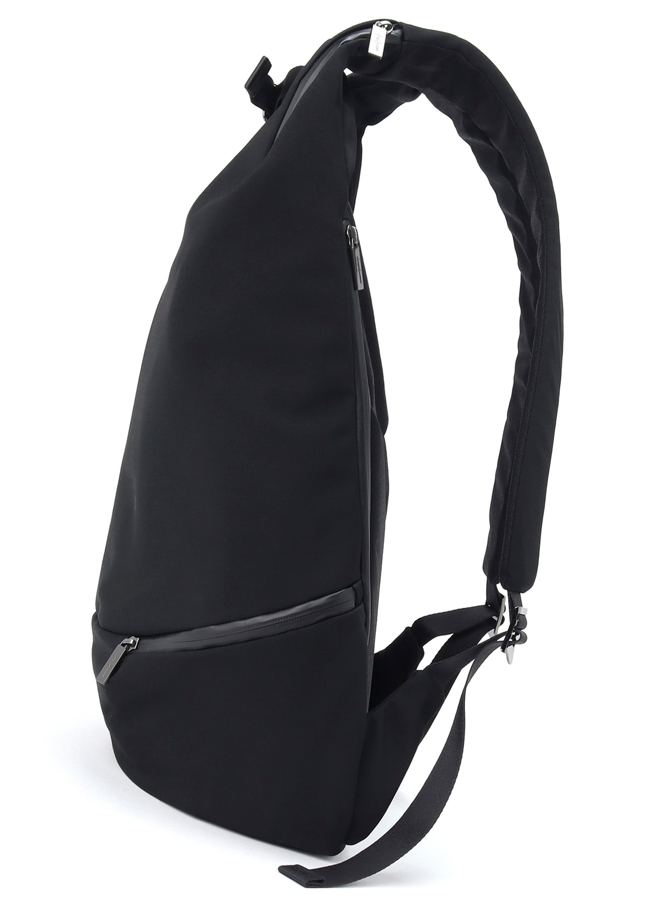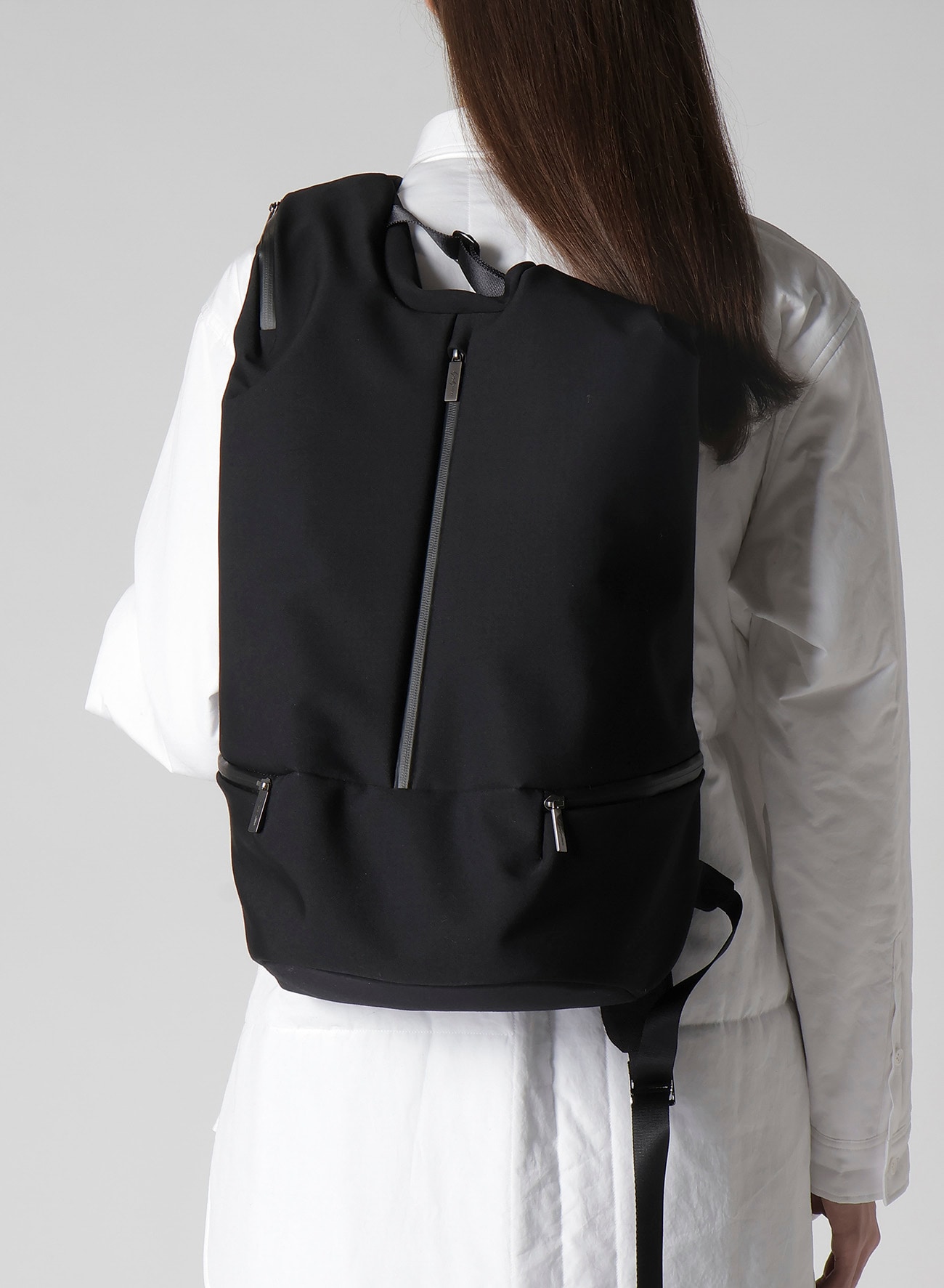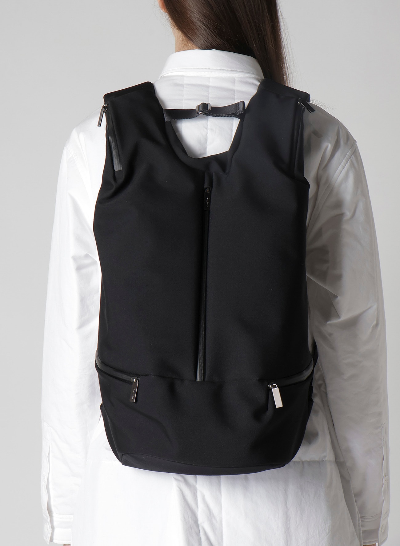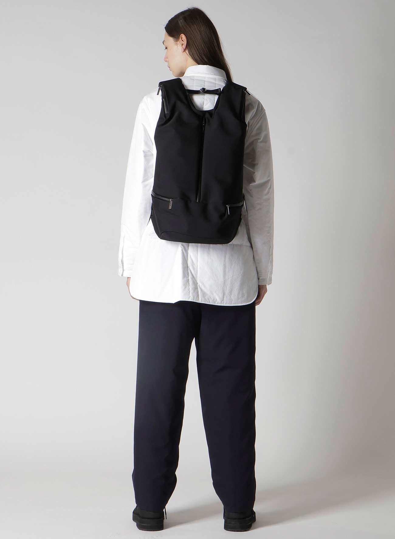ウールギャバジン生地を使用したセンタージップのバックパック。ボンディング加工が施されしっかりとした生地感と、特徴的なファスナーの配置による洗練されたシルエットのデザインです。