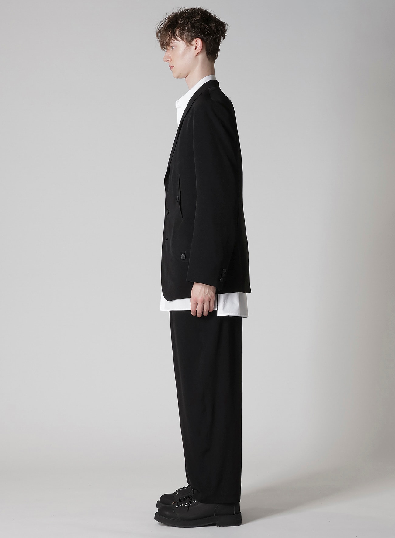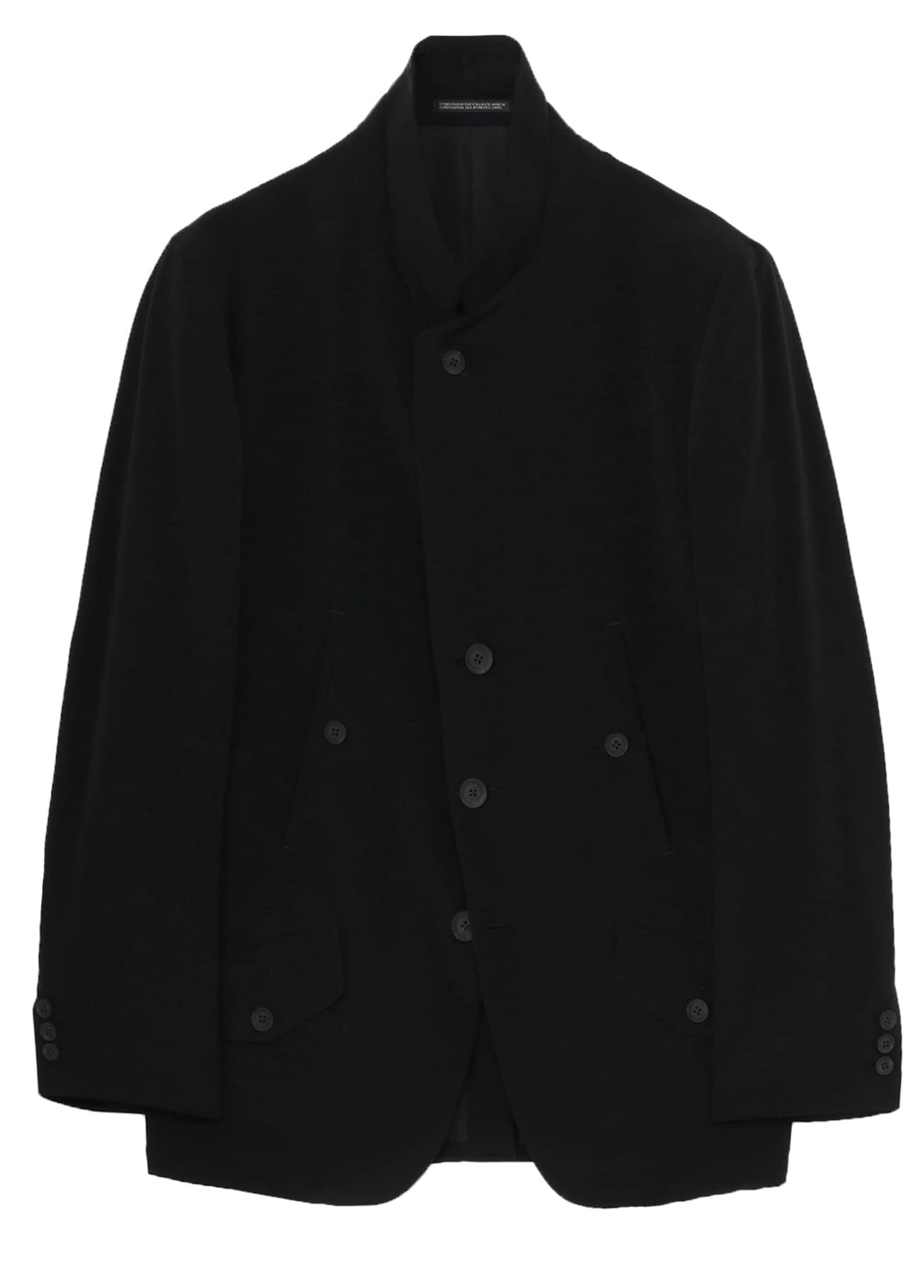 トリアセテート・ポリエステルのタキシード素材を使用したフラップポケット付き3つ釦ジャケット。マイルドな光沢感と高級感を持ち合わせたYohji Yamamotoの定番素材です。ヨコ糸に強撚糸を使用して密に織った平織物で、表情豊かなドレープ感が特徴です。