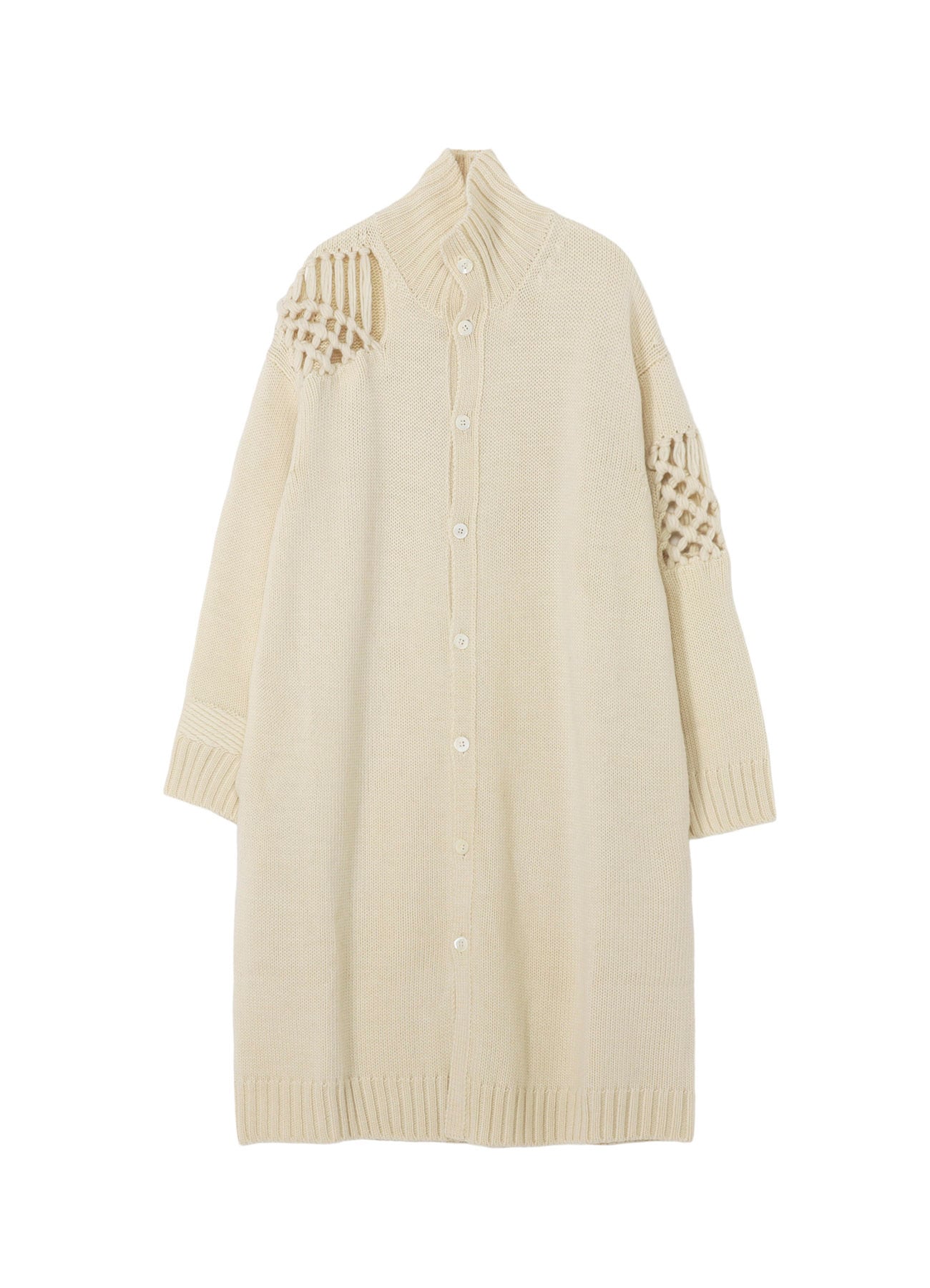 原料にウルグアイウールを使用した部分マクラメ編みタートルネックカーディガン。精紡交撚で紡績されたロービング素材です。毛羽立ちが少なく丸みがあり目が立ちやすく、部分的に手編みでマクラメ編みを入れたデザインになっています。