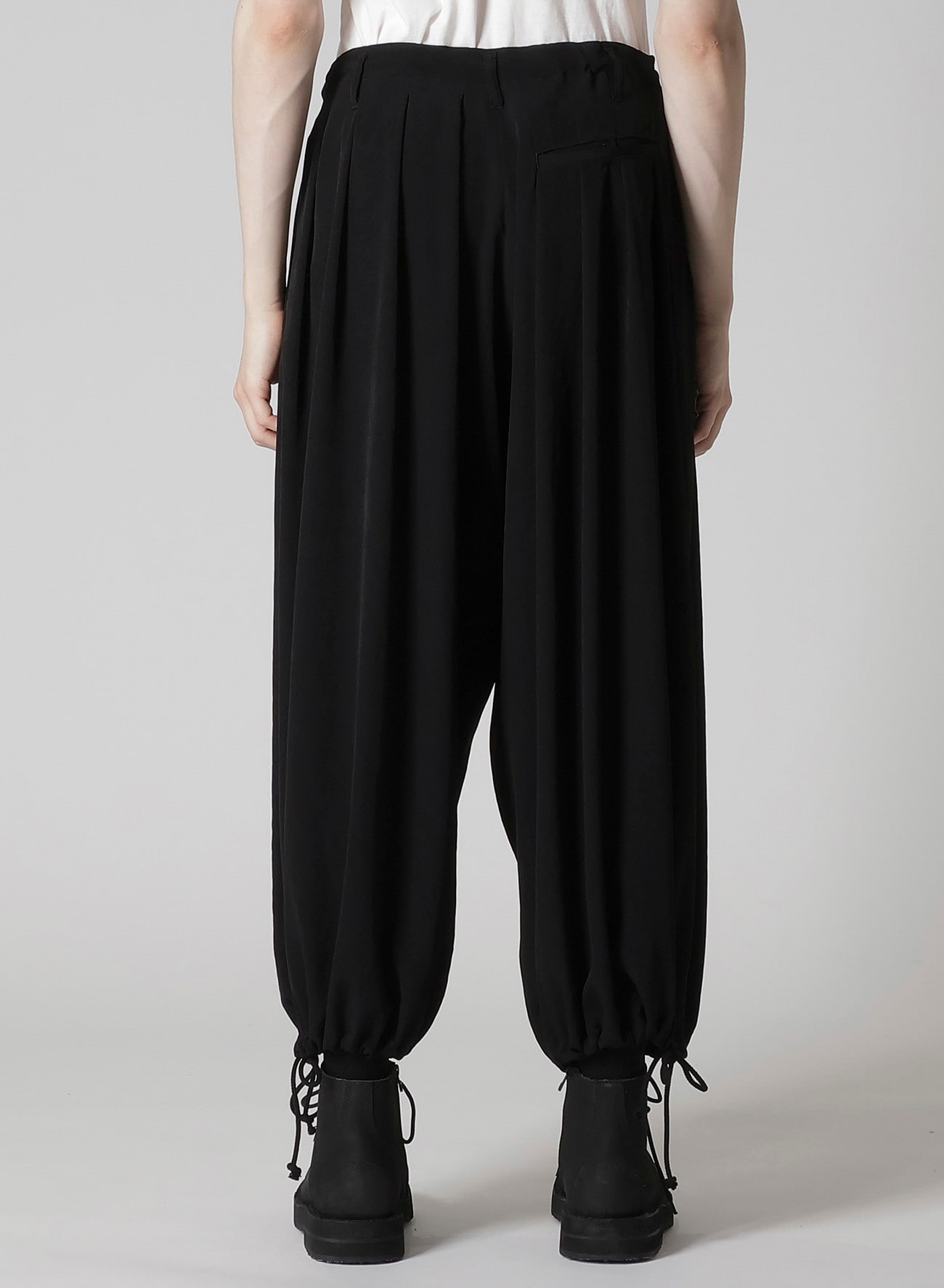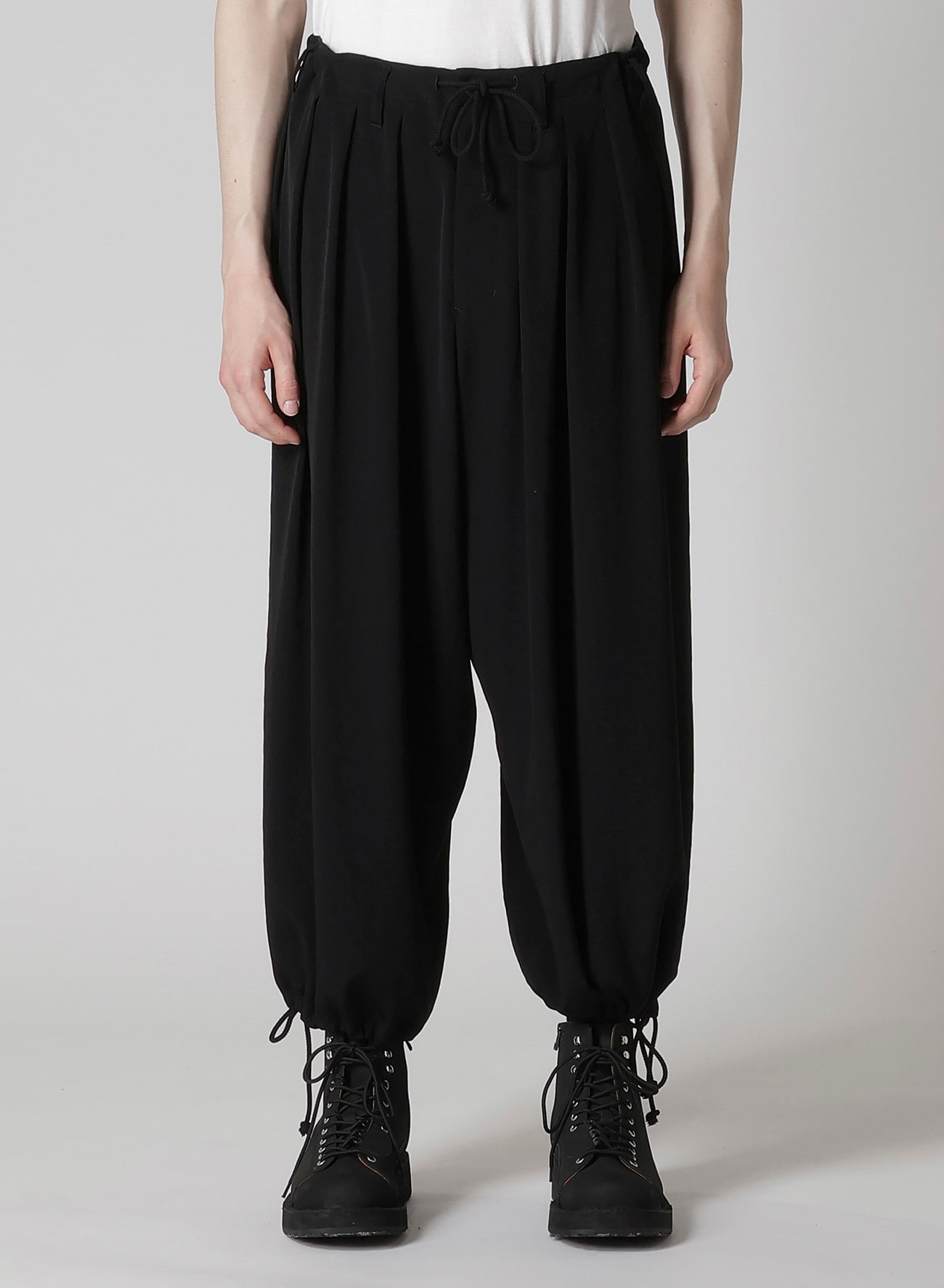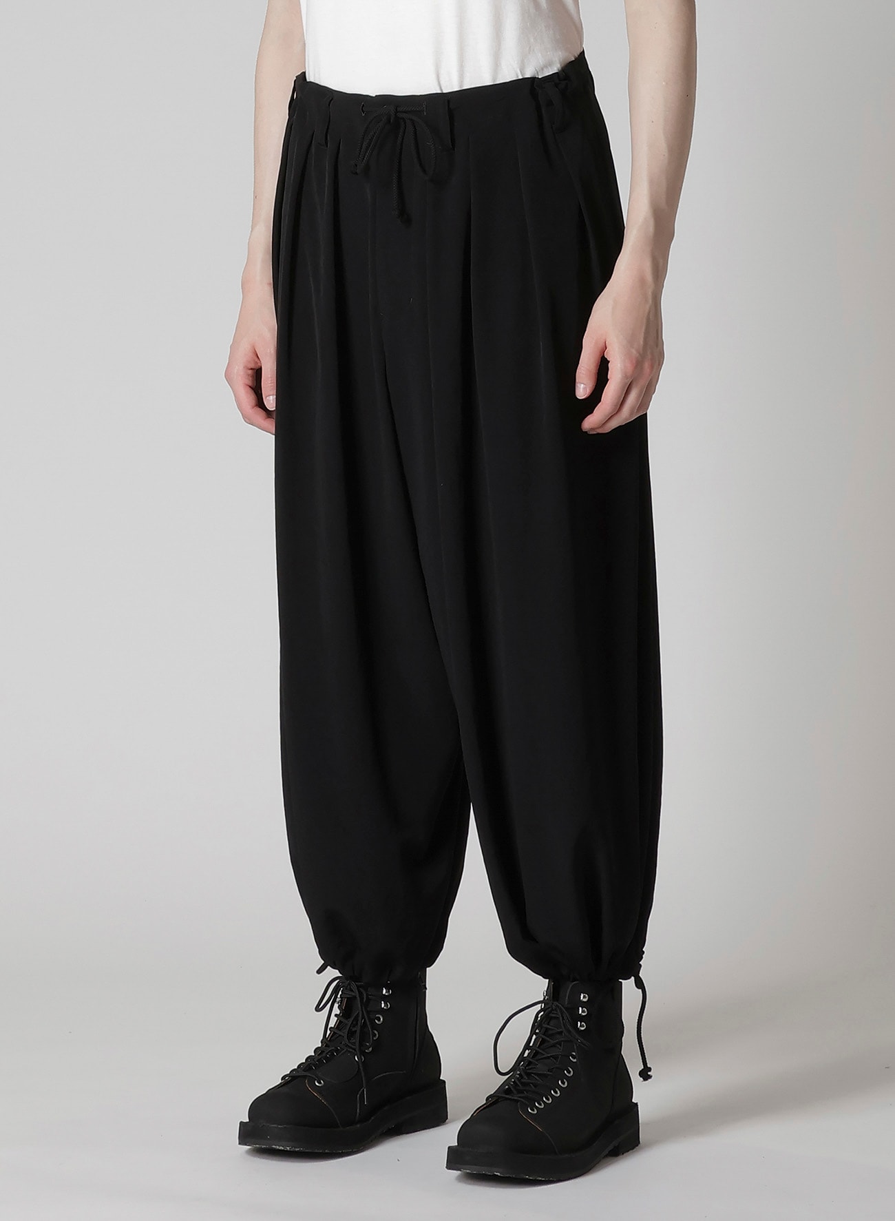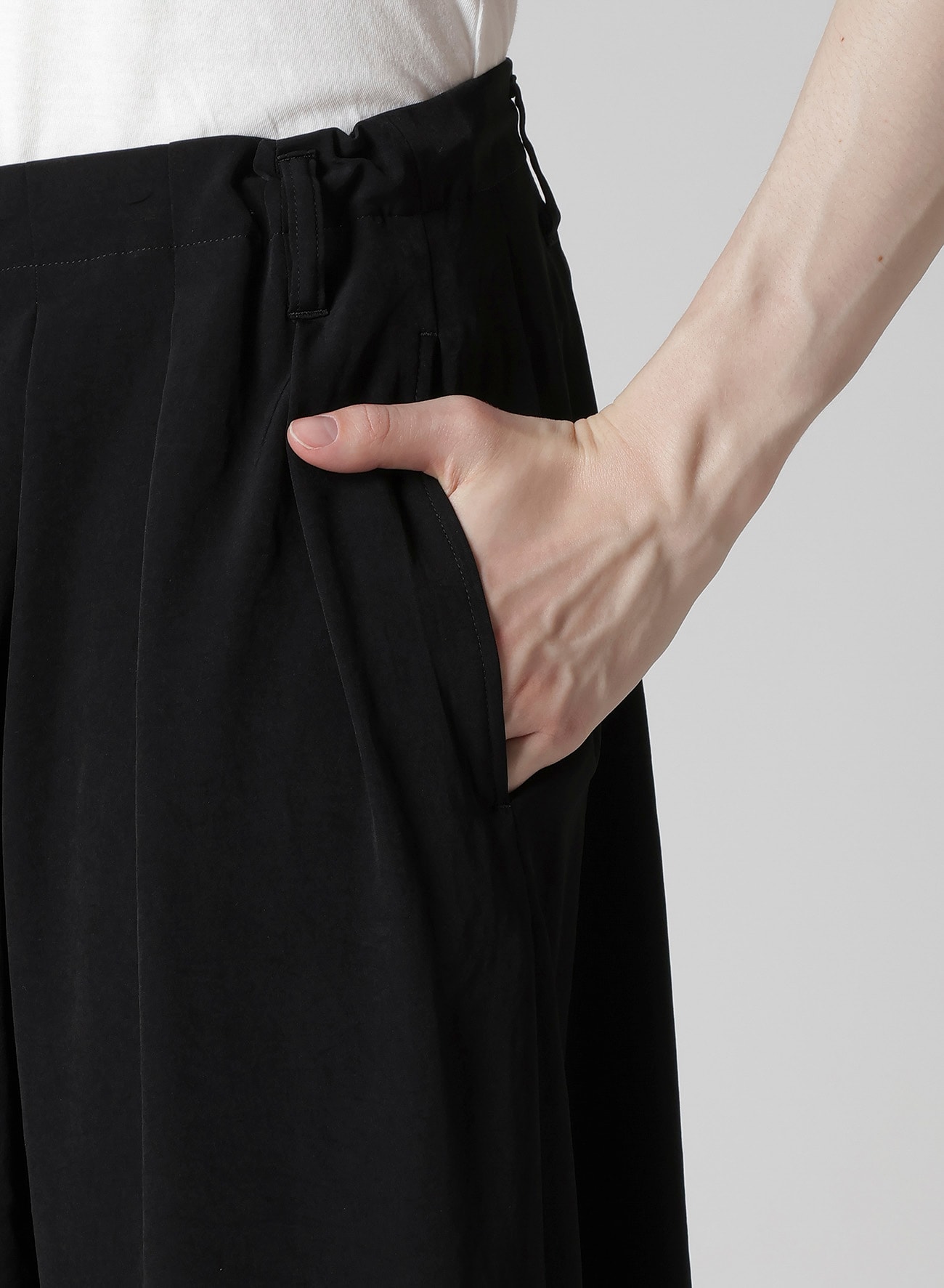 トリアセテート・ポリエステルのタキシード素材を使用した定番バルーンパンツ。マイルドな光沢感と高級感を持ち合わせたYohji Yamamotoの定番素材です。ヨコ糸に強撚糸を使用して密に織った平織物で、表情豊かなドレープ感が特徴です。