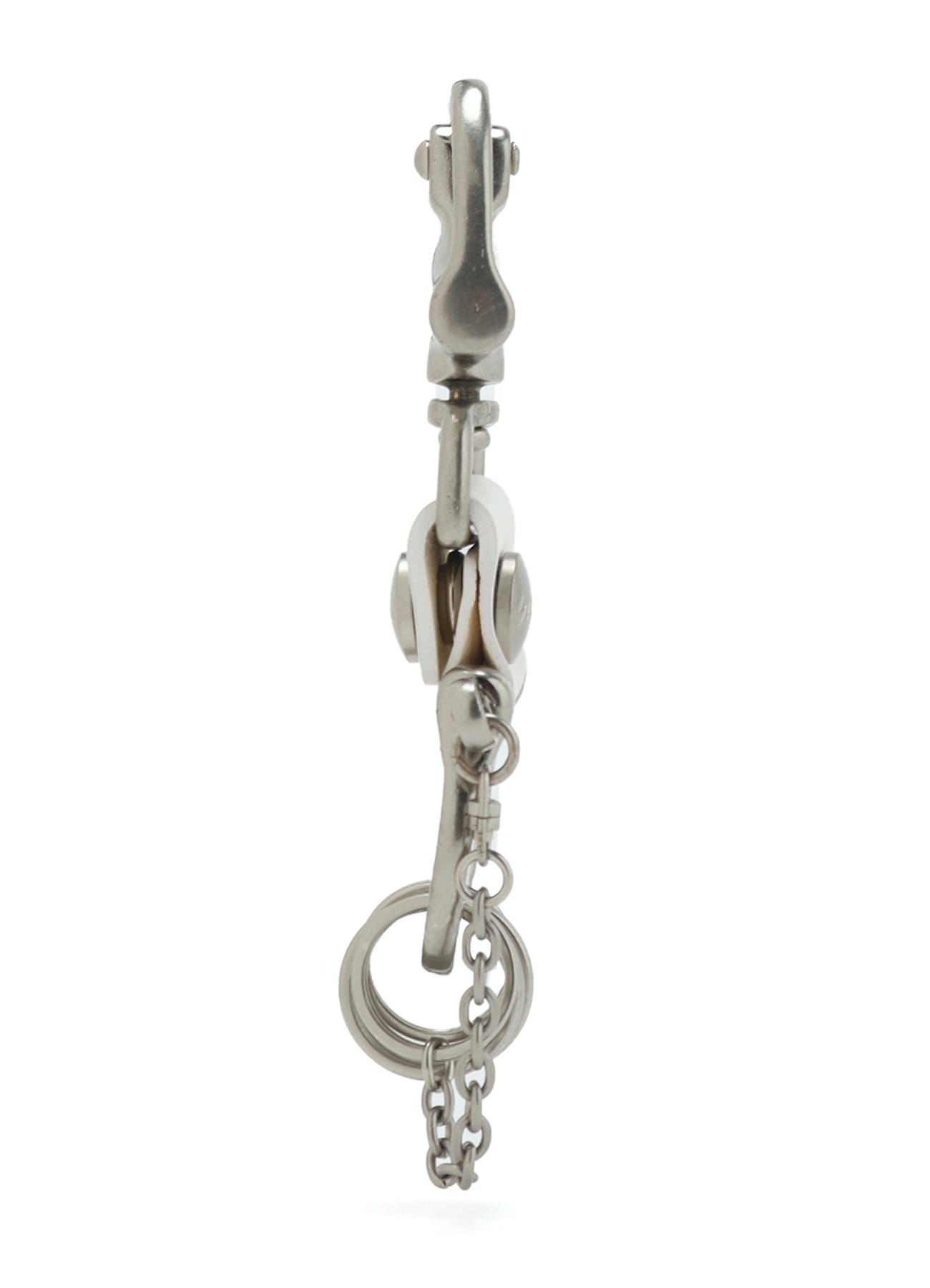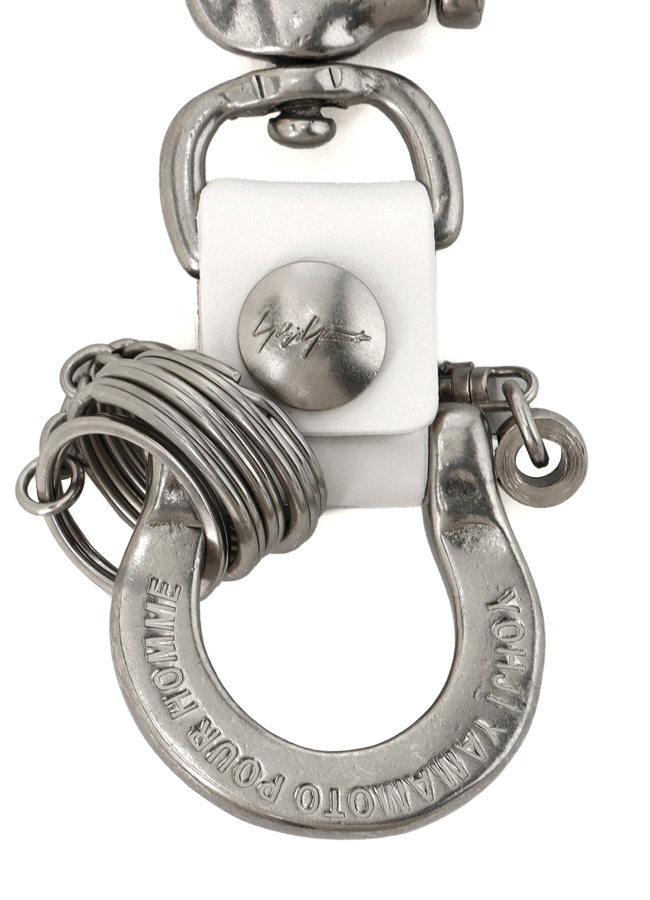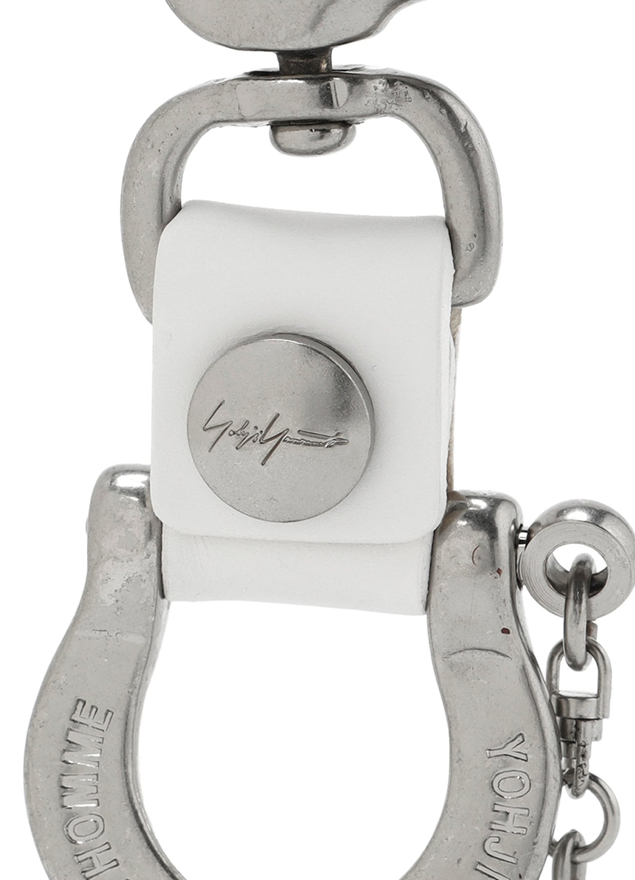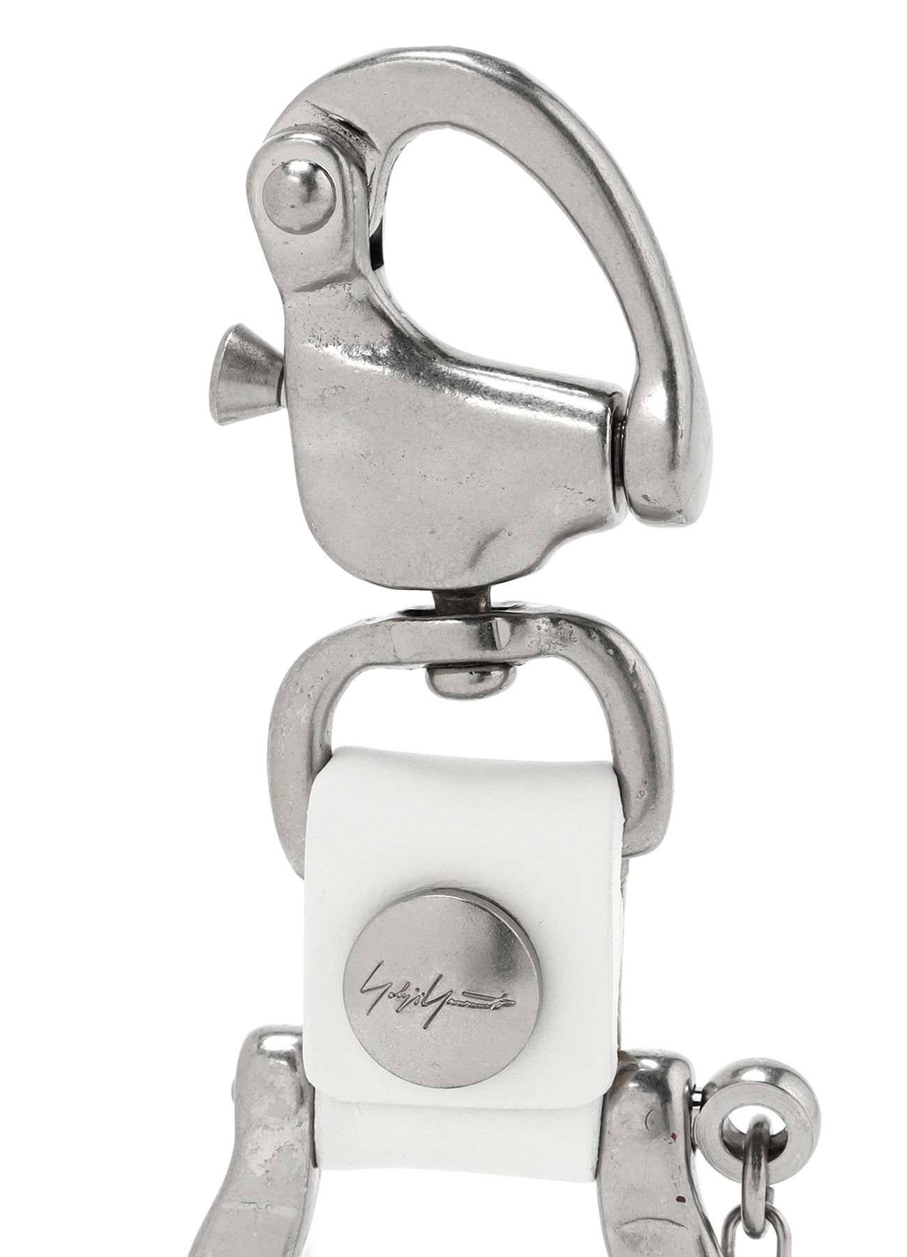 真鍮/鉄/亜鉛合金を使用したシグネチャー入りカラビナ。YOHJI YAMAMOTO POUR HOMMEの刻印が特徴的なデザインです。ネジ式になっており、リングを使わず直接鍵などを通して使用いただけます。ホワイトレザーはTHE SHOP YOHJI YAMAMOTOのみの限定商品です。