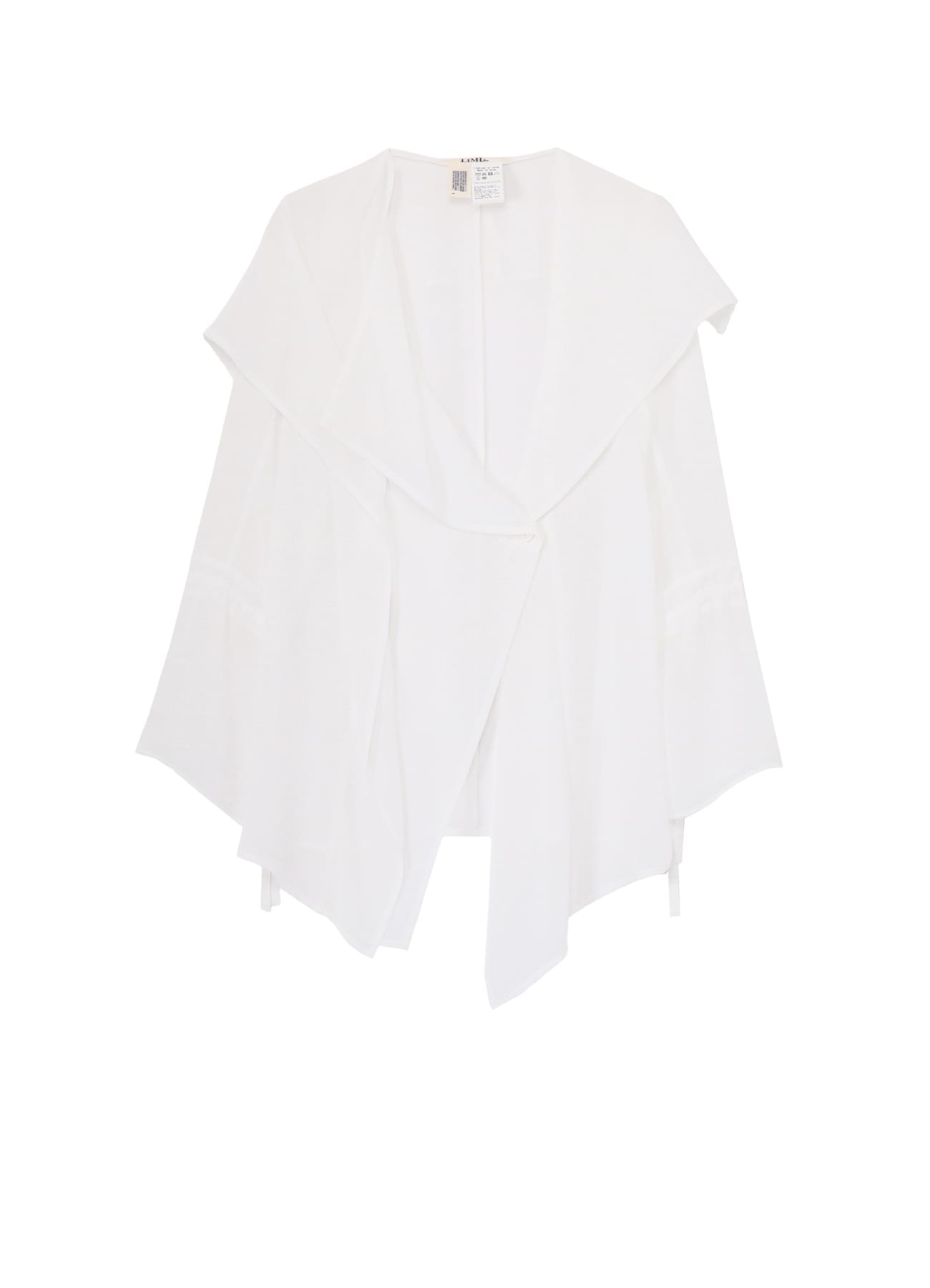 大胆に重なるドレープディテールが特徴のジャケット。ジョーゼット素材のしなやかさが、フォルムに動きを与えます。