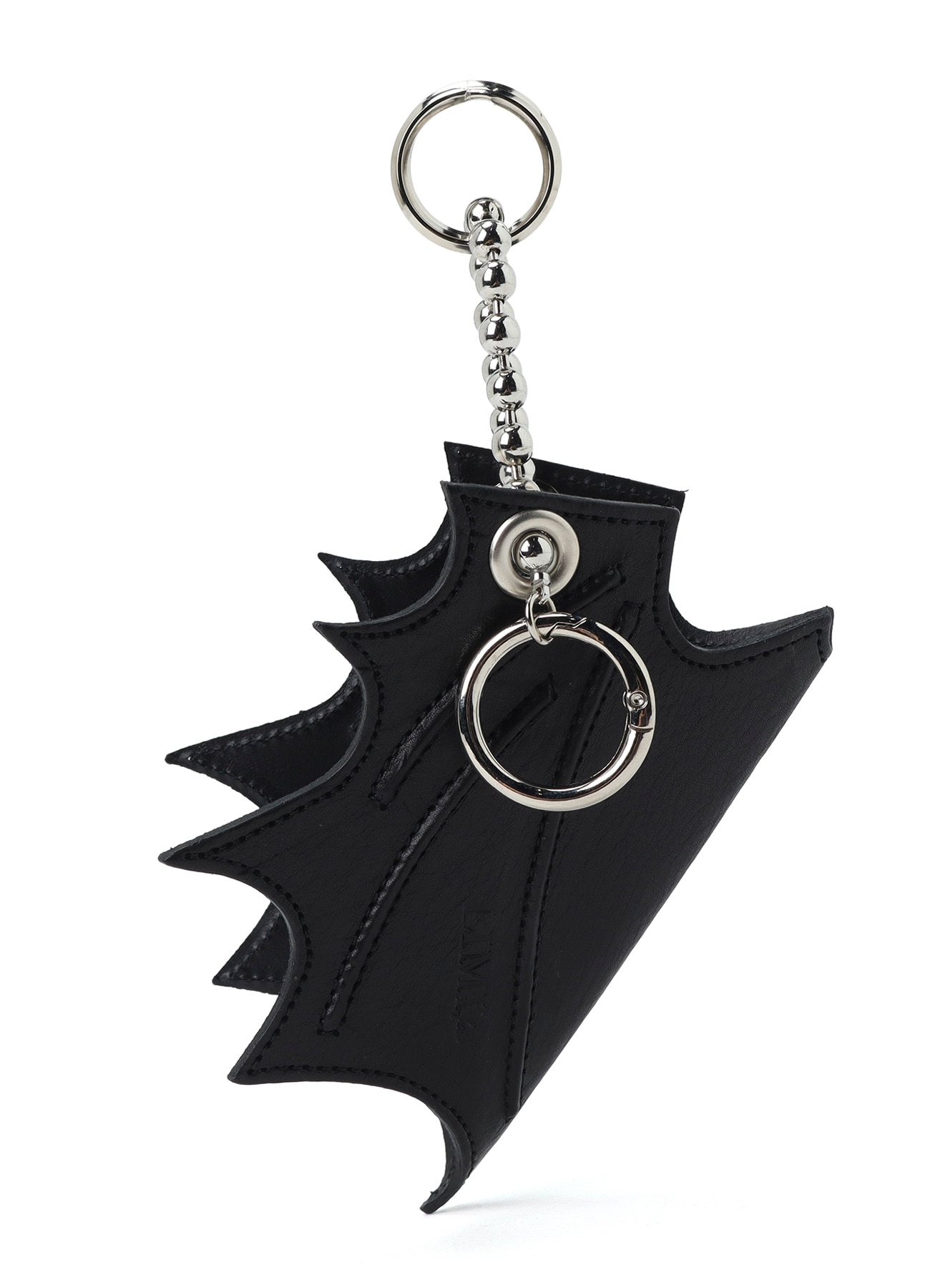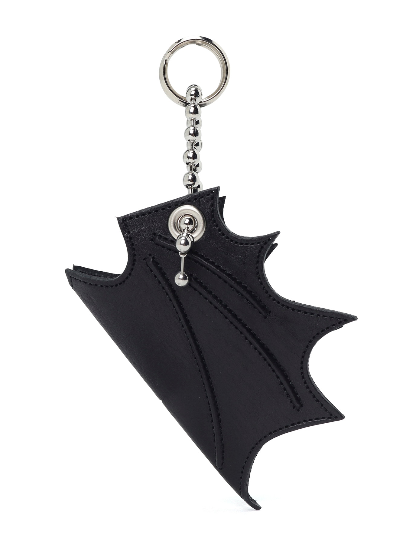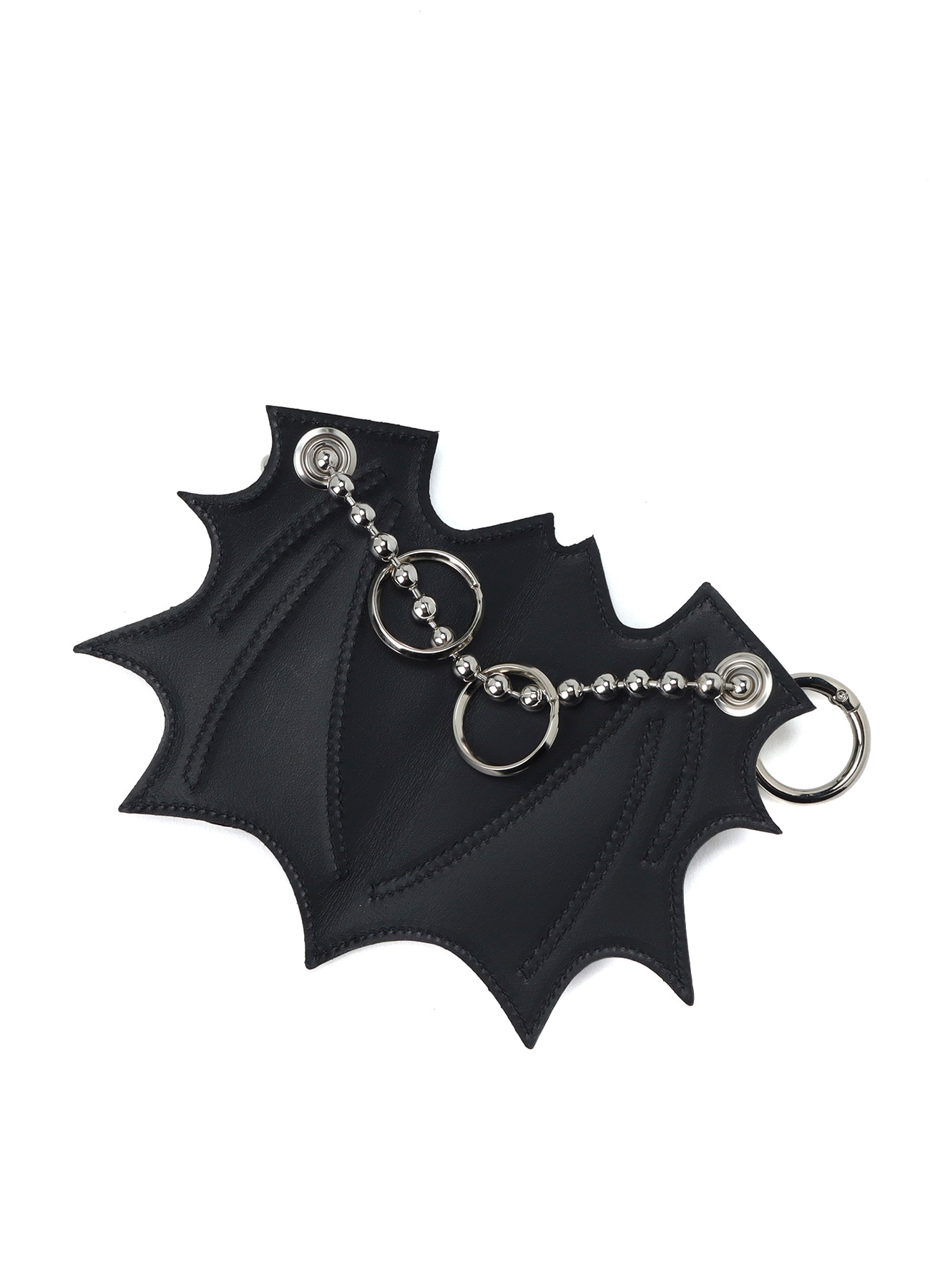 しなやかな質感とツヤのあるヌメ革を使用しました。コウモリの羽をモチーフにした本体をチェーンで通し付けています。内側の二重カンに鍵をかけて収納出来ます。