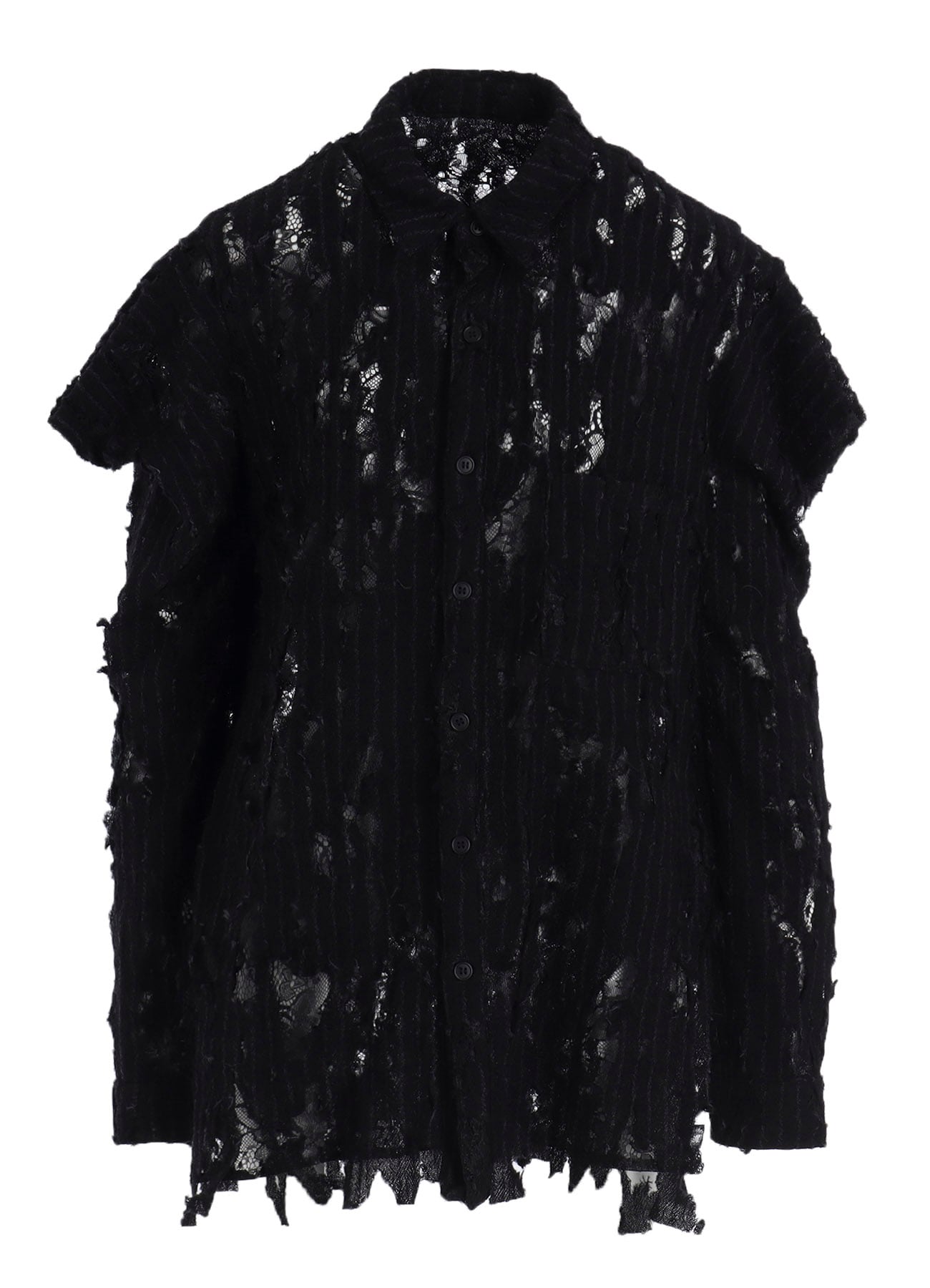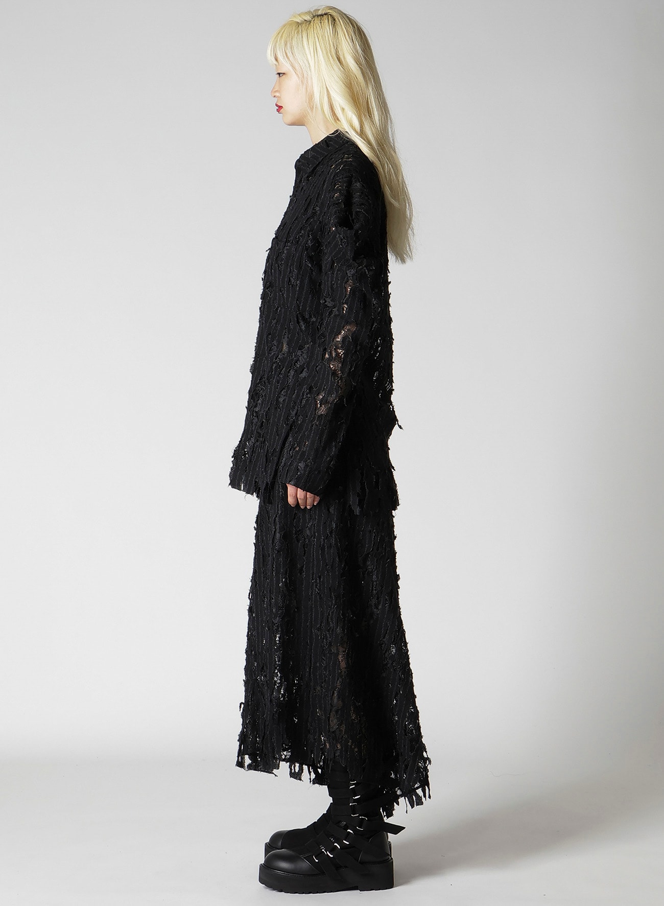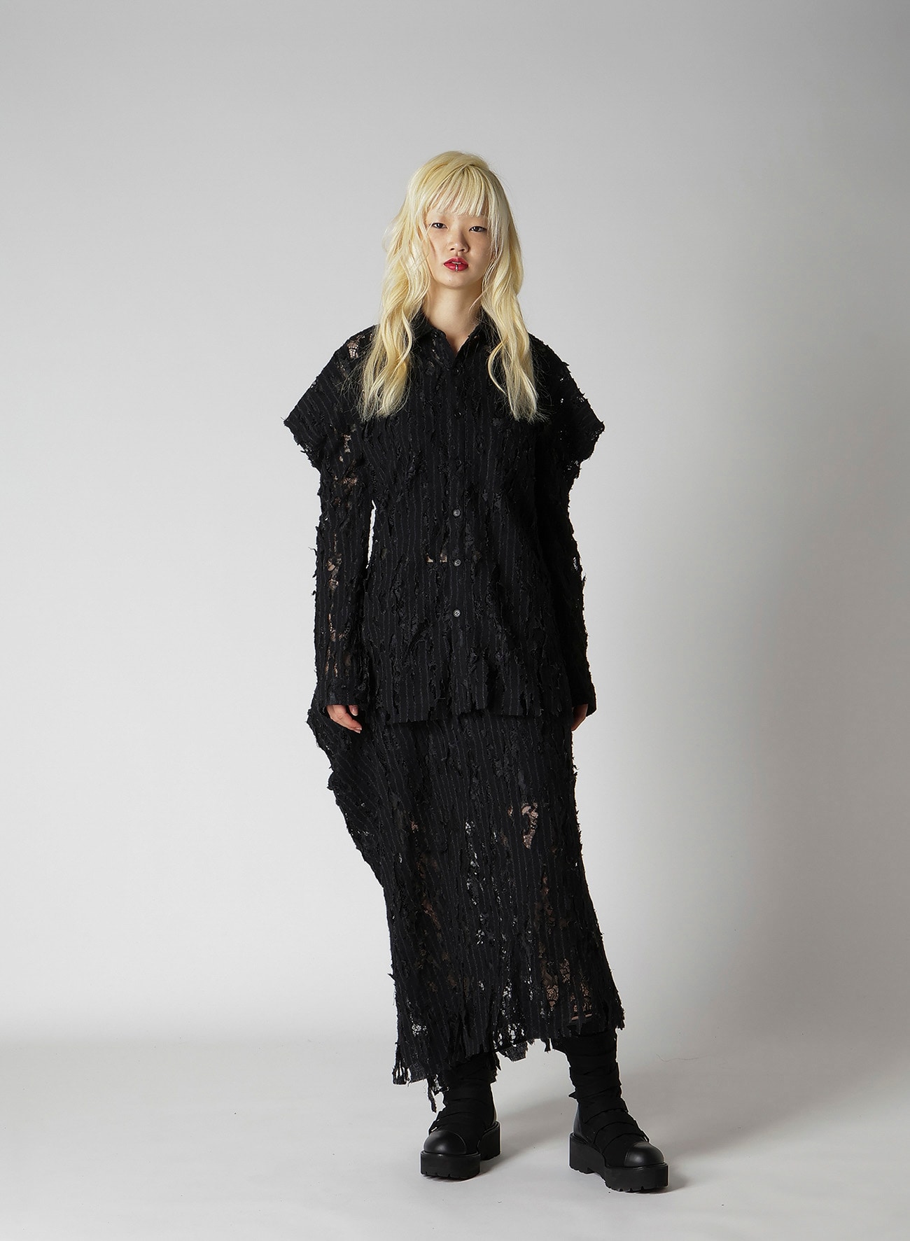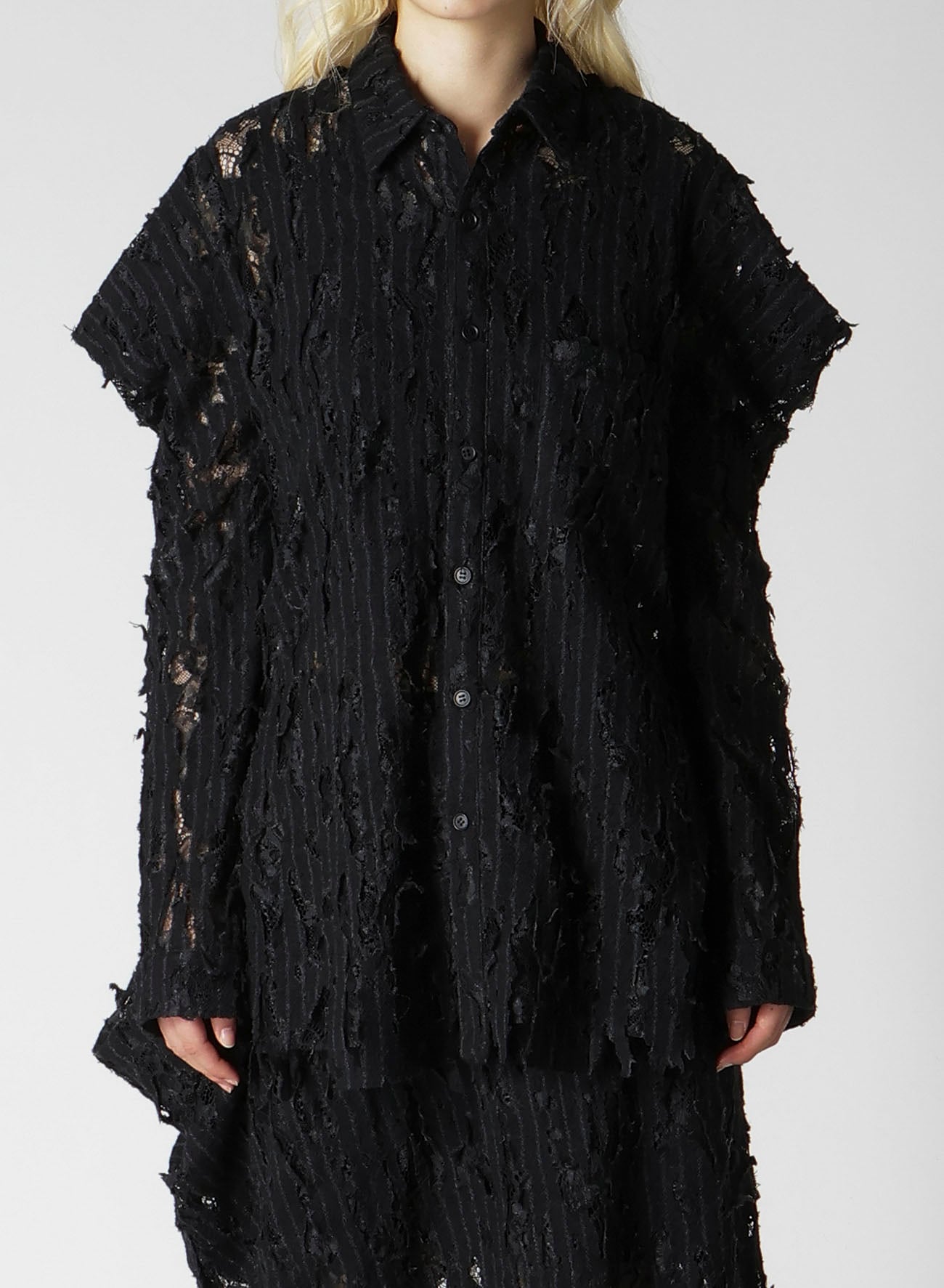 フワッとしたライトな質感、柔らかさが特徴のストライプ生地と繊細で上品なアンティーク調の花柄を刺繍で接結し、生地を溶かしてから生地洗いをして、溶かした部分をホツレさせ、ボロボロの表情を作っています。ムラ柄位置、ホツレの状態は1着1着異なります。ご理解ください。また徐々にホツレ、剥がれる可能性がありますがご理解下さい。ボリュームのショルダーデザインが特徴のブラウスです。肩部分、立体的なパターンのポニョがボリュームを持たせながらも肘から下の袖や身頃部分はすっきりとした印象で、ボトムスともバランスが取りやすい一枚です。