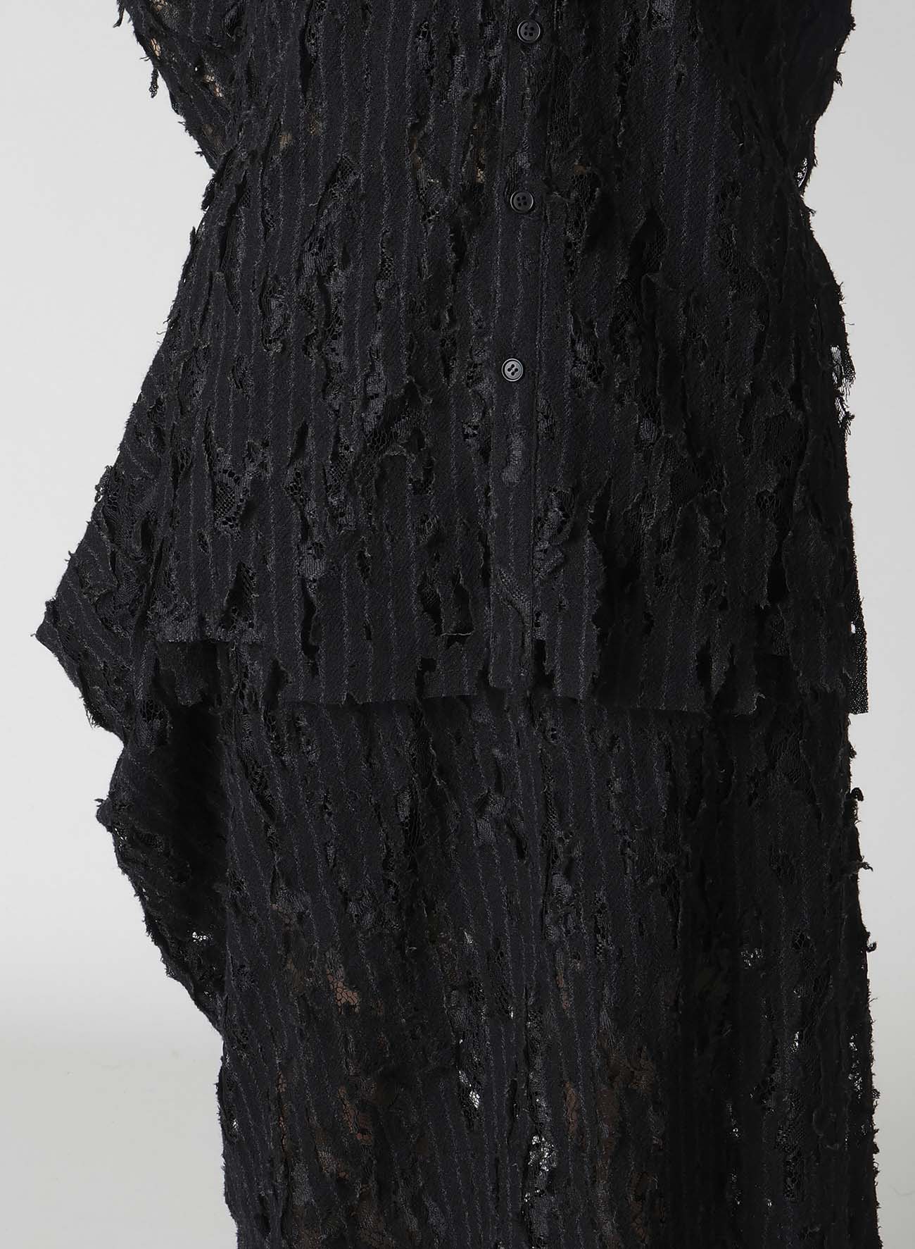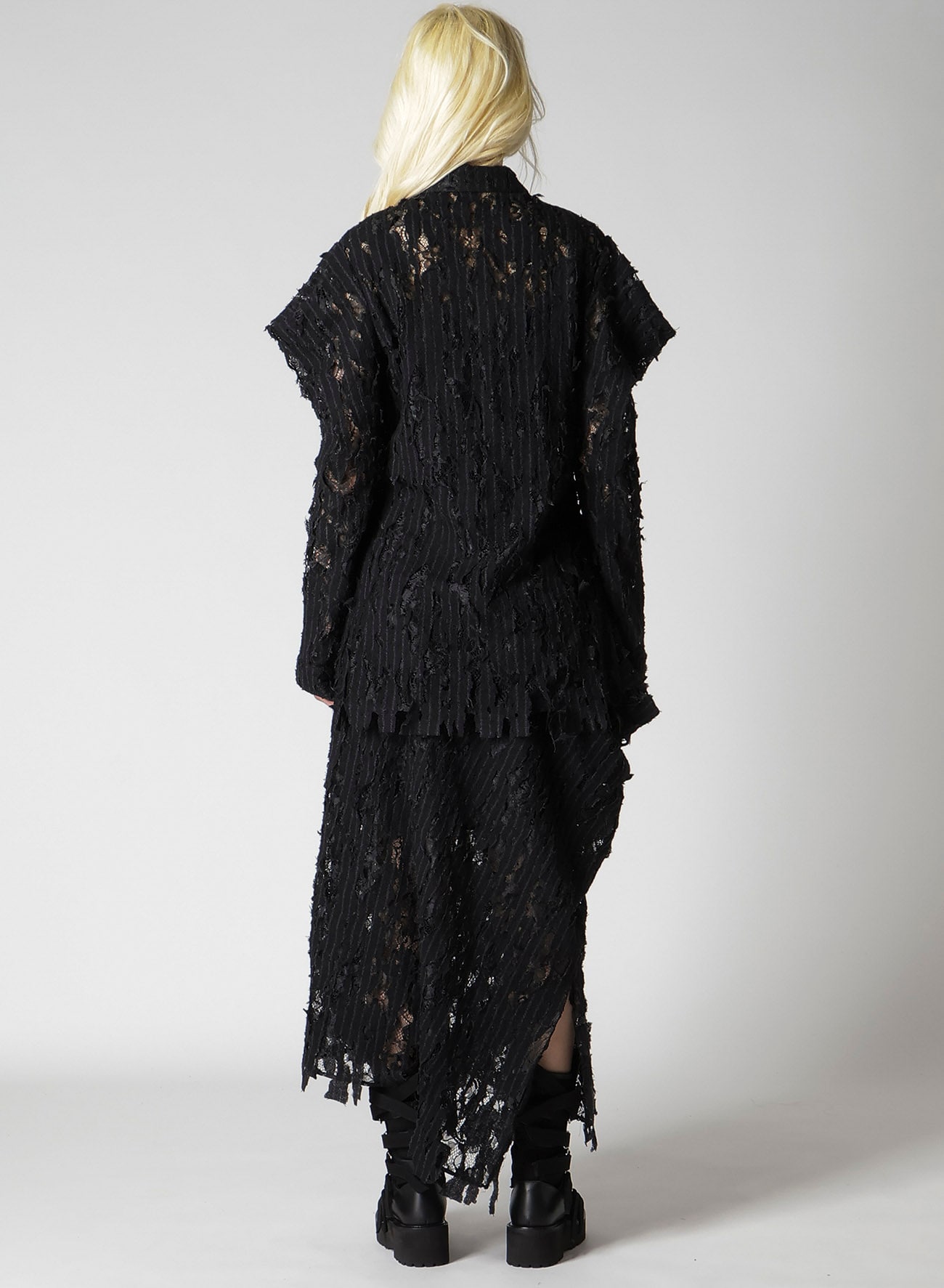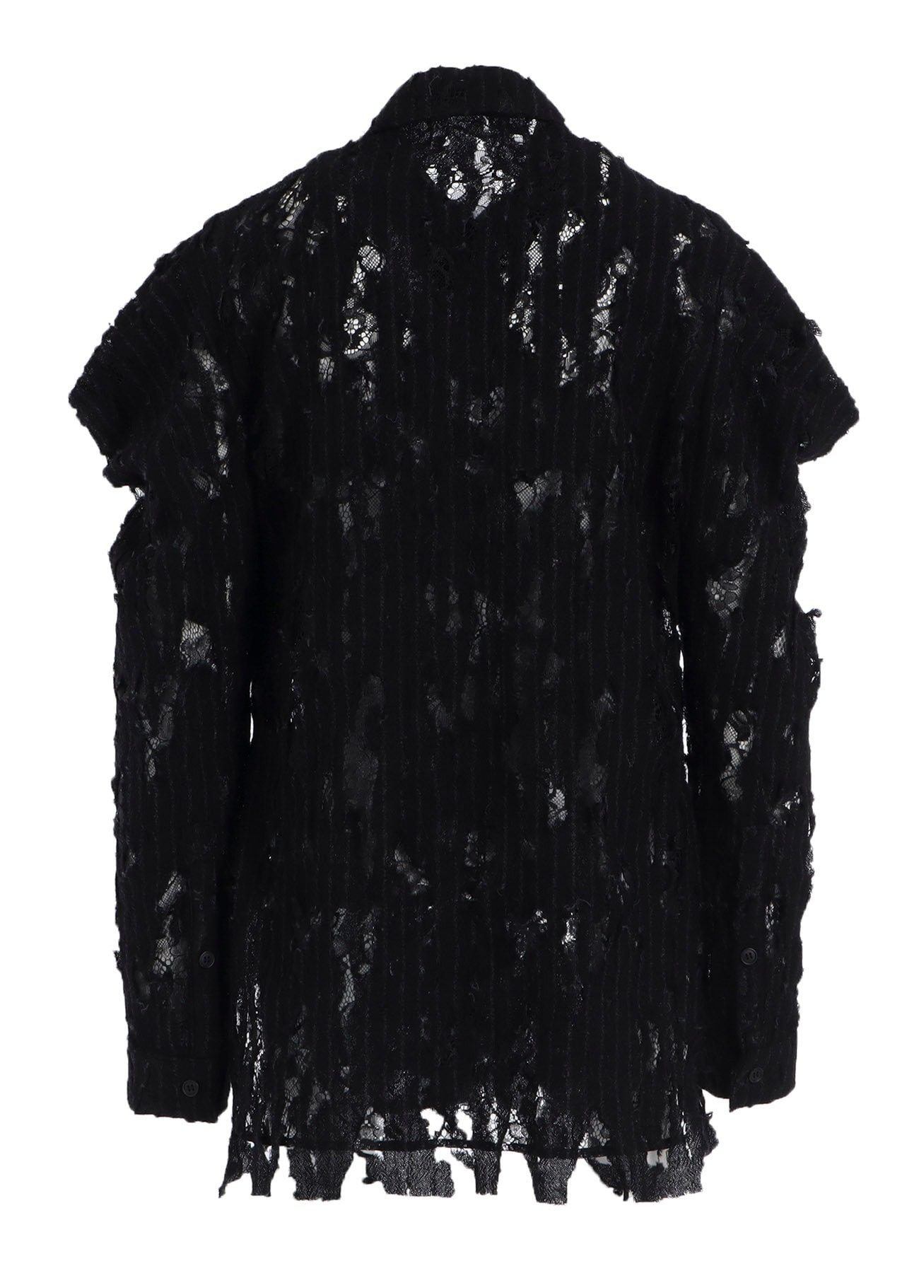 フワッとしたライトな質感、柔らかさが特徴のストライプ生地と繊細で上品なアンティーク調の花柄を刺繍で接結し、生地を溶かしてから生地洗いをして、溶かした部分をホツレさせ、ボロボロの表情を作っています。ムラ柄位置、ホツレの状態は1着1着異なります。ご理解ください。また徐々にホツレ、剥がれる可能性がありますがご理解下さい。ボリュームのショルダーデザインが特徴のブラウスです。肩部分、立体的なパターンのポニョがボリュームを持たせながらも肘から下の袖や身頃部分はすっきりとした印象で、ボトムスともバランスが取りやすい一枚です。