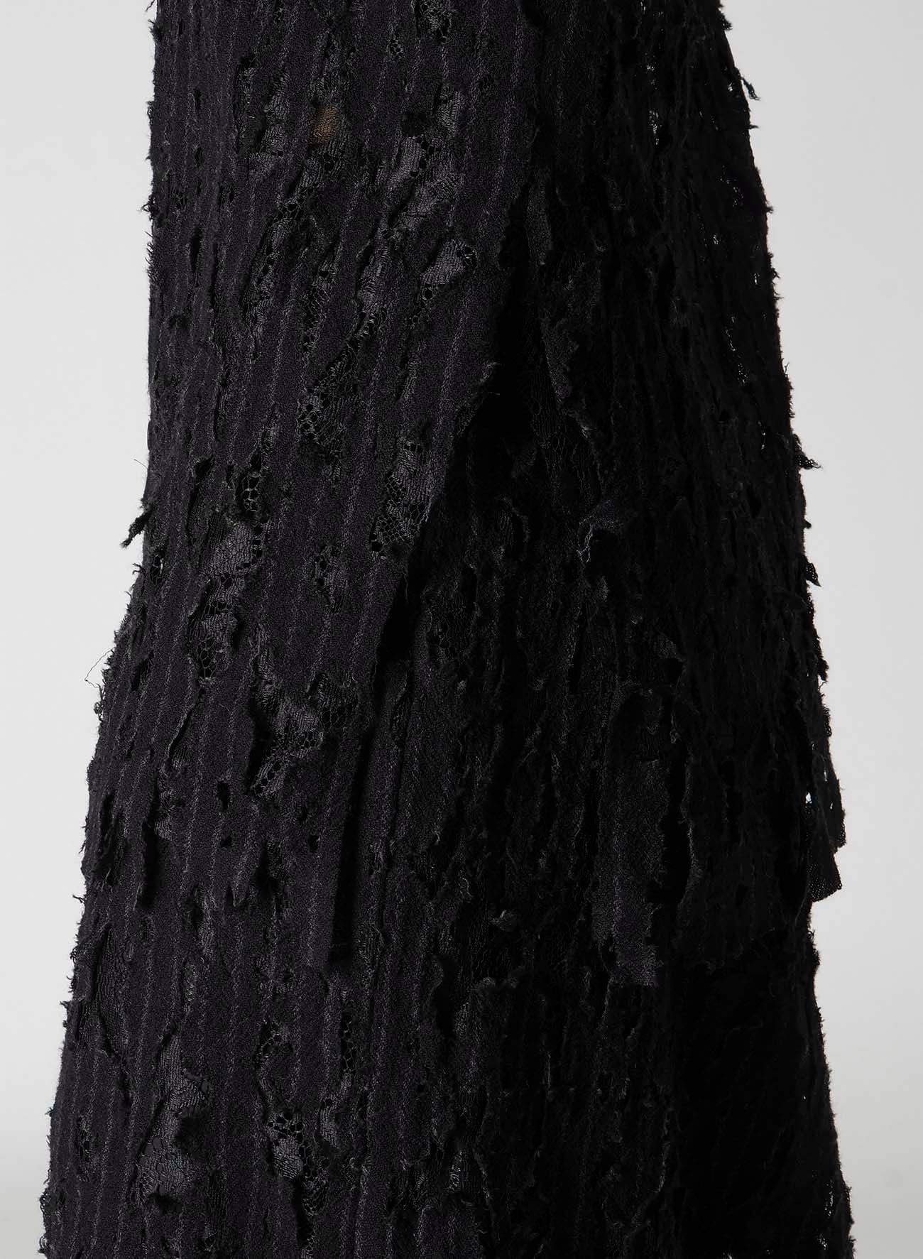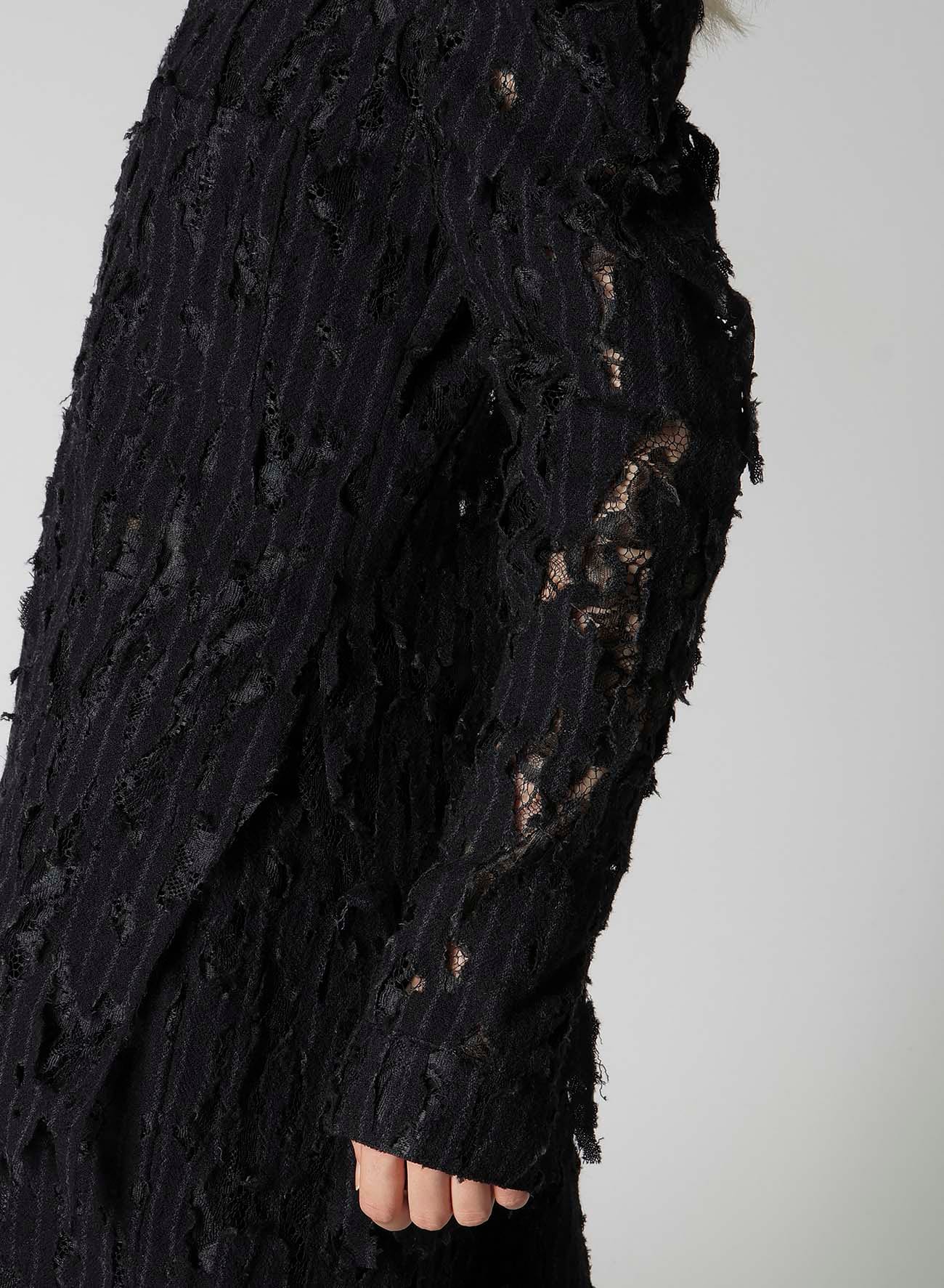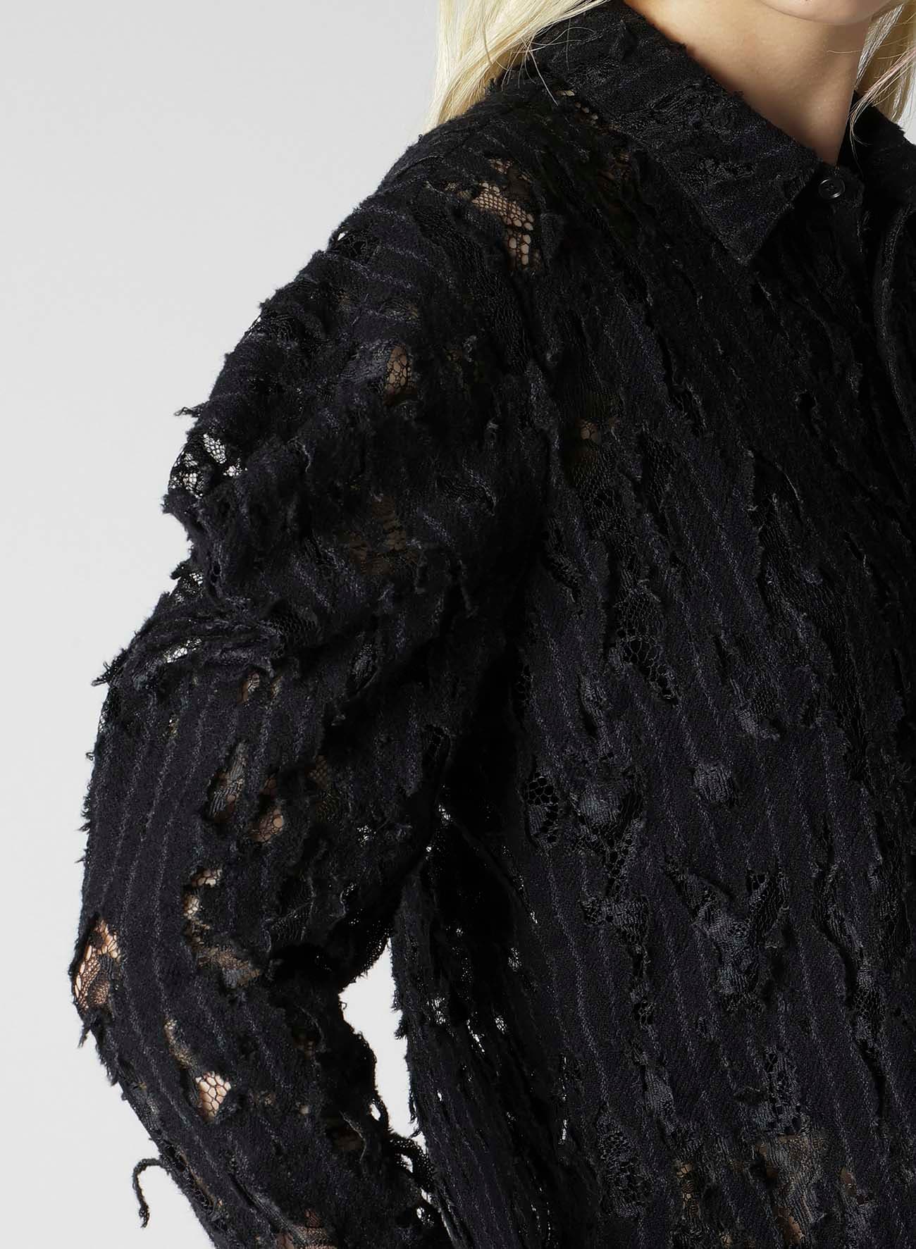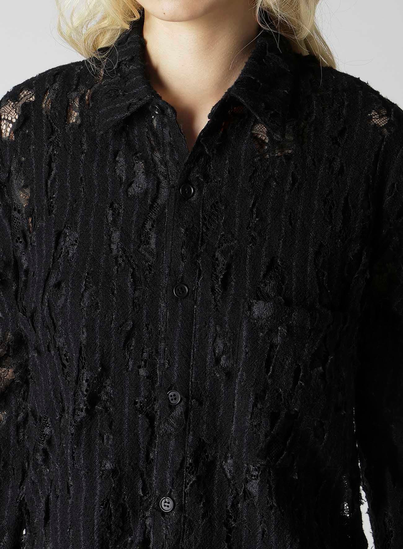 フワッとしたライトな質感、柔らかさが特徴のストライプ生地と繊細で上品なアンティーク調の花柄を刺繍で接結し、生地を溶かしてから生地洗いをして、溶かした部分をホツレさせ、ボロボロの表情を作っています。ムラ柄位置、ホツレの状態は1着1着異なります。ご理解ください。また徐々にホツレ、剥がれる可能性がありますがご理解下さい。ボリュームのショルダーデザインが特徴のブラウスです。肩部分、立体的なパターンのポニョがボリュームを持たせながらも肘から下の袖や身頃部分はすっきりとした印象で、ボトムスともバランスが取りやすい一枚です。