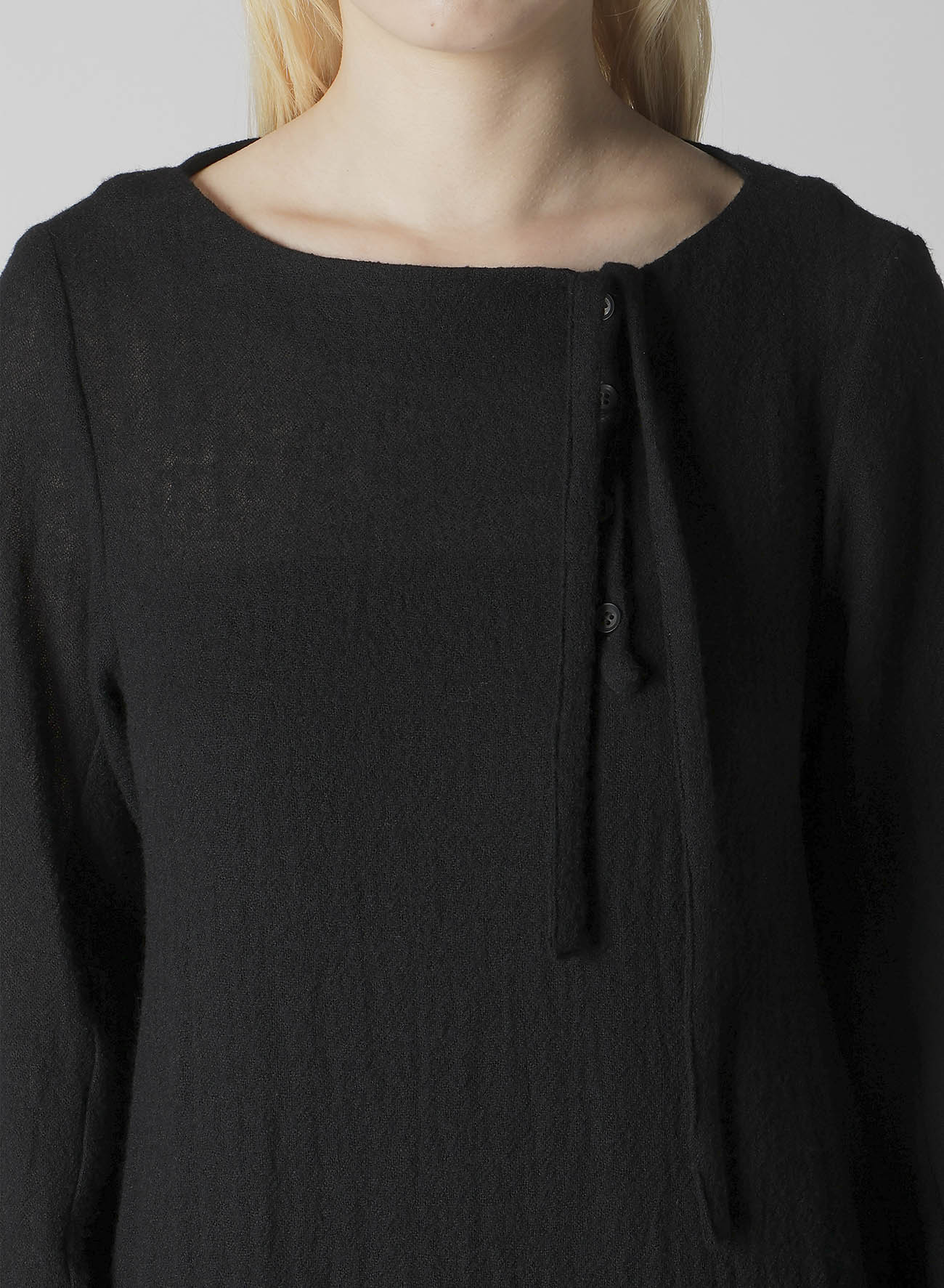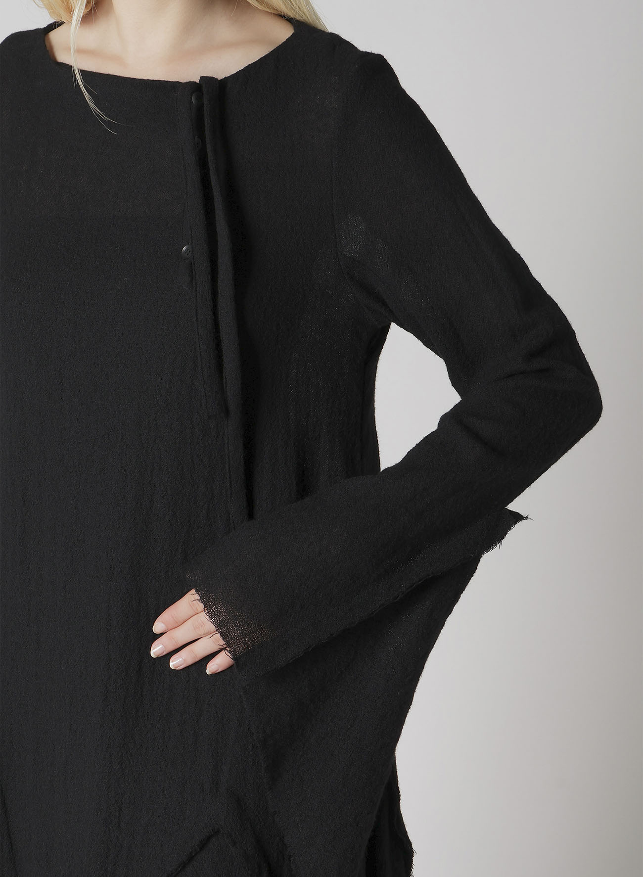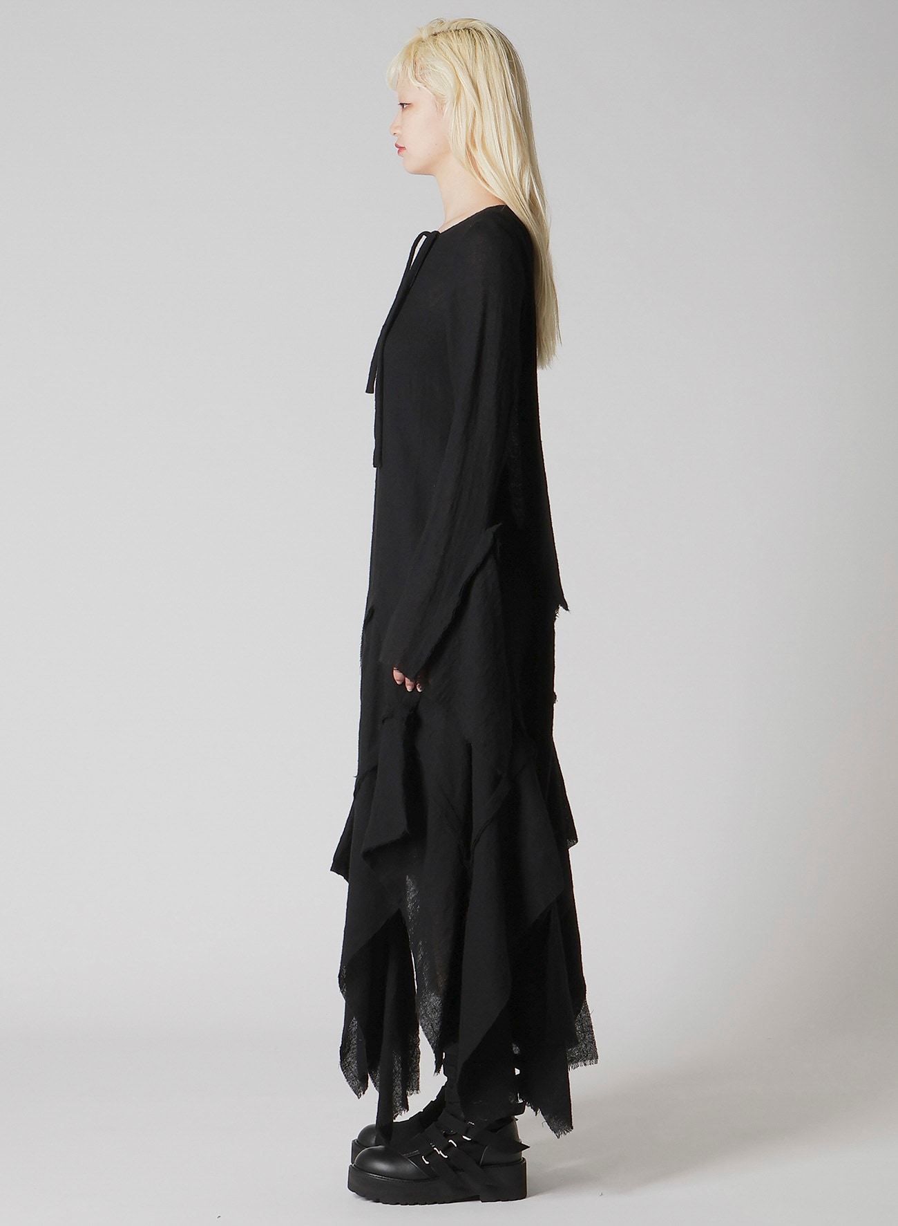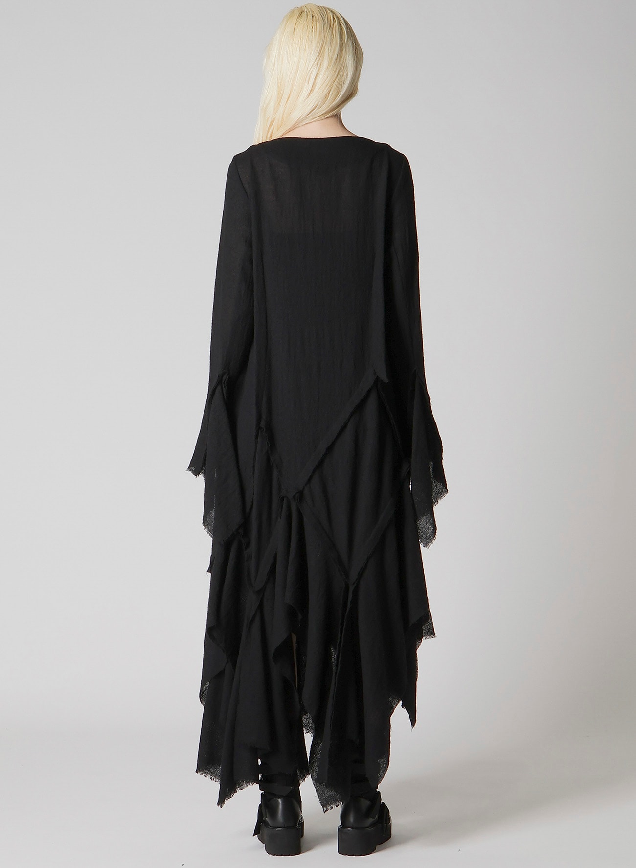 ウールガーゼをワッシャー加工し、表裏に特徴のあるランダムな凹凸感と膨らみを出した、軽くて柔らかい生地です。裁ち切り仕様で縫製にもこだわり、自然なホツレ、ボロボロながら品のある表情に仕上げています。裁ち切り部分、ホツレの状態は1着1着異なり、徐々にほつれてきますがご理解ください。ひらひらとした裾が特徴的なドレスです。立体的なパターンながらも薄い生地感でボリュームは出ず、見る角度によって表情の違いを感じさせます。