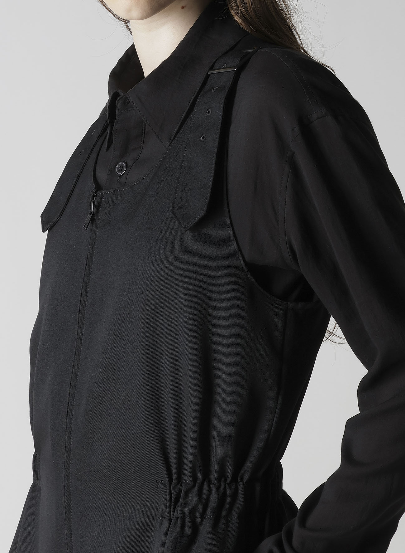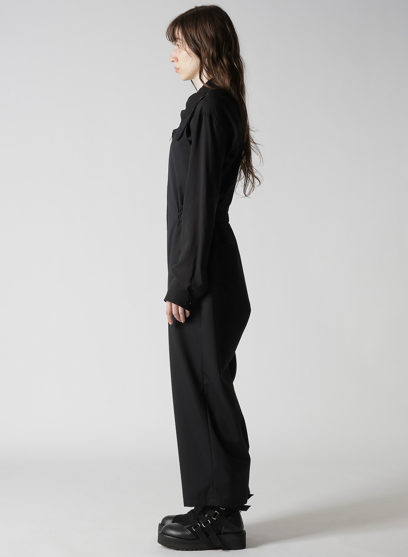 綺麗な目風のしなやかな落ち感と柔らかい肌触りが特徴のギャバジンです。肩紐で着丈の調節が可能なオーバーオールです。合わせるインナーによってフォーマルにもカジュアルにも着られる万能なアイテムです。