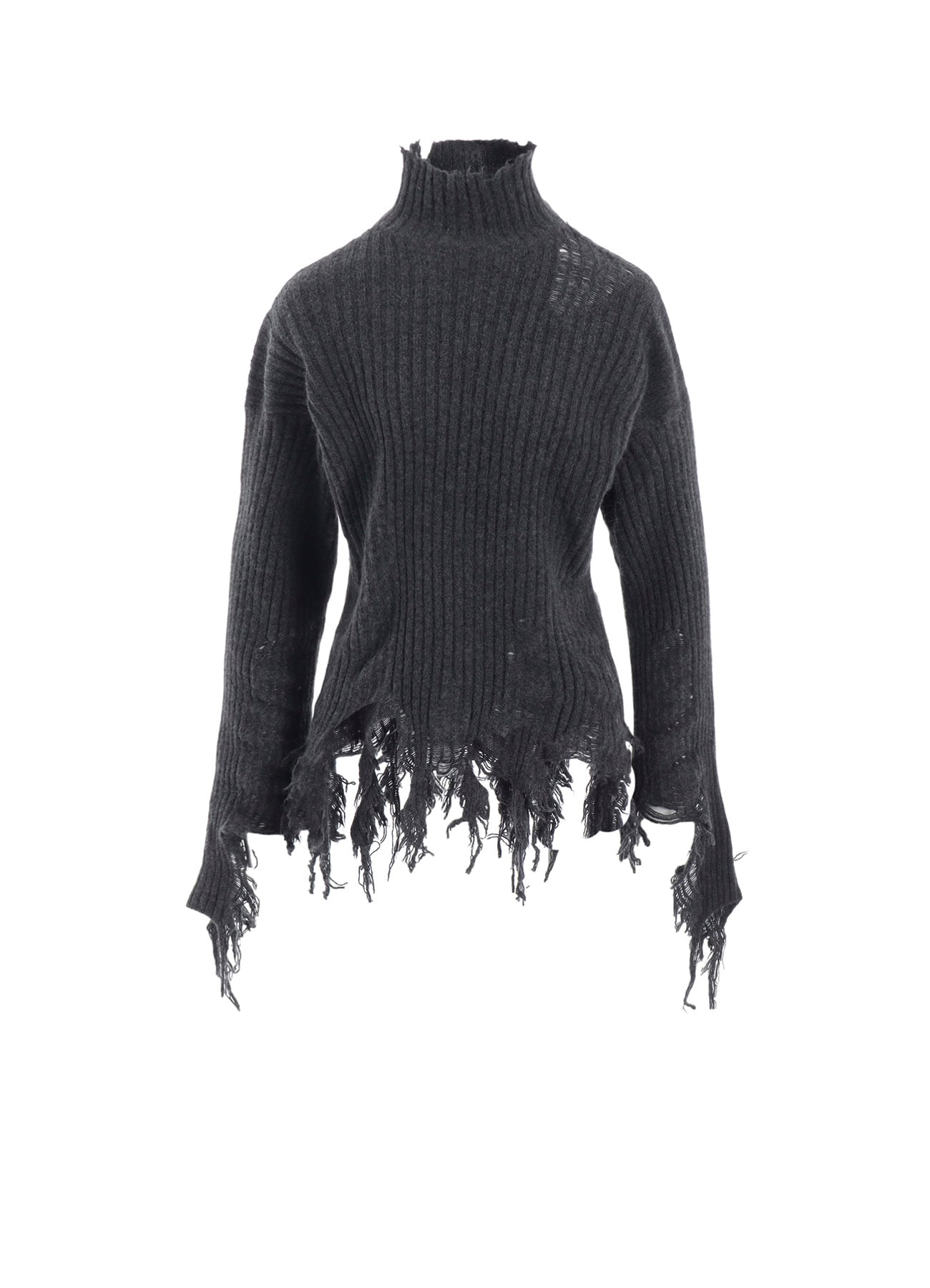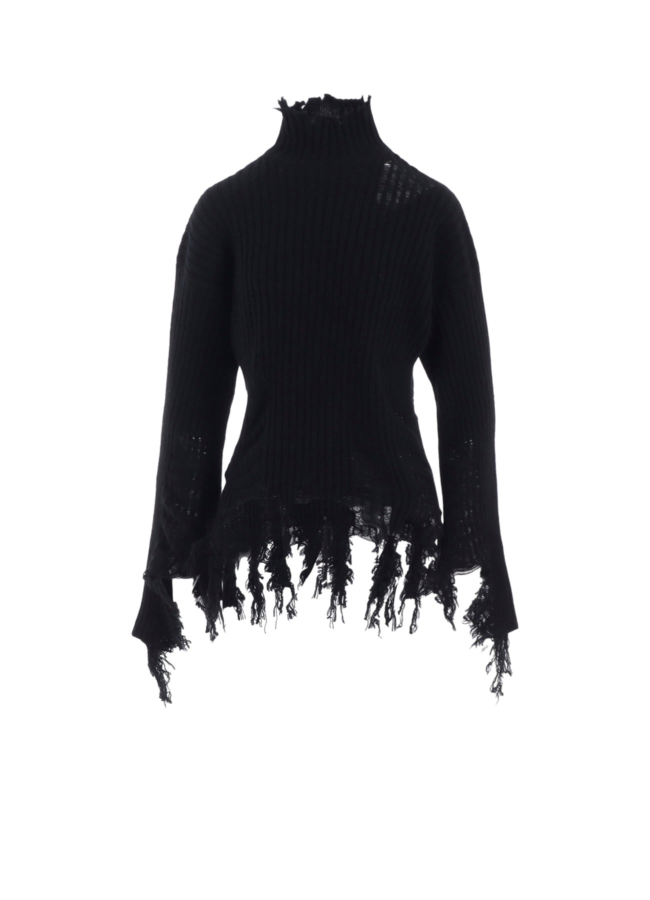 ウールにアンゴラとナイロンをブレンドした糸を使用しています。毛の中心が空洞になっているアンゴラが入ることで、糸に空気を多く含むようになり、軽量感と保温性に優れたニットに仕上がりました。クラッシュ部分は製品洗いをした後、さらにカットして仕上げています。カットは1着ごとの手作業になるため、時間と手間が掛かっています。細部にまでこだわったニットをぜひ体感してください。