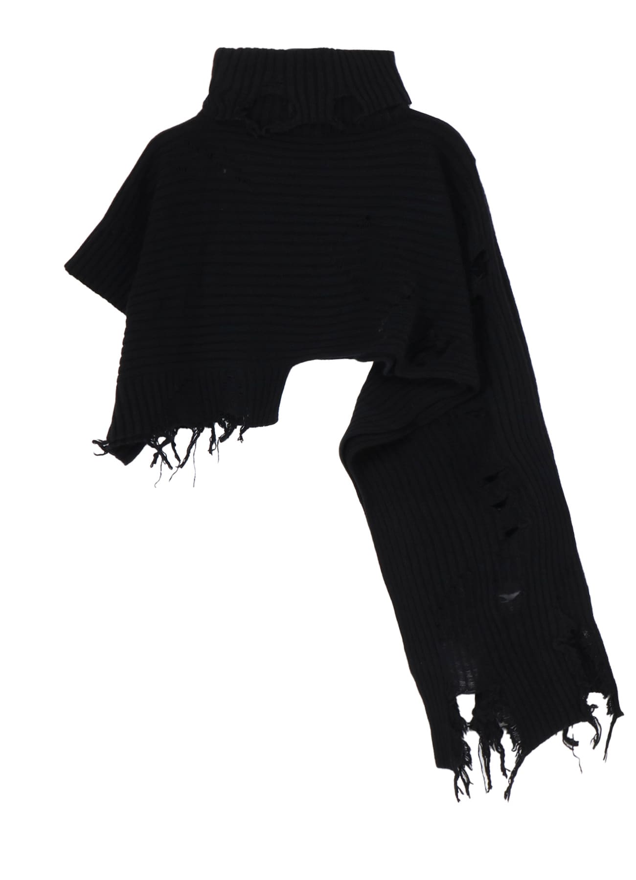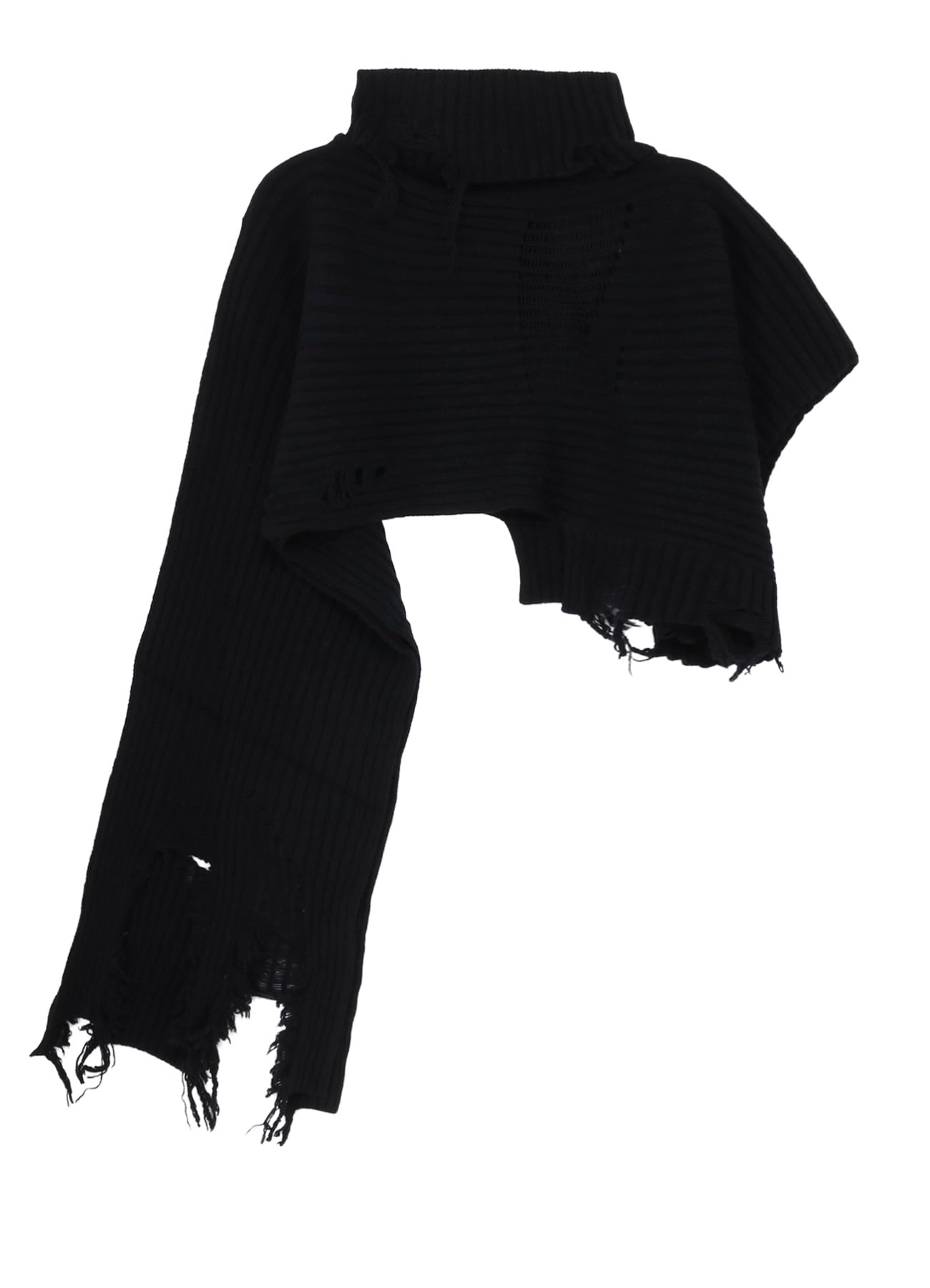 ラムウール糸をベースに、アンゴラとナイロン糸を加えた撚糸を使用。アンゴラは太い毛が表面に現れることで、起毛したような独特な風合いとシルクのような光沢感を生み出し、軽やかな質感を演出しています。リブ編とダメージ部分の編を組み合わせ、形を整えた後に製品洗いを施し、ダメージ編みの部分にカットを加えて仕上げています。細部にわたる繊細なカット作業に工夫を凝らしました。