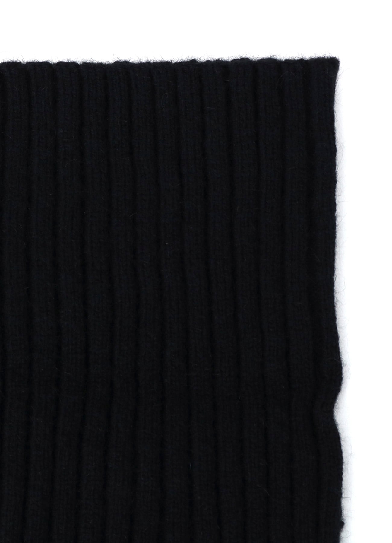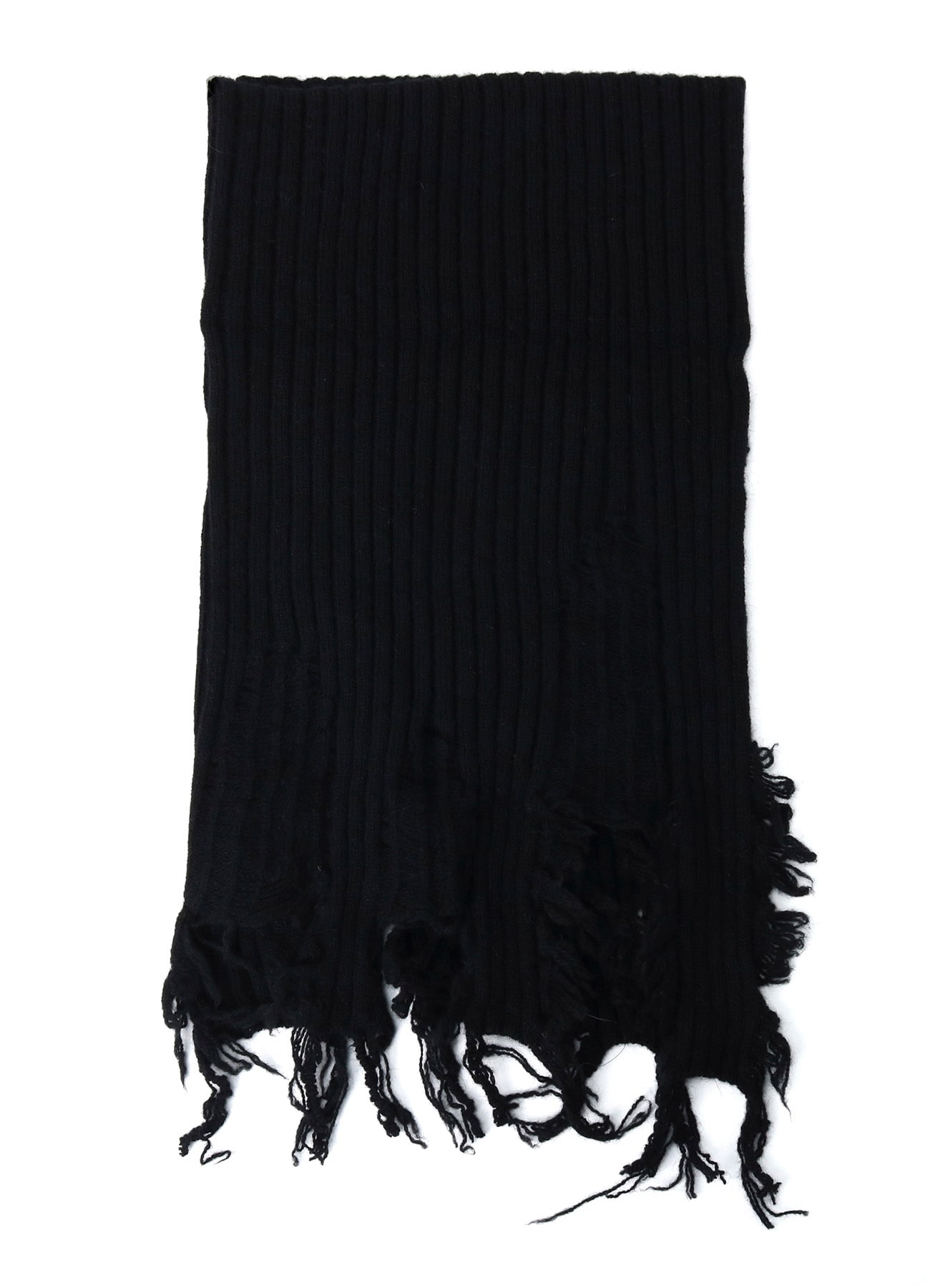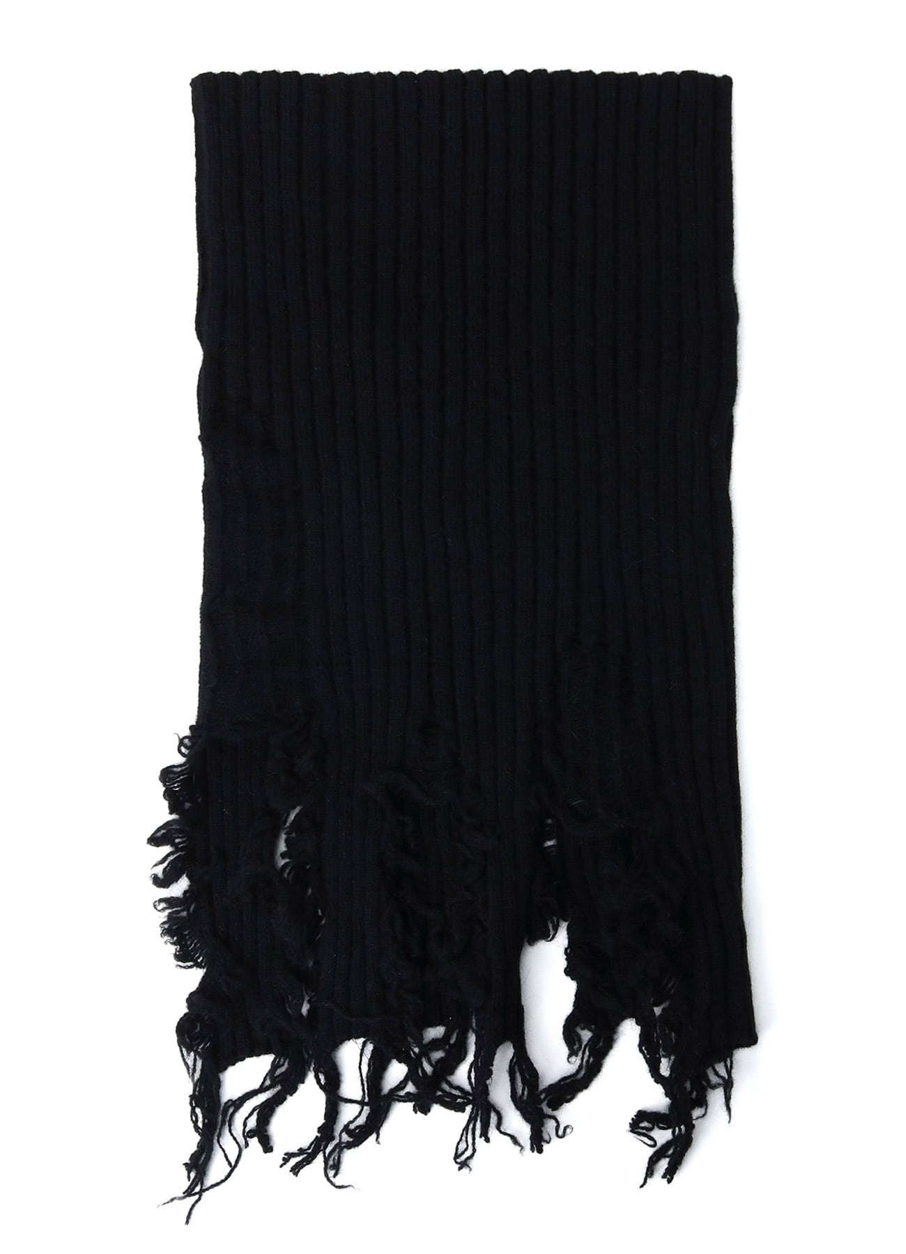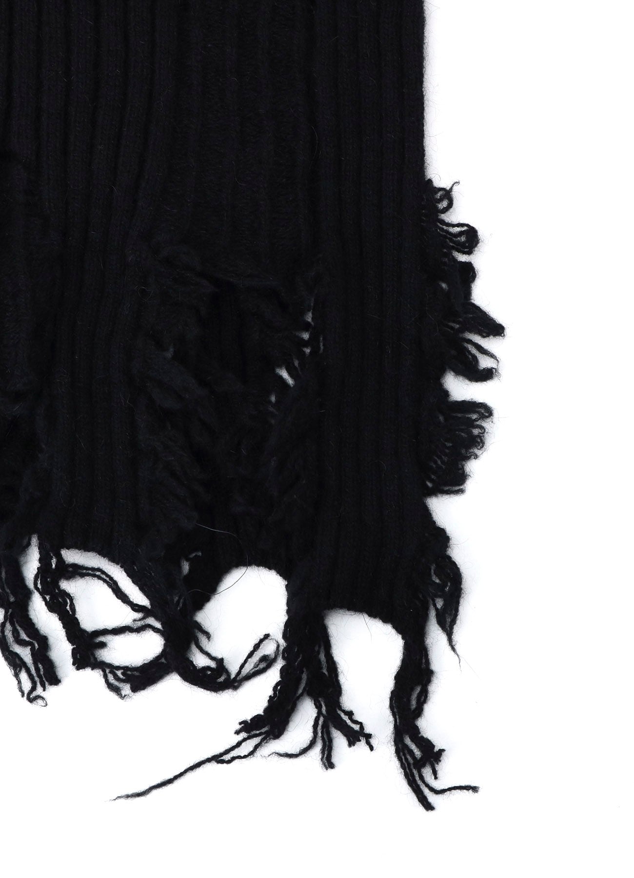 ラムウール糸をベースに、アンゴラとナイロン糸を加えた撚糸を使用。アンゴラは太い毛が表面に現れることで、起毛したような独特な風合いとシルクのような光沢感を生み出し、軽やかな質感を演出しています。リブ編とダメージ部分の編を組み合わせ、形を整えた後に製品洗いを施し、ダメージ編みの部分にカットを加えて仕上げています。細部にわたる繊細なカット作業に工夫を凝らしました。モデル写真ではスカートとして使用。