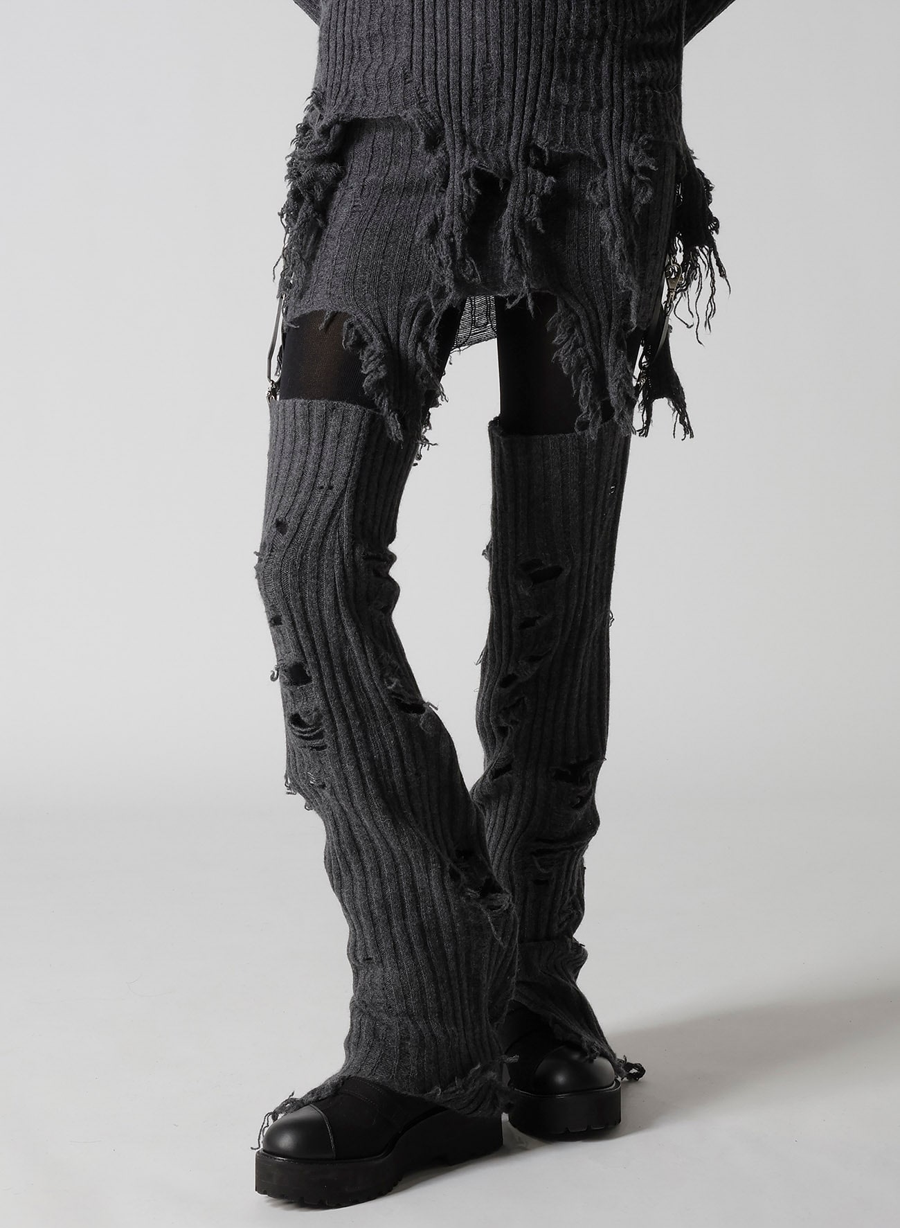 ラムウール糸をベースに、アンゴラとナイロン糸を加えた撚糸を使用。アンゴラは太い毛が表面に現れることで、起毛したような独特な風合いとシルクのような光沢感を生み出し、軽やかな質感を演出しています。リブ編とダメージ部分の編を組み合わせ、形を整えた後に製品洗いを施し、ダメージ編みの部分にカットを加えて仕上げています。細部にわたる繊細なカット作業に工夫を凝らしました。ハーネスベルトと組合せ、好きな高さに調節することで、よりたっぷりの分量感をお楽しみいただけます。