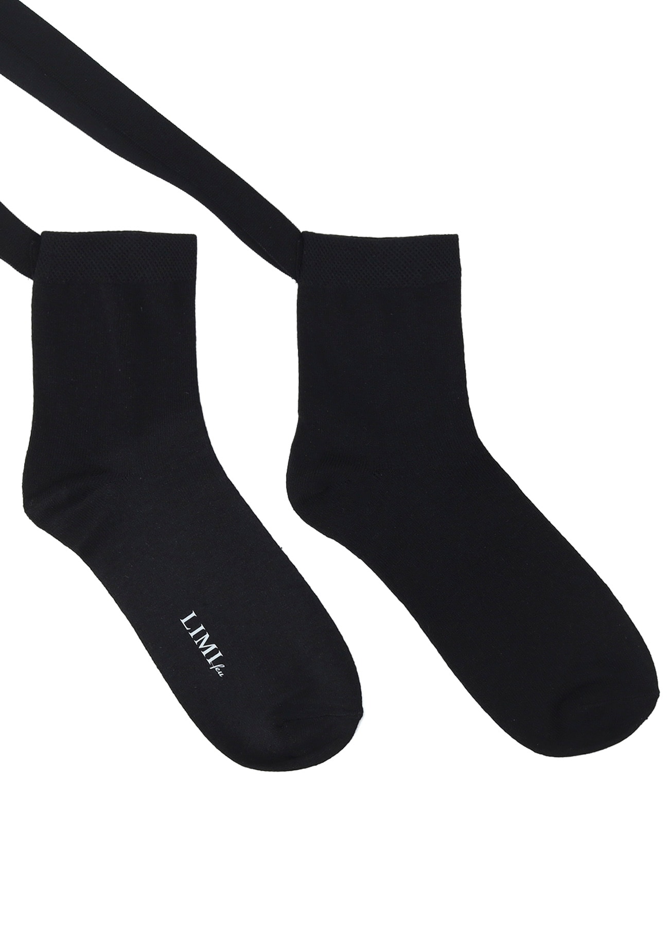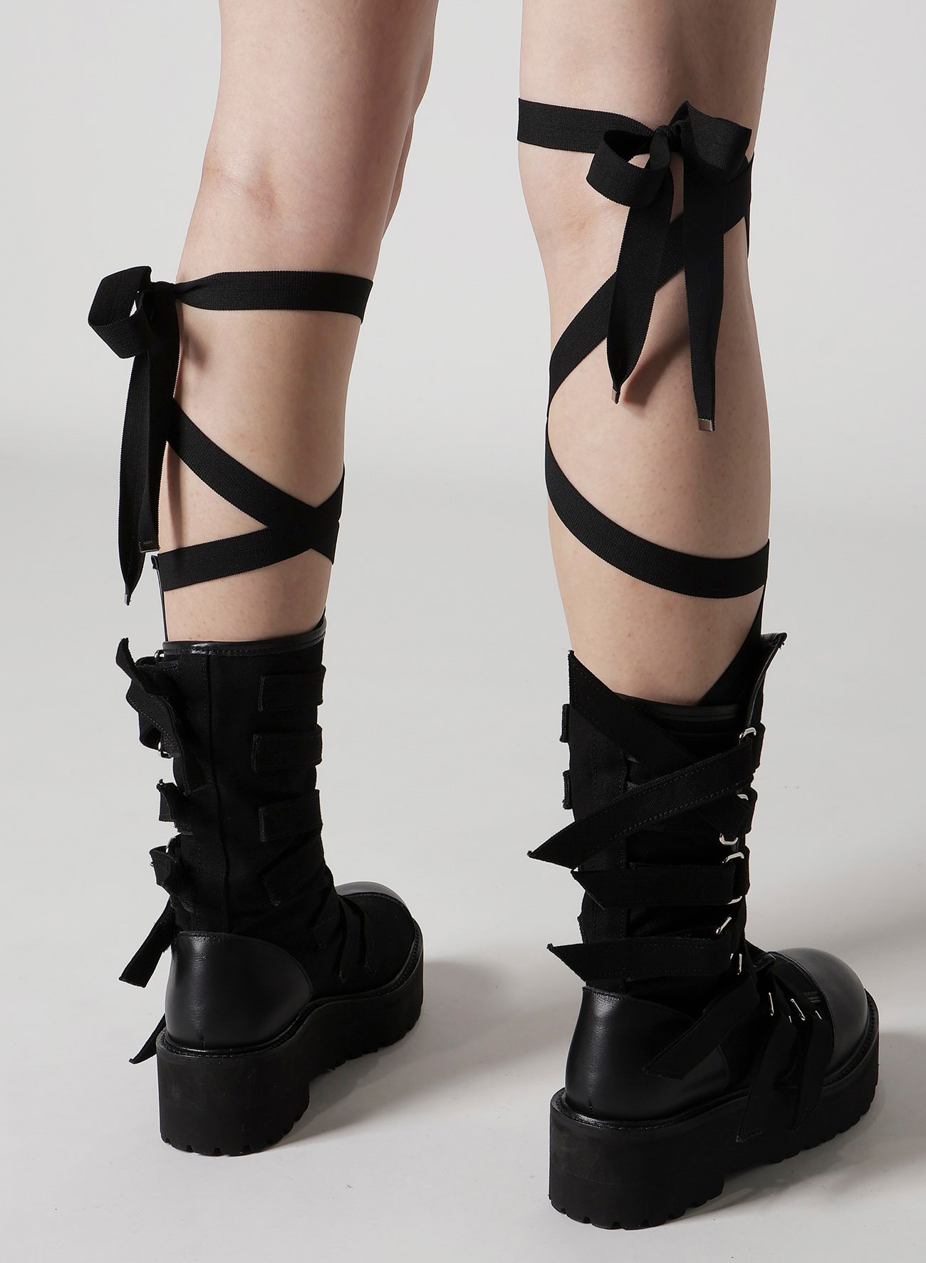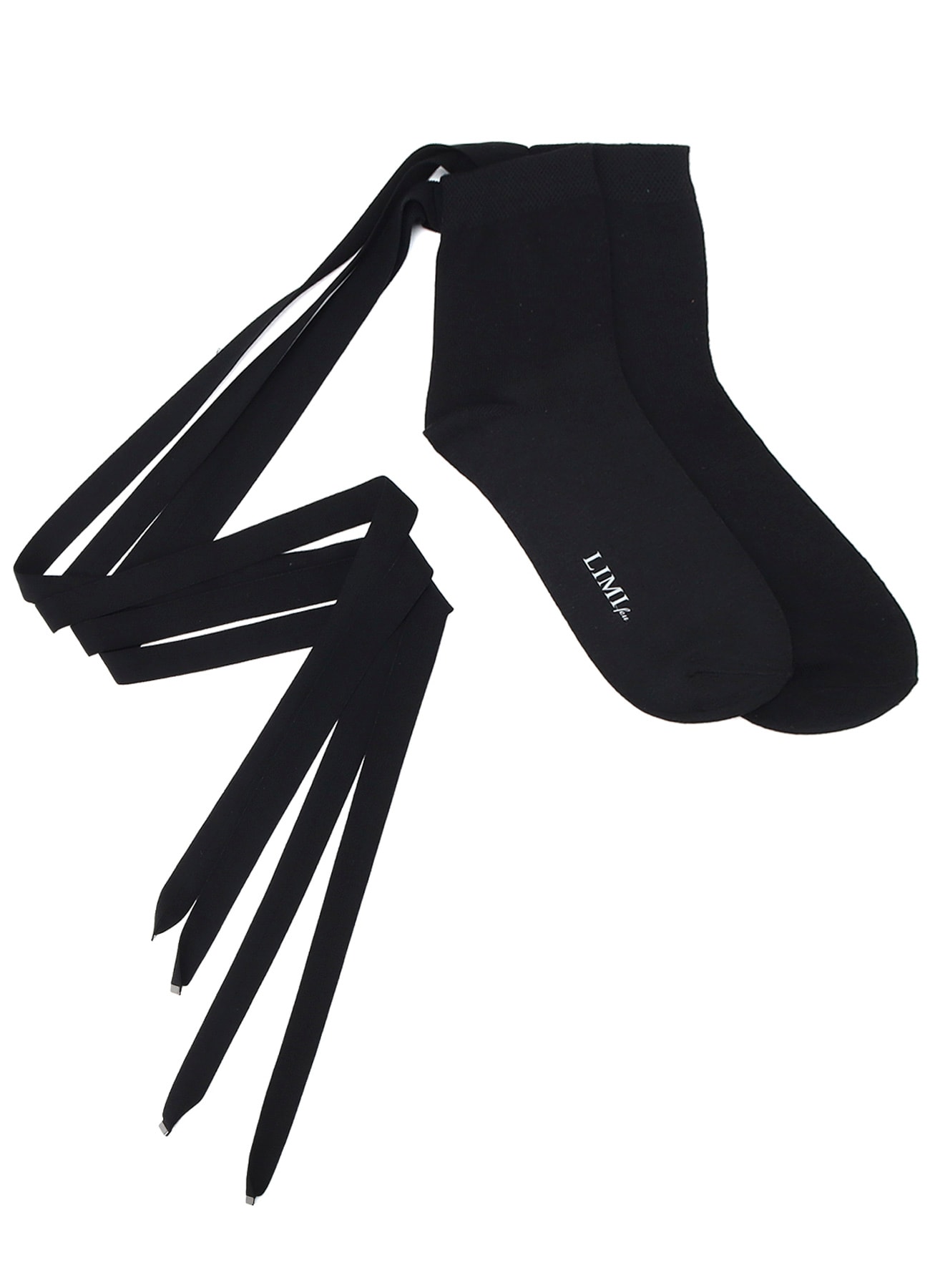薄手のコットンソックスに、伸縮性のあるリボンテープで編み上げています。以前に登場した編み上げソックスのリボンをより長くしています。リボンの端には金属のチップを施しています。