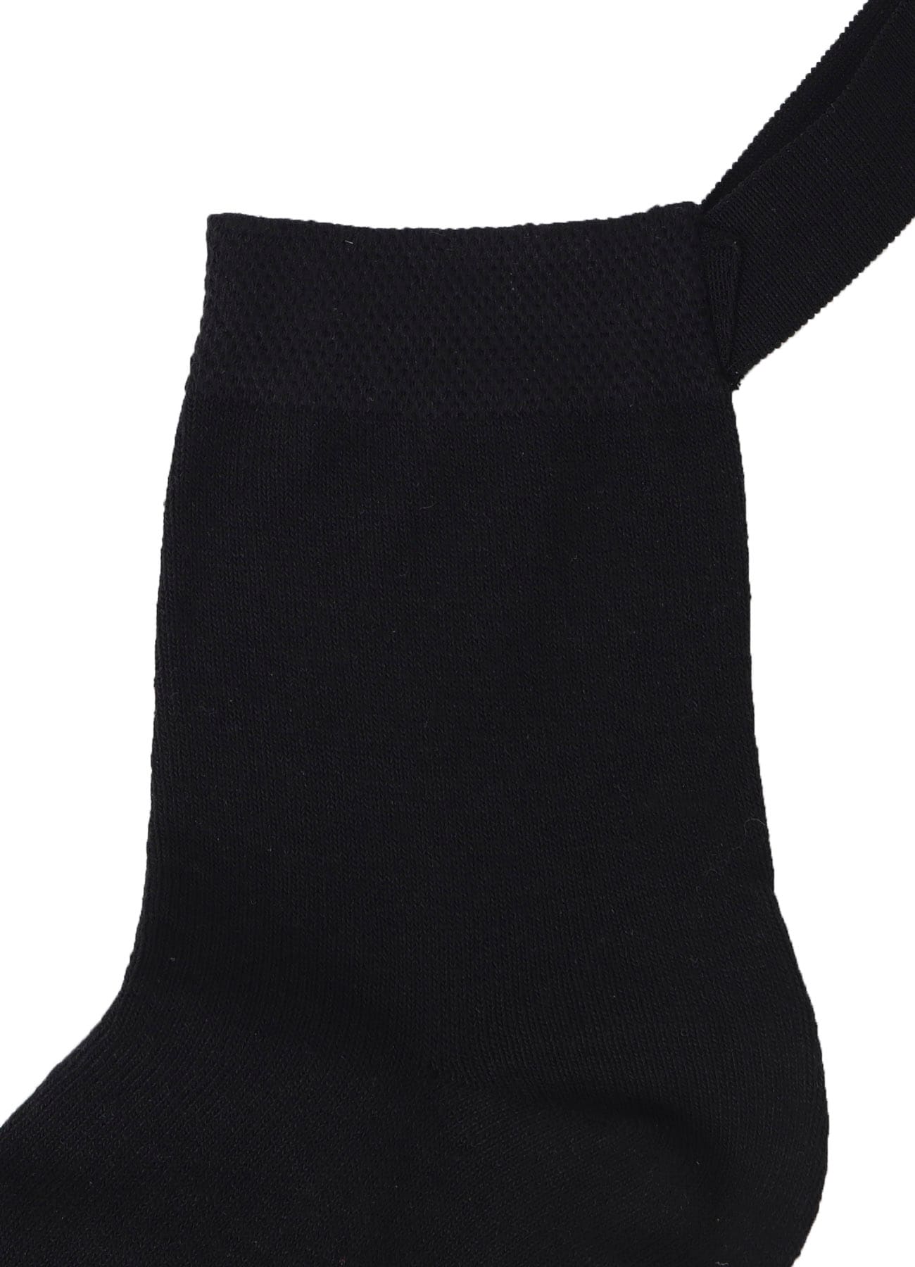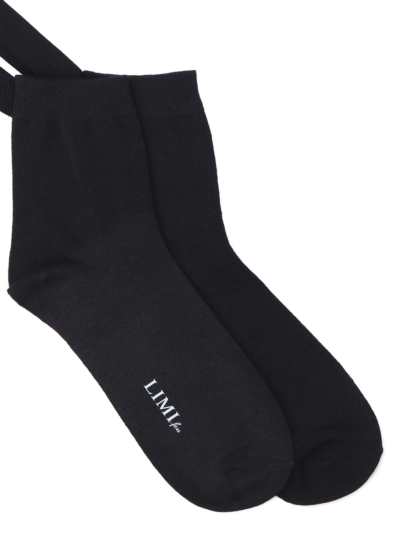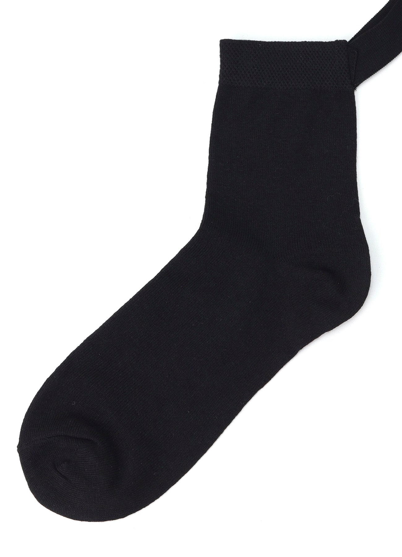 薄手のコットンソックスに、伸縮性のあるリボンテープで編み上げています。以前に登場した編み上げソックスのリボンをより長くしています。リボンの端には金属のチップを施しています。