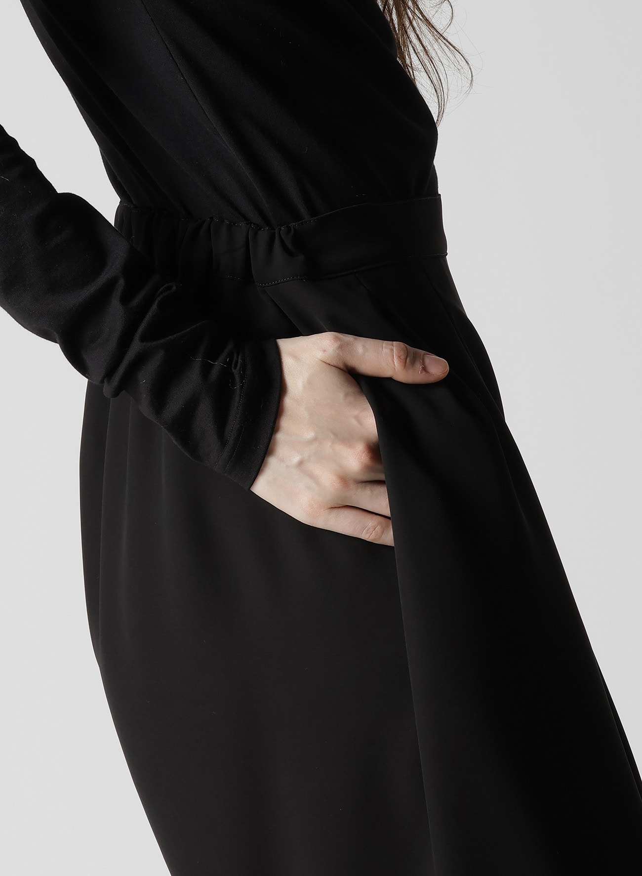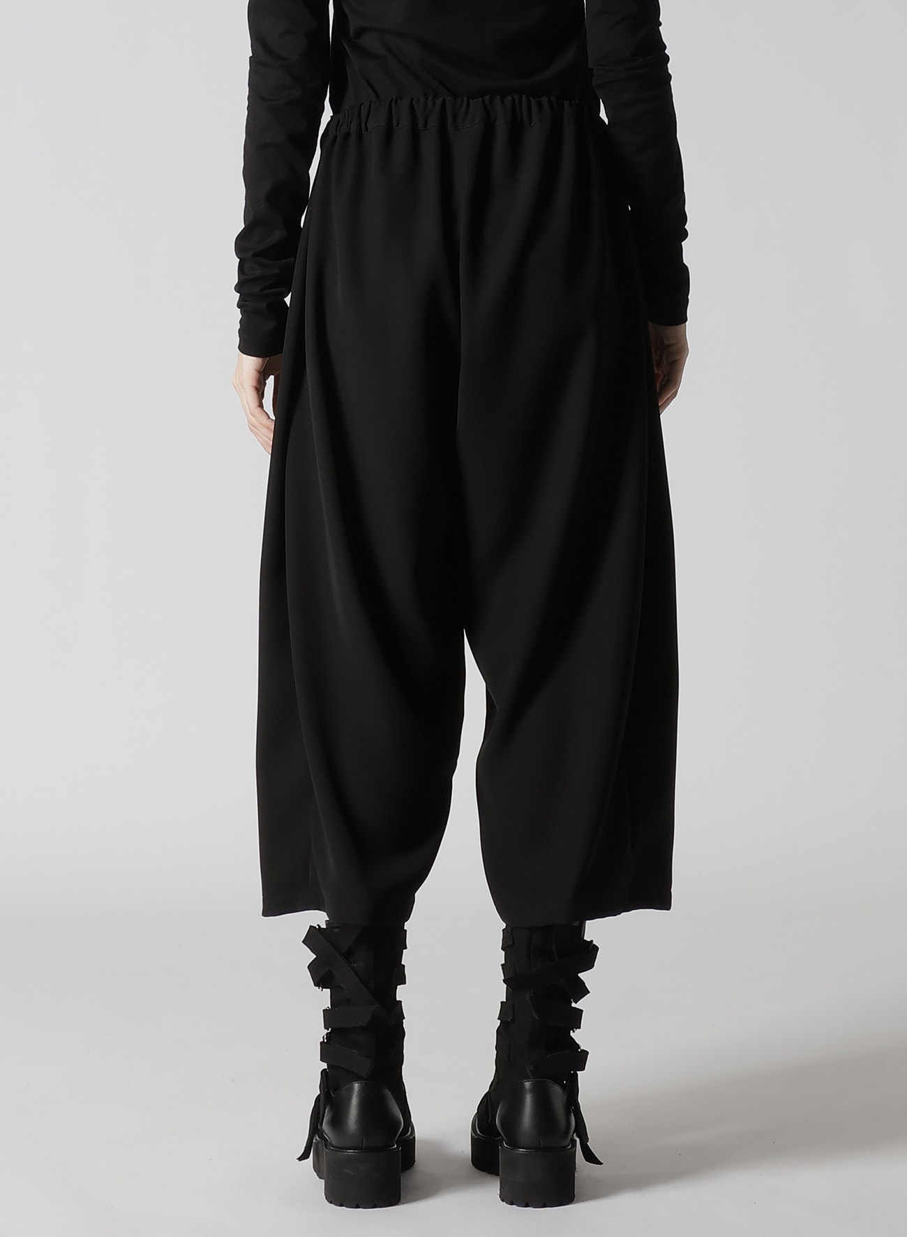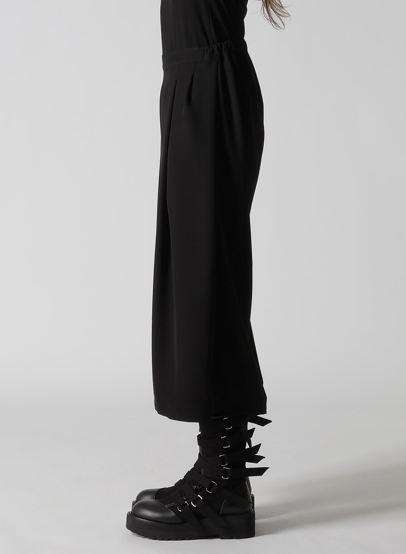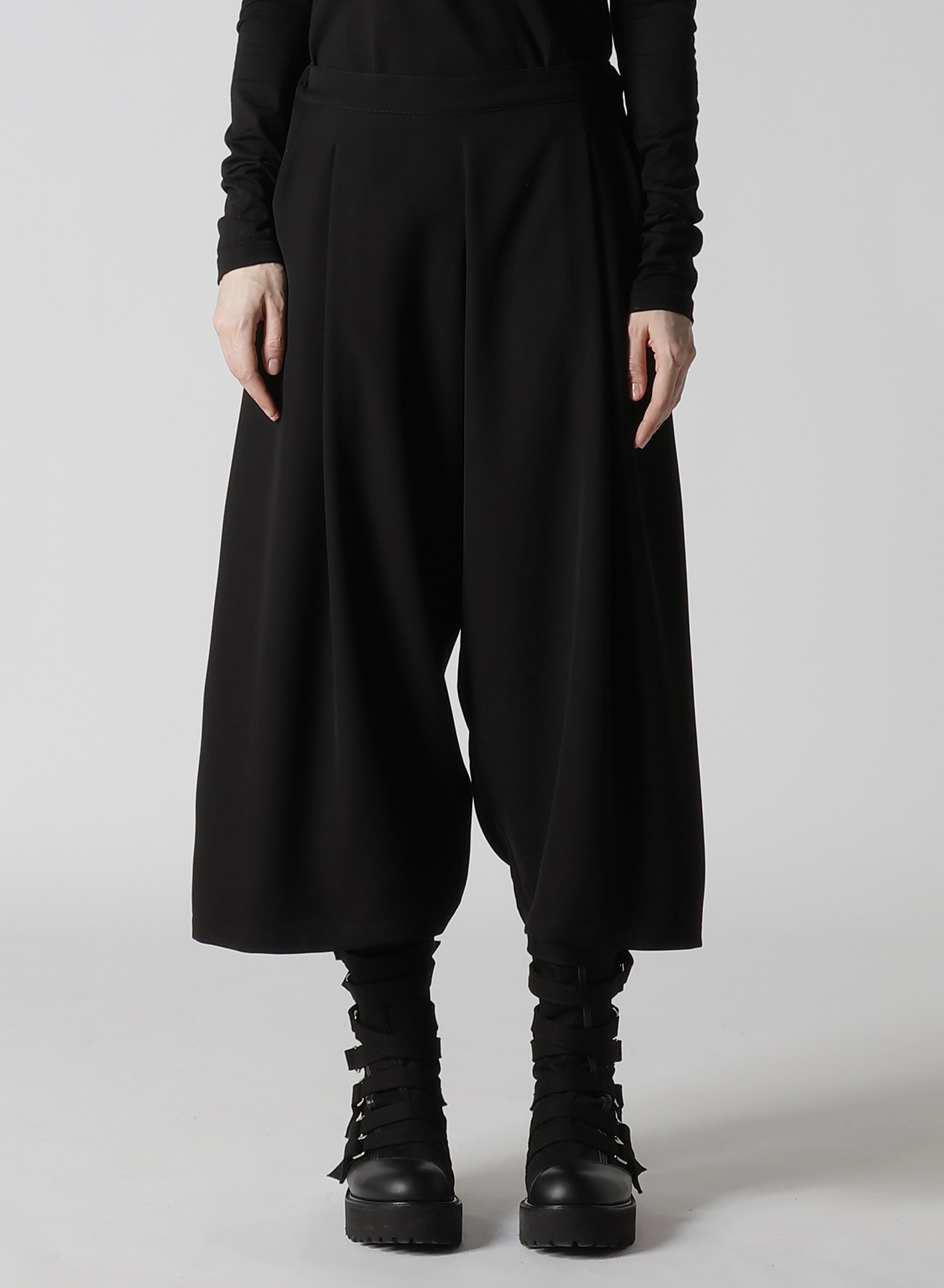 ポリエステルの中肉のダブルサテンです。しっかりとしていながら、ストレッチ性と反発感、軽やかさが特徴です。またバックサテンで滑りもよく、肌触りもサラッとした着心地の良い生地です。また濃染加工により深みのある黒に仕上げています。ストレートシルエットのワイドパンツです。ベーシックな形で使いやすく、八分丈の着丈がブーツなどとも合わせやすいアイテムです。