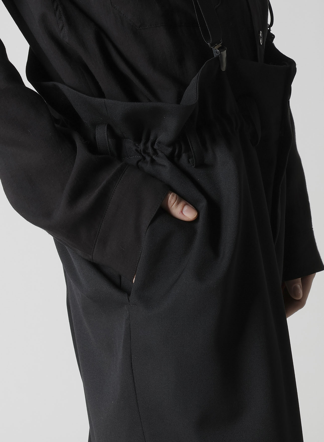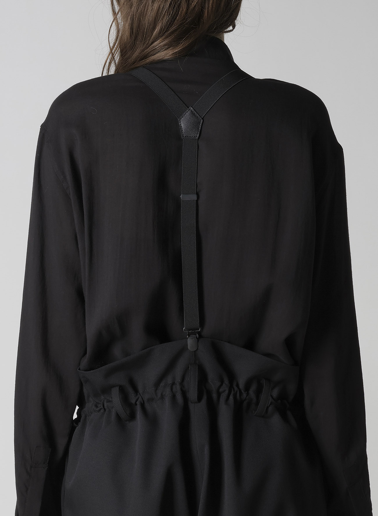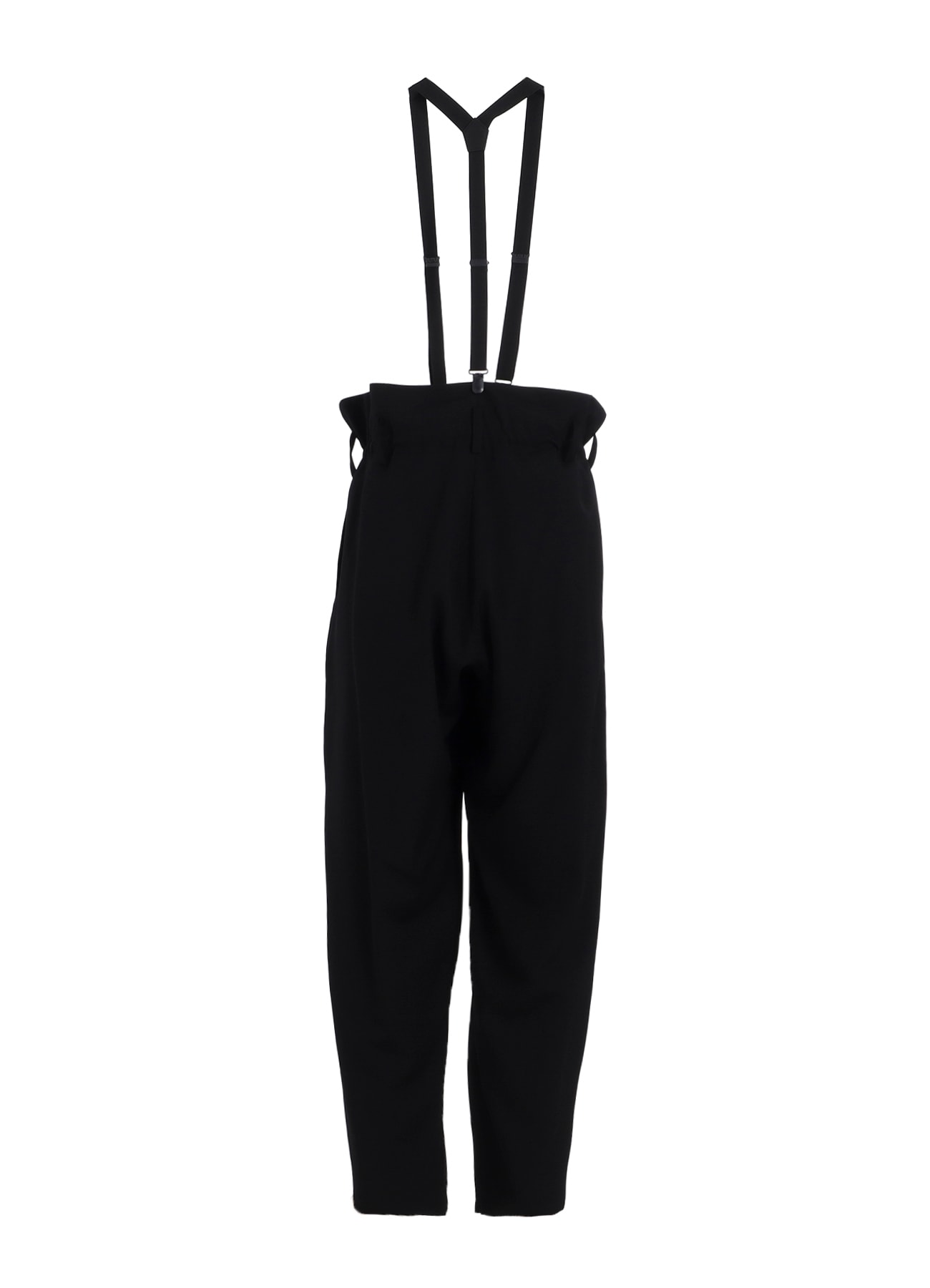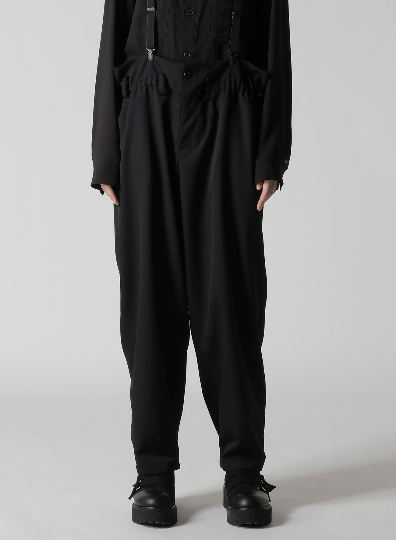 綺麗な目風のしなやかな落ち感と柔らかい肌触りが特徴のギャバジンです。サスペンダー付きのパンツです。裾にかけて細くなるテーパードのシルエットです。股下が深くストレスフリーでご着用頂けます。