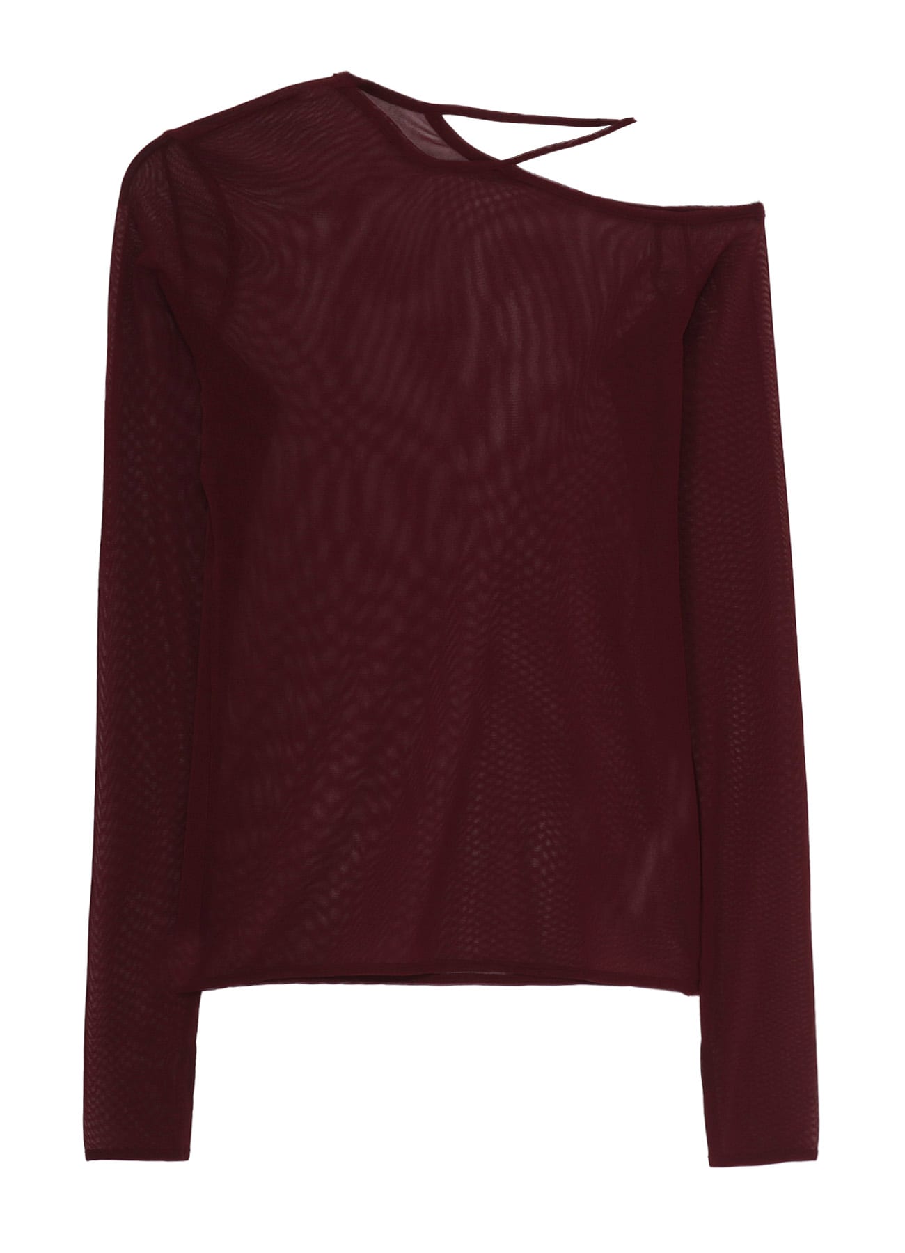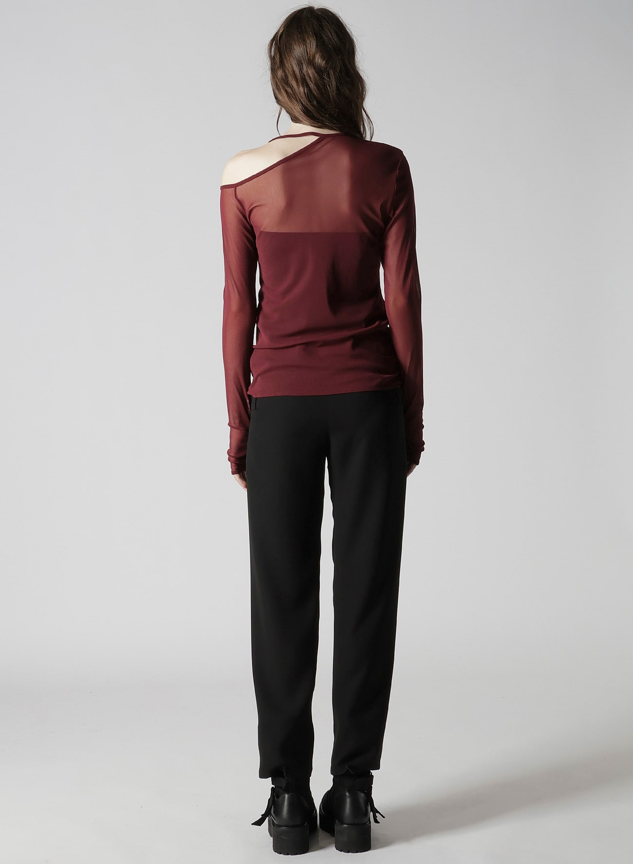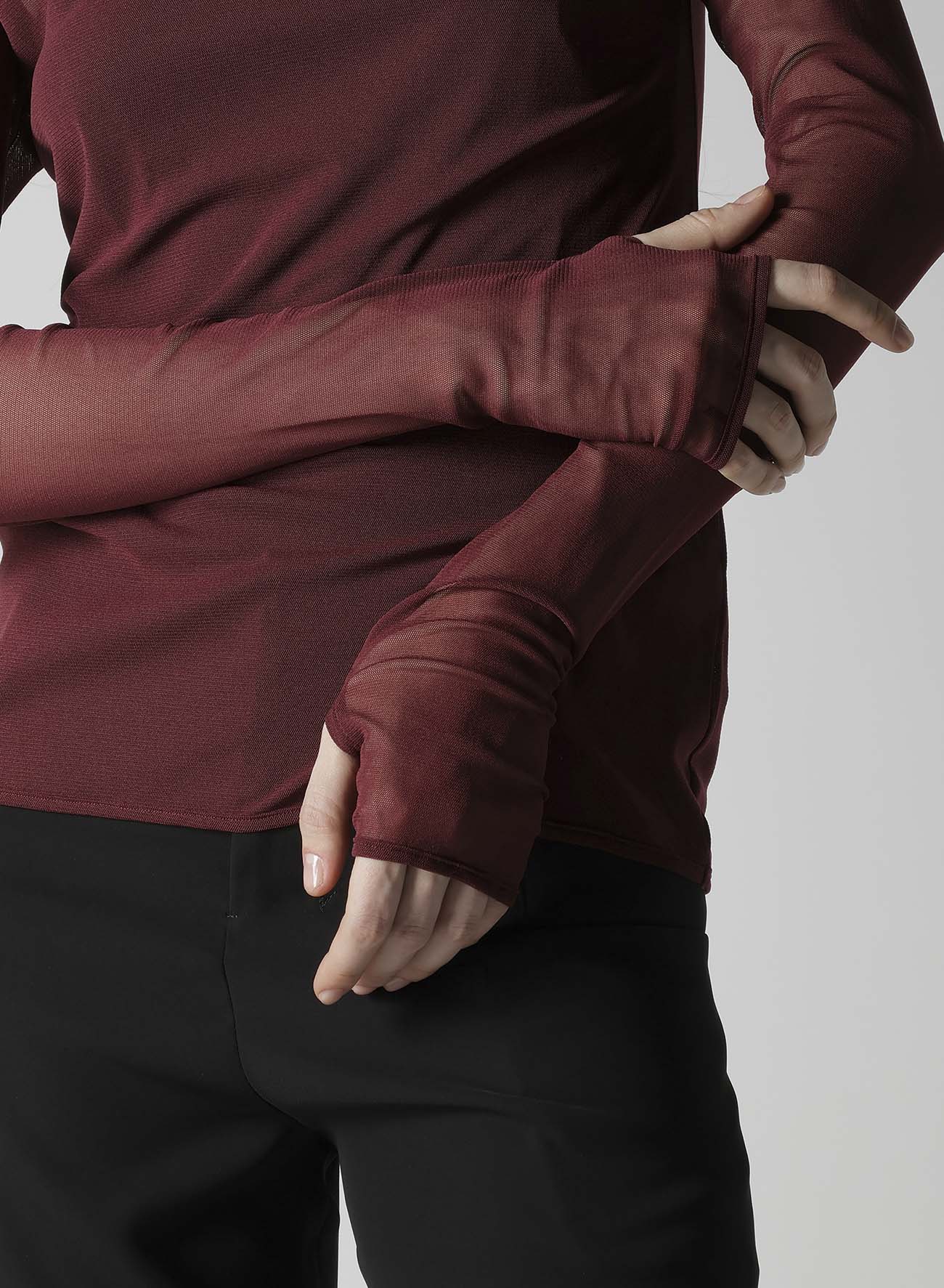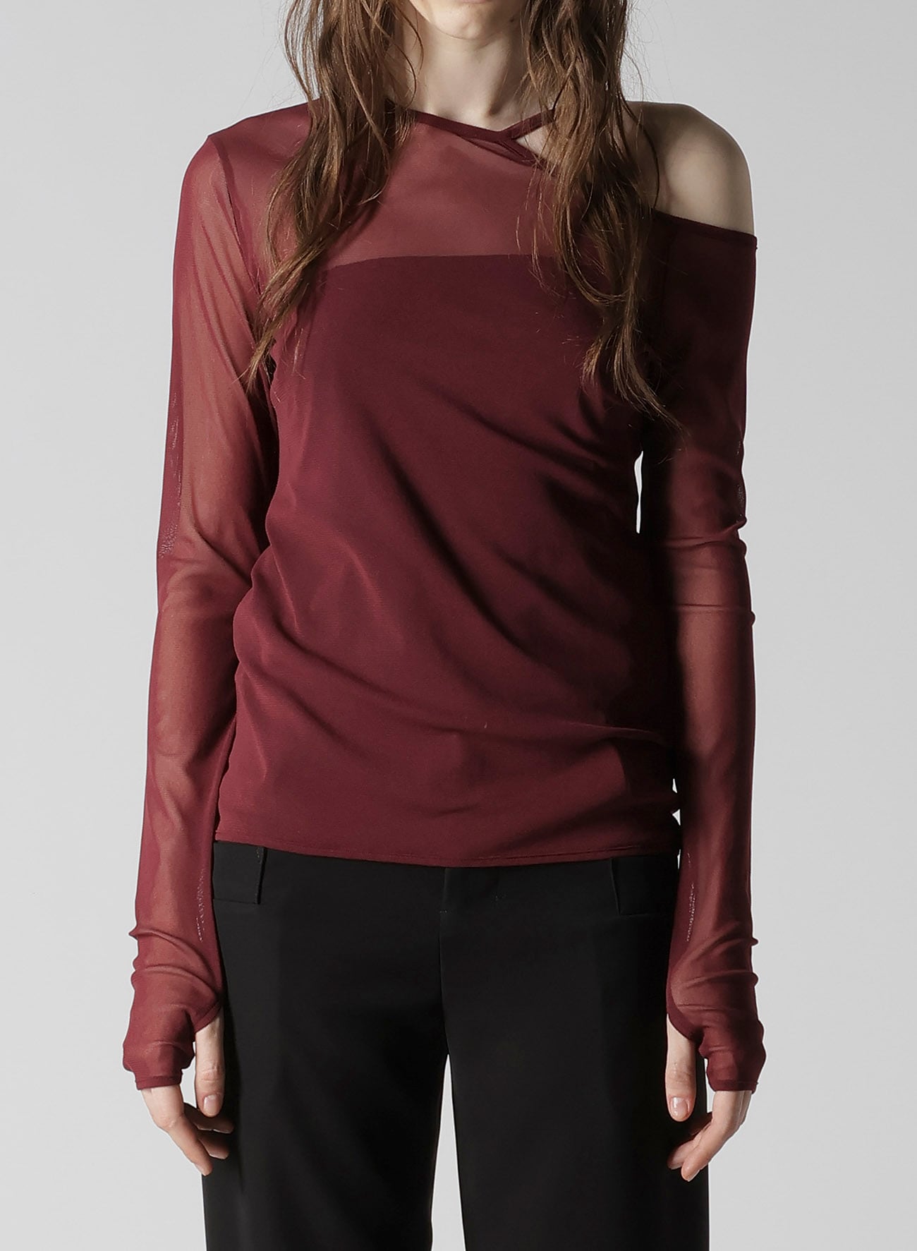 あらゆる方向へ伸縮可能なチュール素材です。伸縮性、形状安定性に優れ、非常に軽い素材の為、着用時のストレスを緩和します。肩出しデザインのカットソーは、片側のみの肌見せでヘルシーな印象でお召しいただけます。袖口は親指が出せる仕様です。