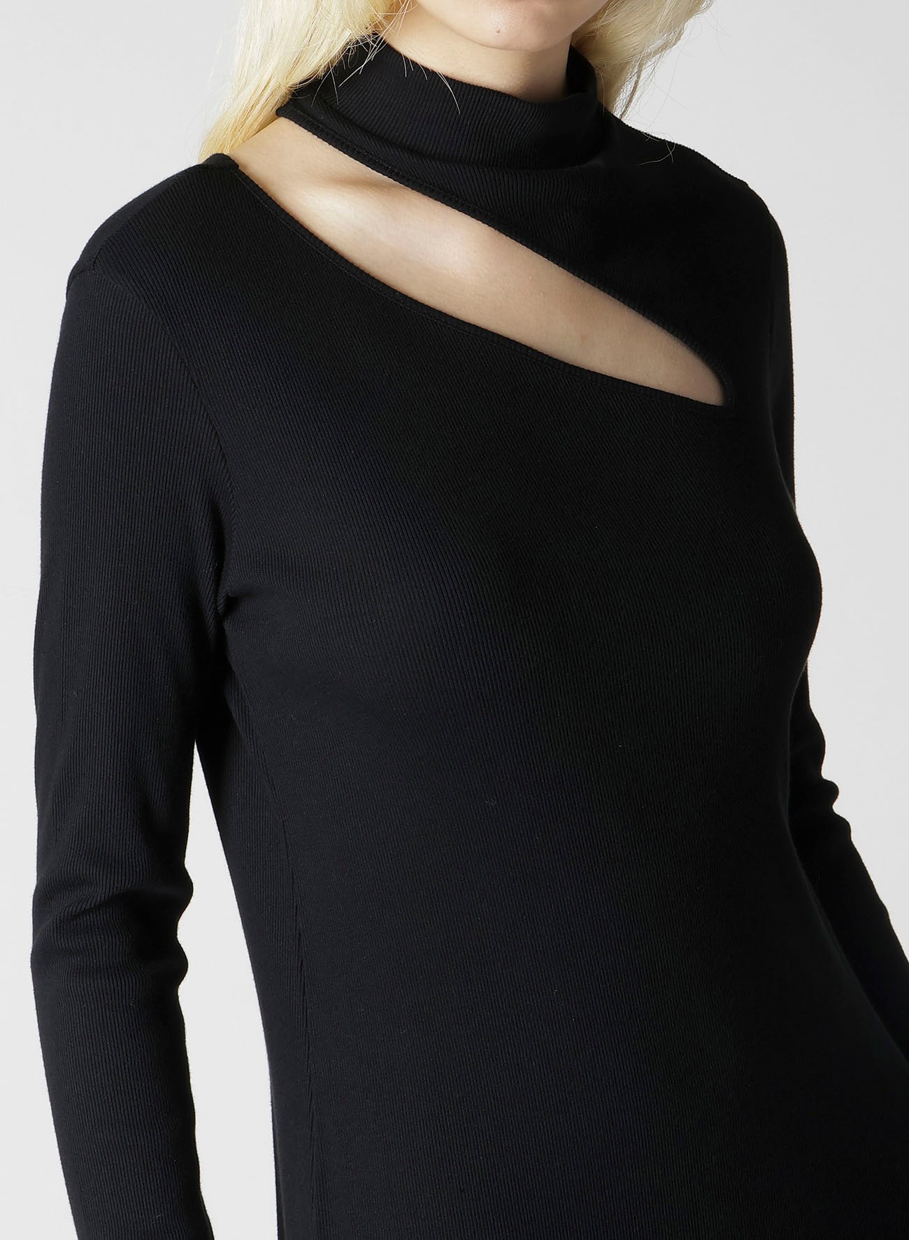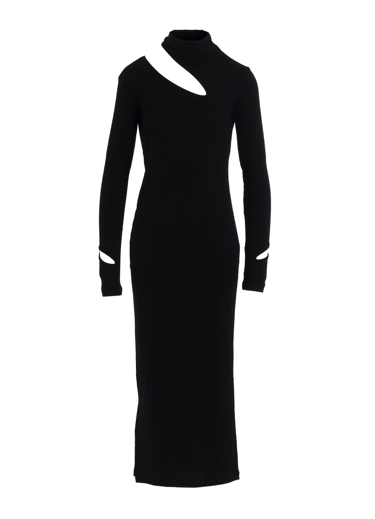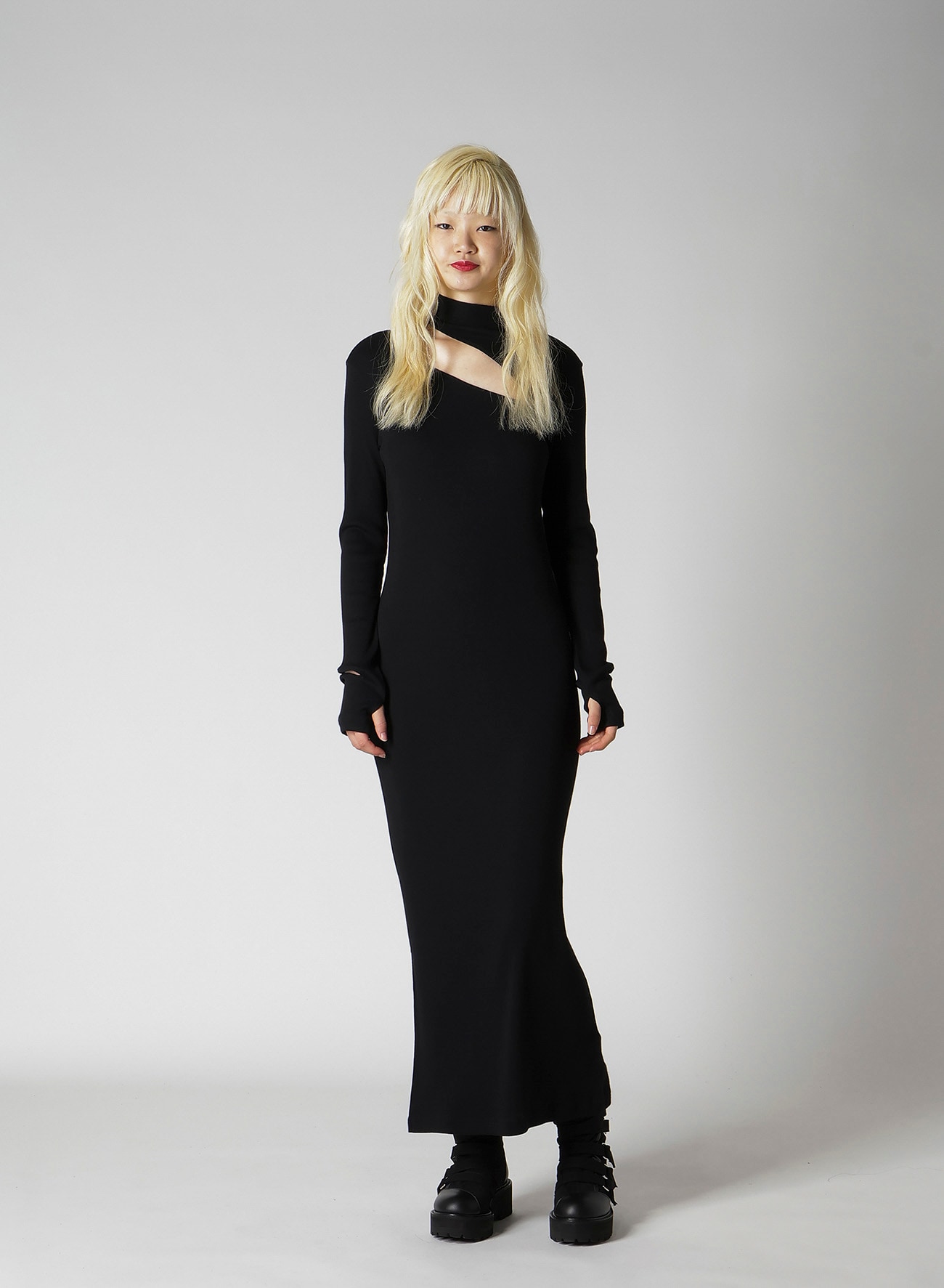 綿とレーヨンのブレンドにより、柔らかく、肌触りの良い生地に仕上がっています。ナチュラルなフィット感により、着心地が良いです。首元、袖口にスリットが施されたロングワンピースは、タイトな着用感です。中にシアーのインナーを重ねて頂くことで露出を軽減できます。