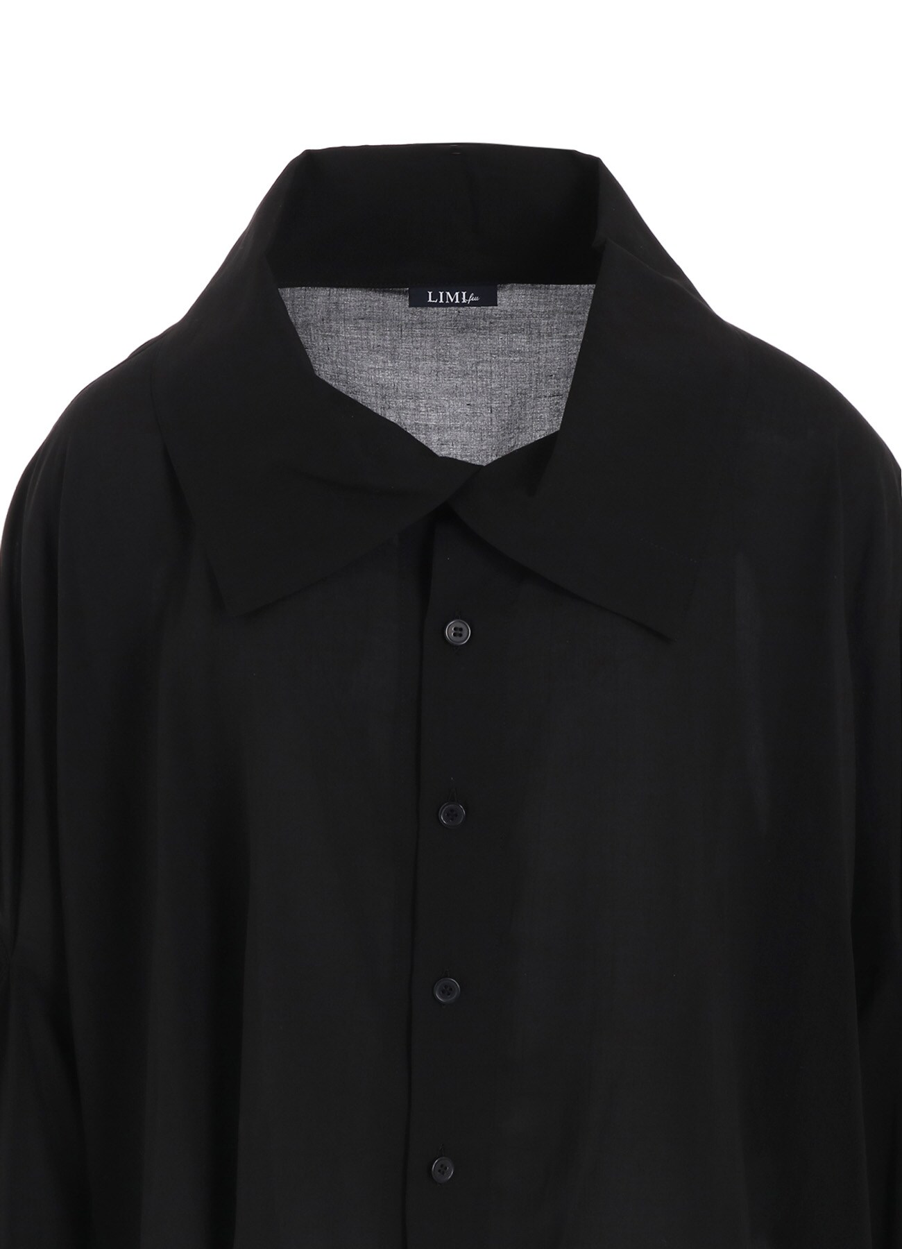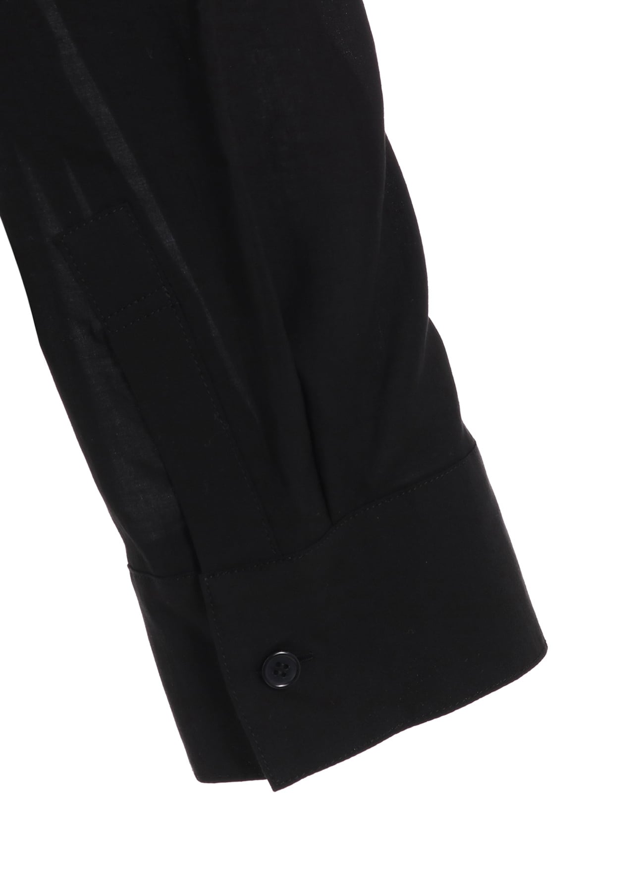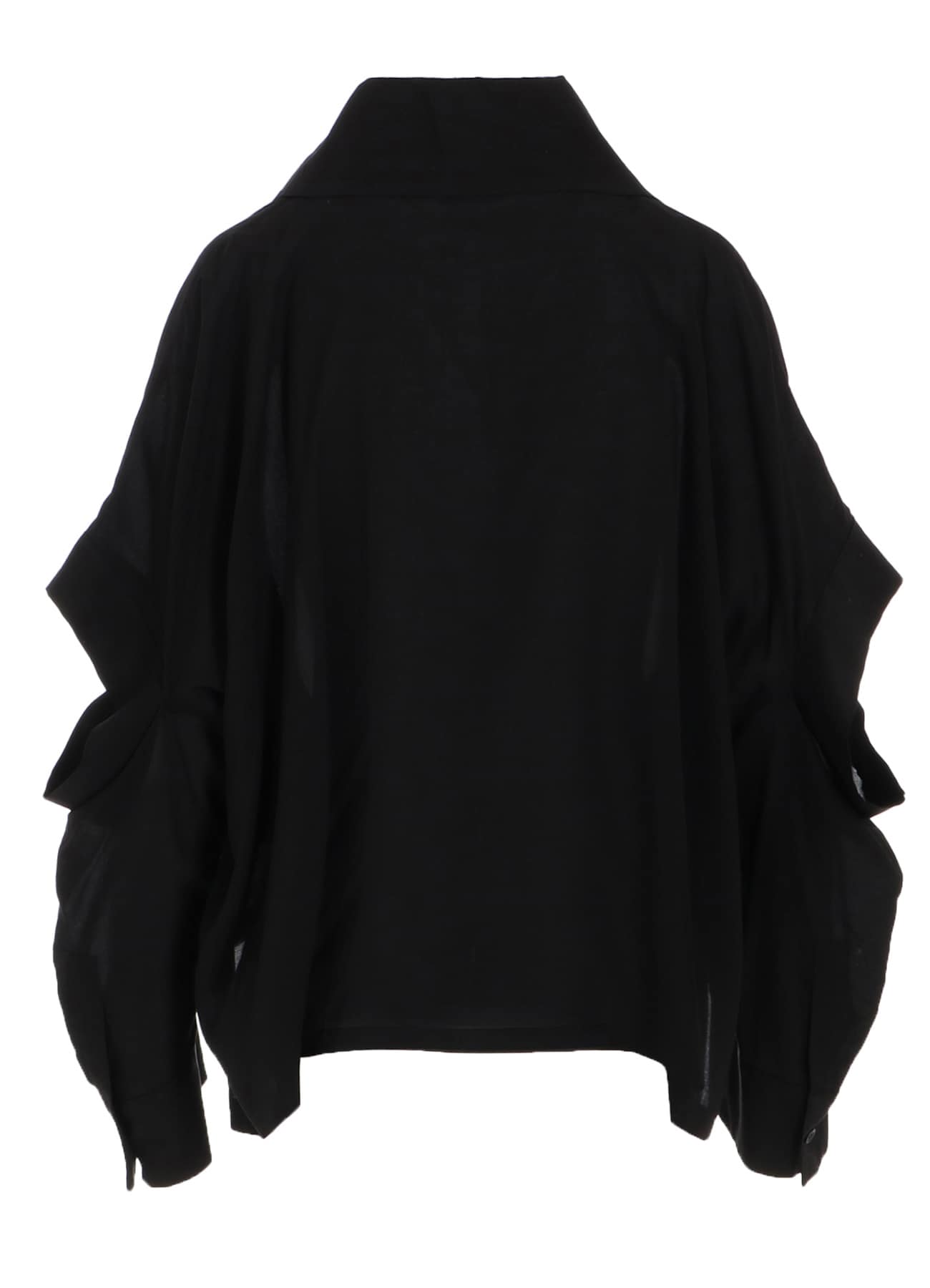 柔らかく、微光沢があり、軽やかなドレープ性のある肌触りの良い生地です。大きめの襟はスタンドカラーの雰囲気があり存在感があります。スリットデザインの袖は、着用した状態から肘下部分を裏返すように身頃部分へ収納すると半袖シャツとしてご着用頂けます。