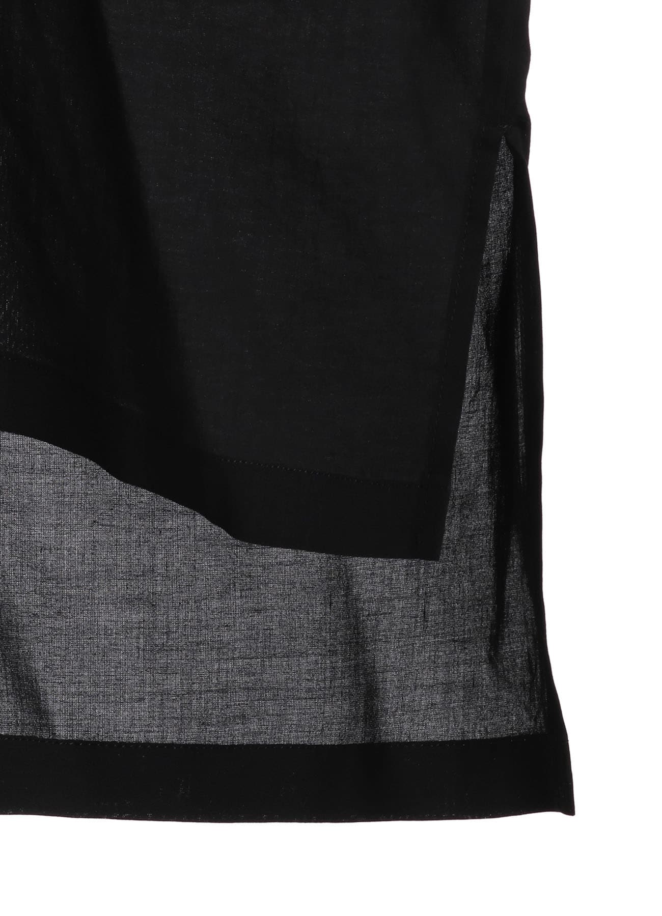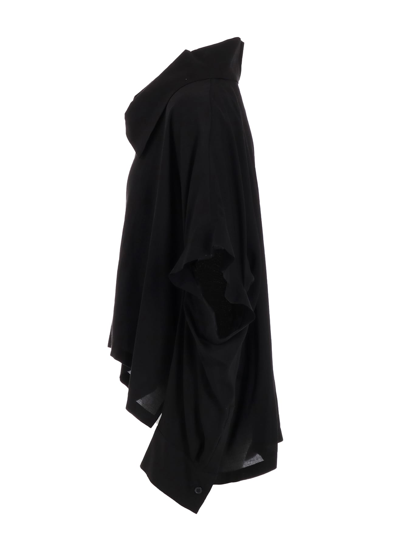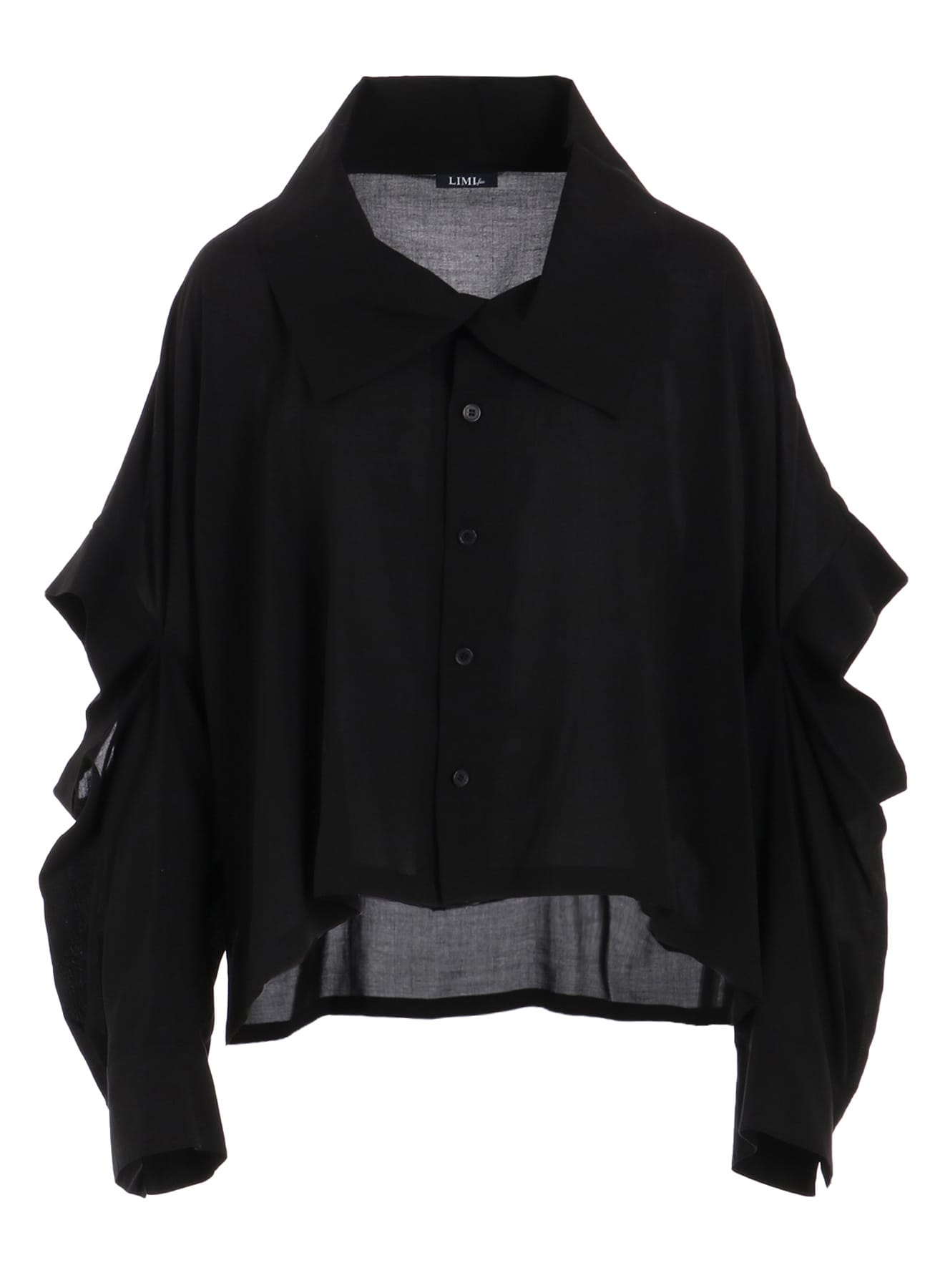 柔らかく、微光沢があり、軽やかなドレープ性のある肌触りの良い生地です。大きめの襟はスタンドカラーの雰囲気があり存在感があります。スリットデザインの袖は、着用した状態から肘下部分を裏返すように身頃部分へ収納すると半袖シャツとしてご着用頂けます。