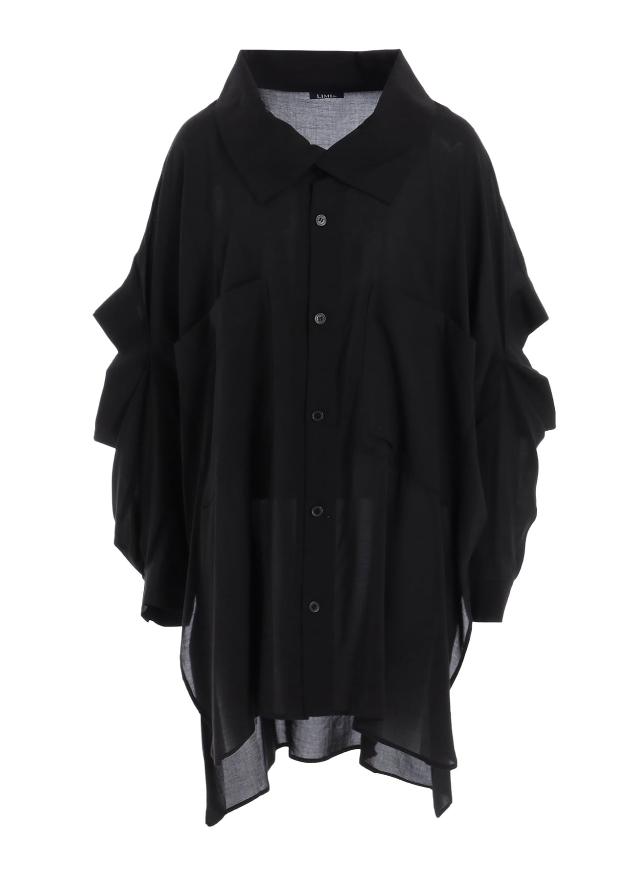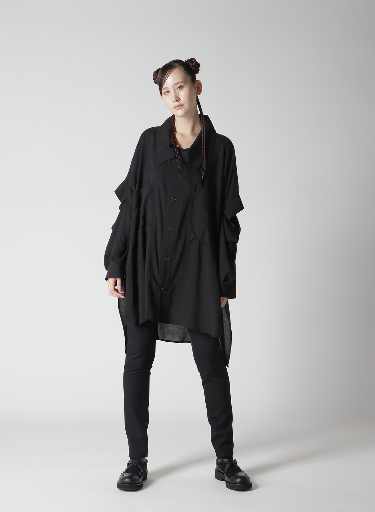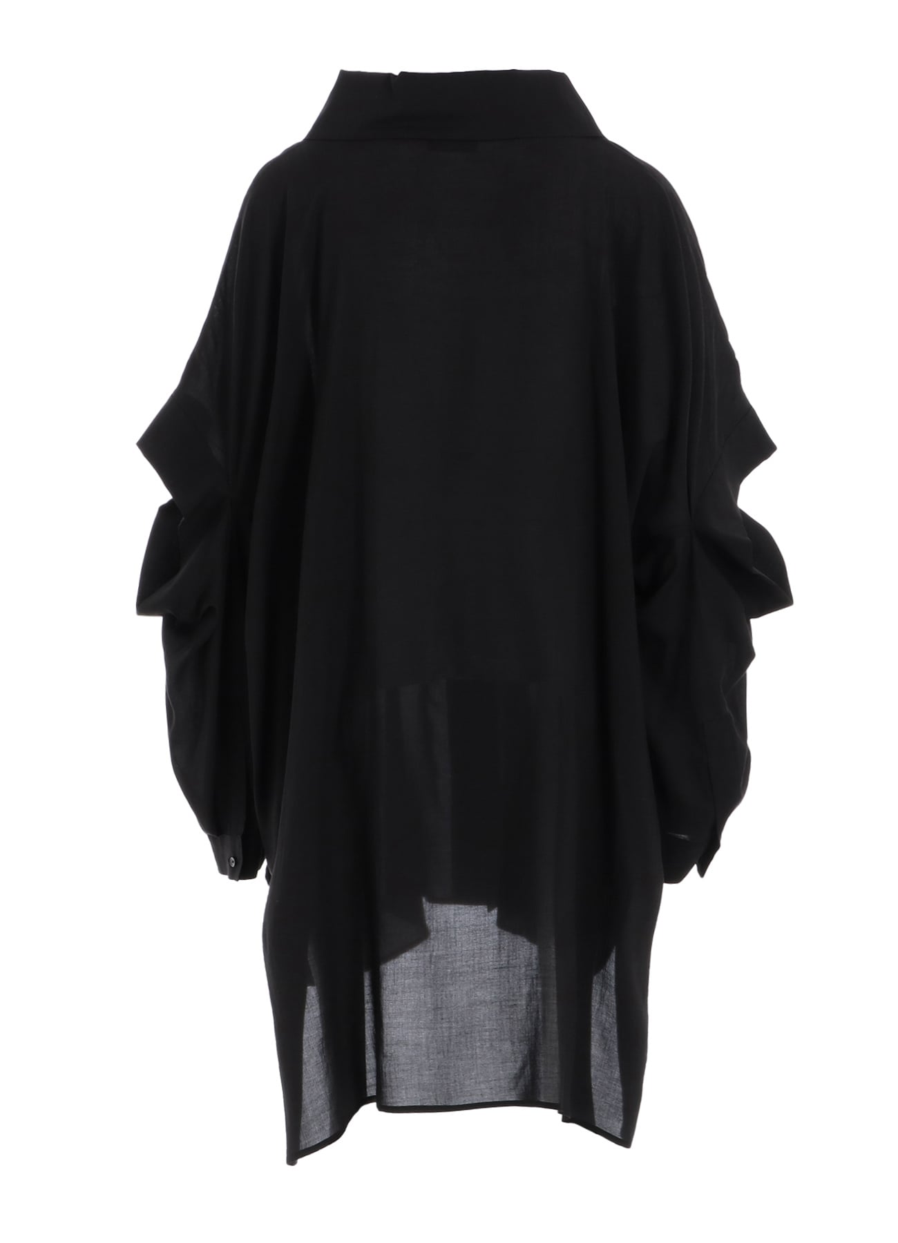 柔らかく、微光沢があり、軽やかなドレープ性のある肌触りの良い生地です。大きめの襟はスタンドカラーの雰囲気があり存在感があります。スリットデザインの袖は、着用した状態から肘下部分を裏返すように身頃部分へ収納すると半袖シャツとしてご着用頂けます。