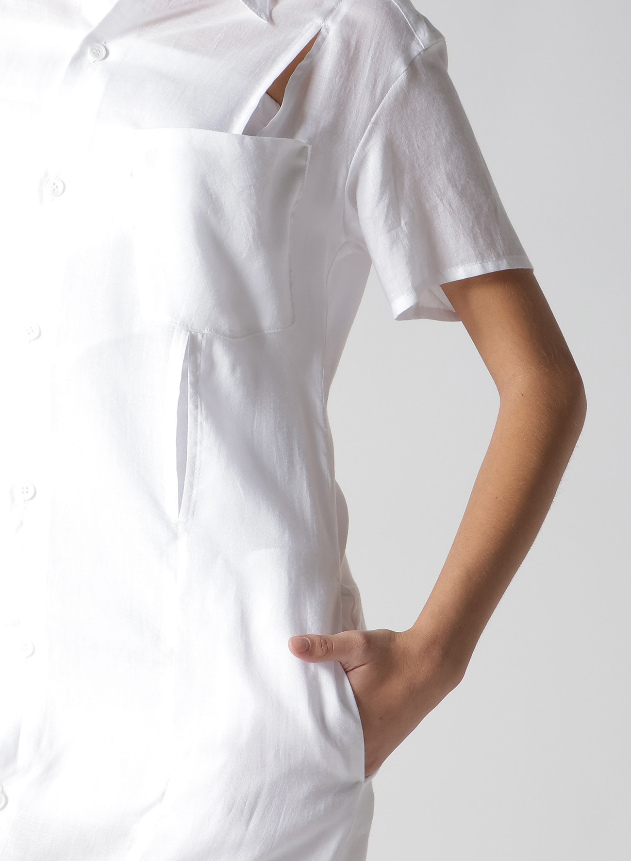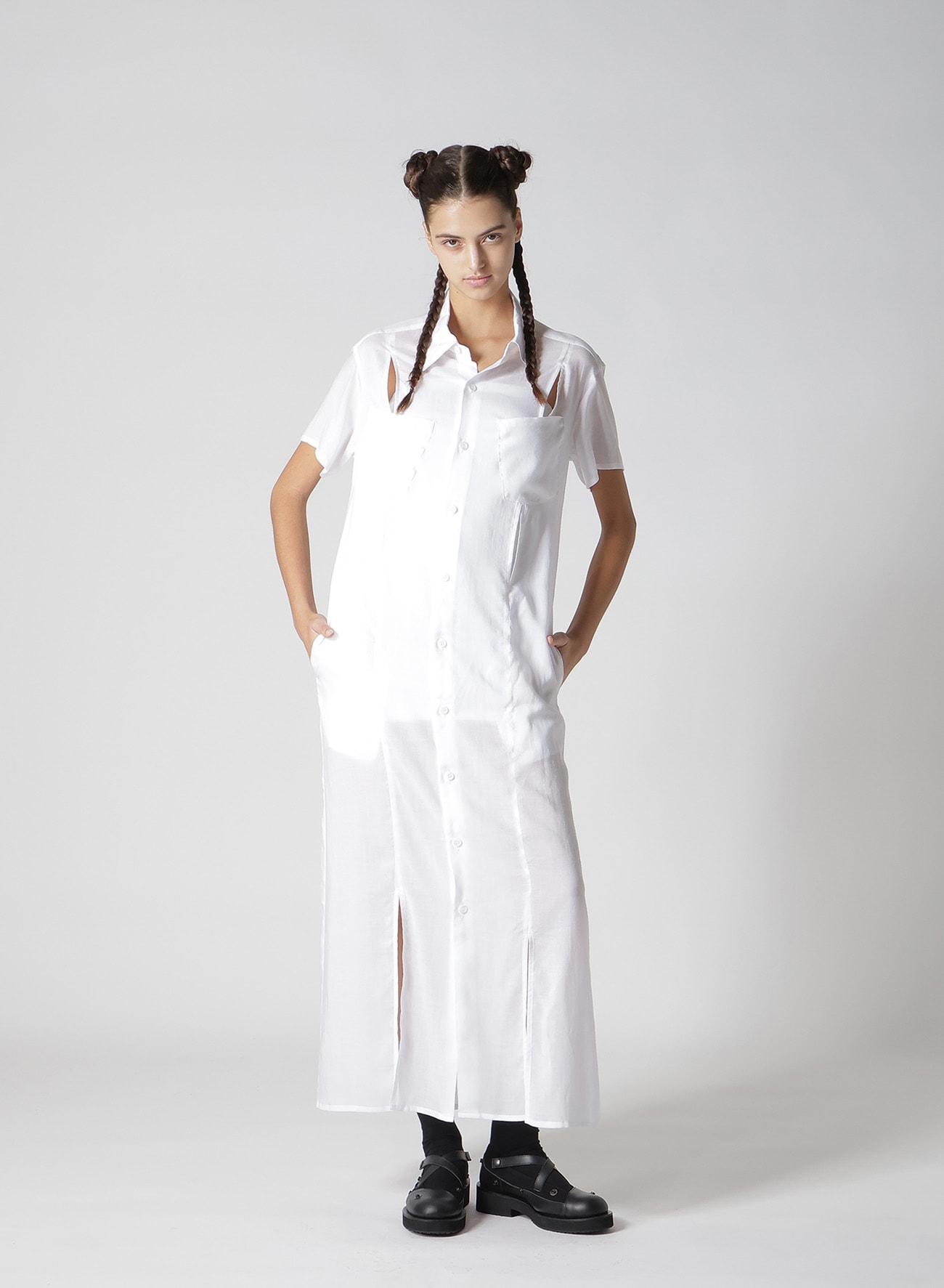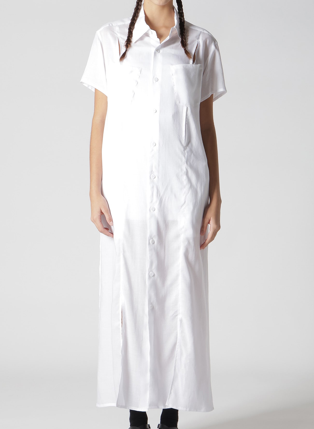 ¥79200柔らかく、微光沢があり、軽やかなドレープ性のある肌触りの良い生地です。裾にスリットが施され、ストレートのロングシャツに動きが生まれます。薄手の生地でレイヤードのスタイリングにも取り入れやすくおすすめです。