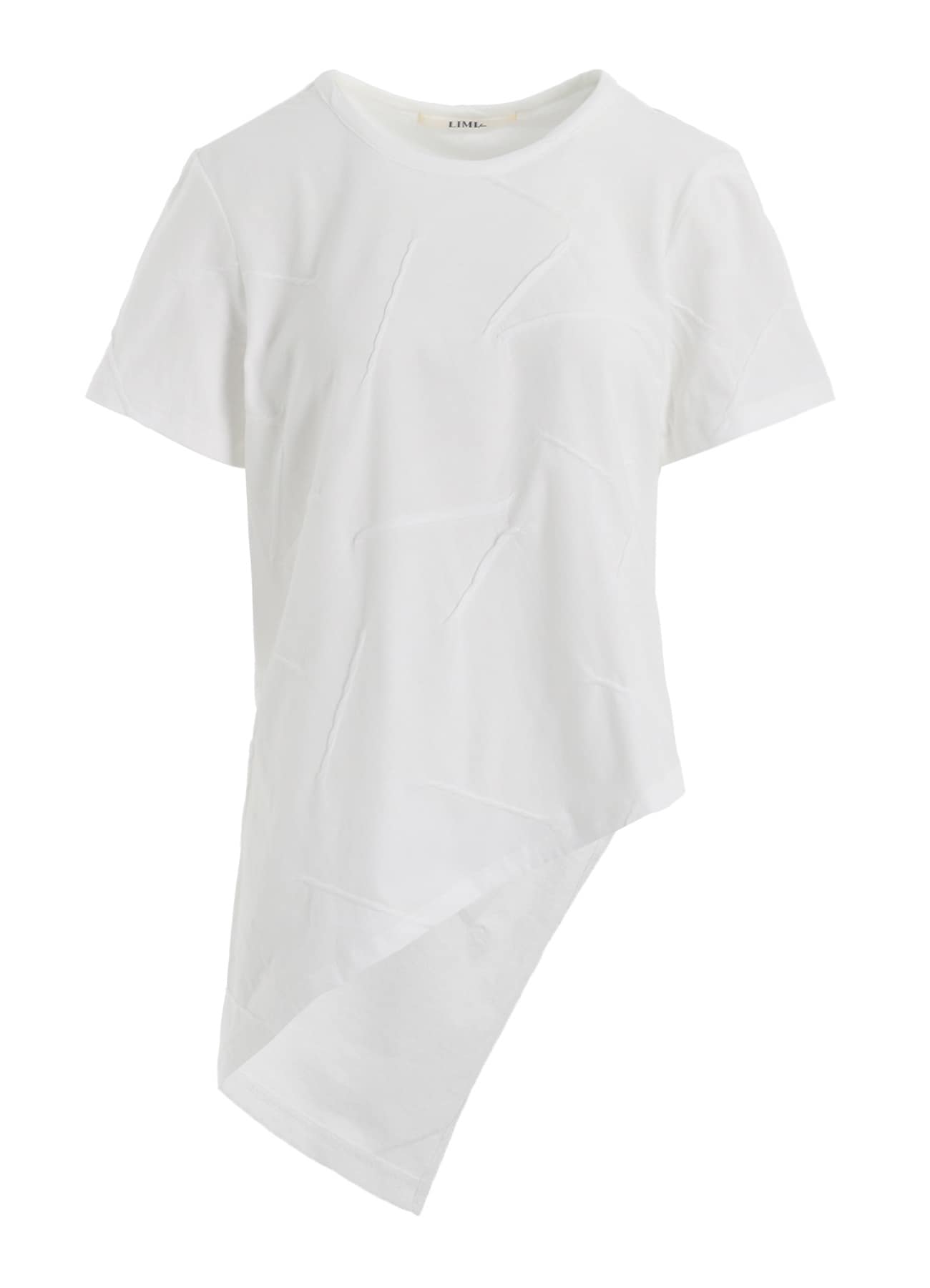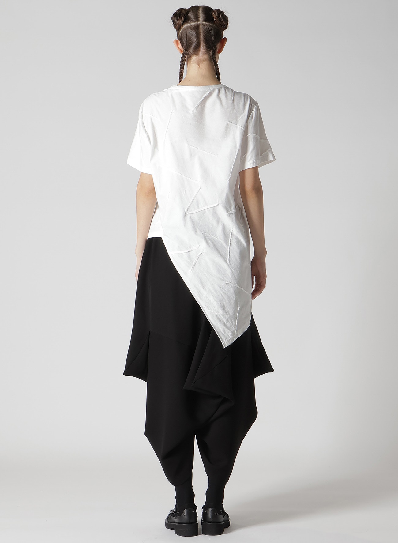 毛羽が少なく、光沢感と柔らかな風合いが特徴の綿コーマ糸を使用しています。ランダムに配置されたタック部分は編み立てが難しく、糸切れが起きないように特殊な機能を使用して編んでいます。シンプルな見た目ながらも、細部にまでこだわって編み立てたジャガードです。アシンメトリーのデザインがシンプルながらも角度によっての表情を変え、幅広いコーディネートにお使い頂けるカットソーです。