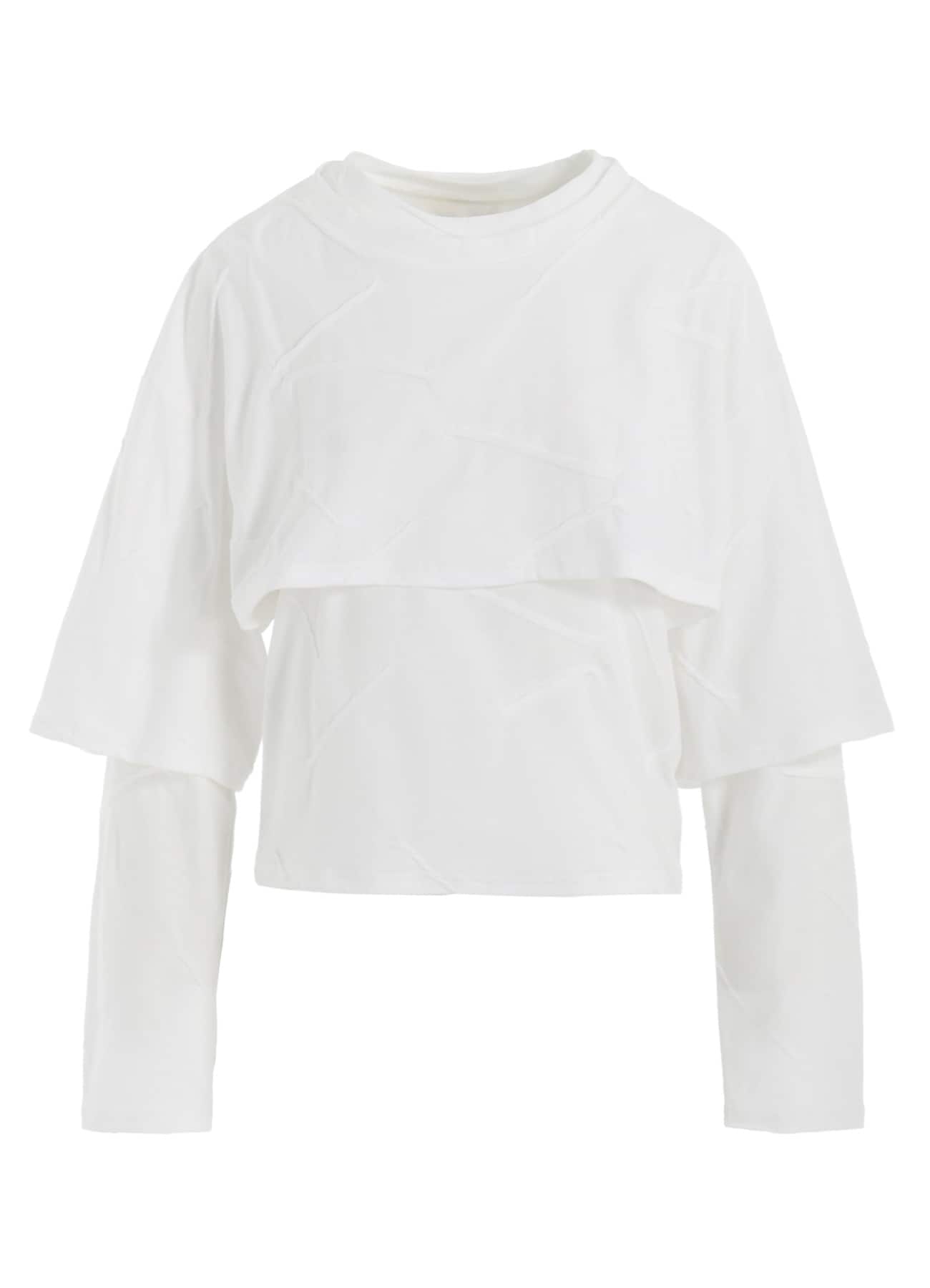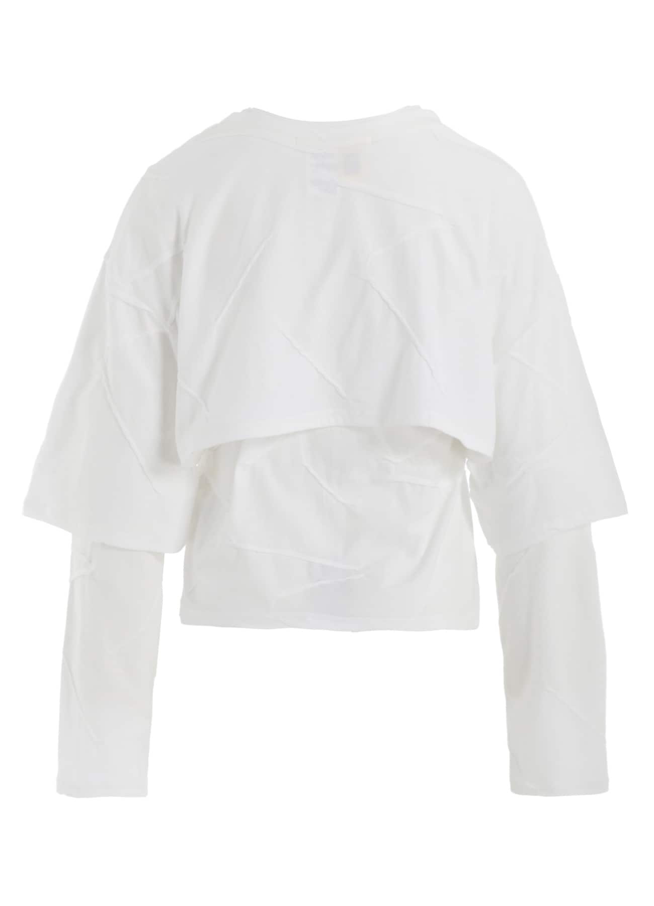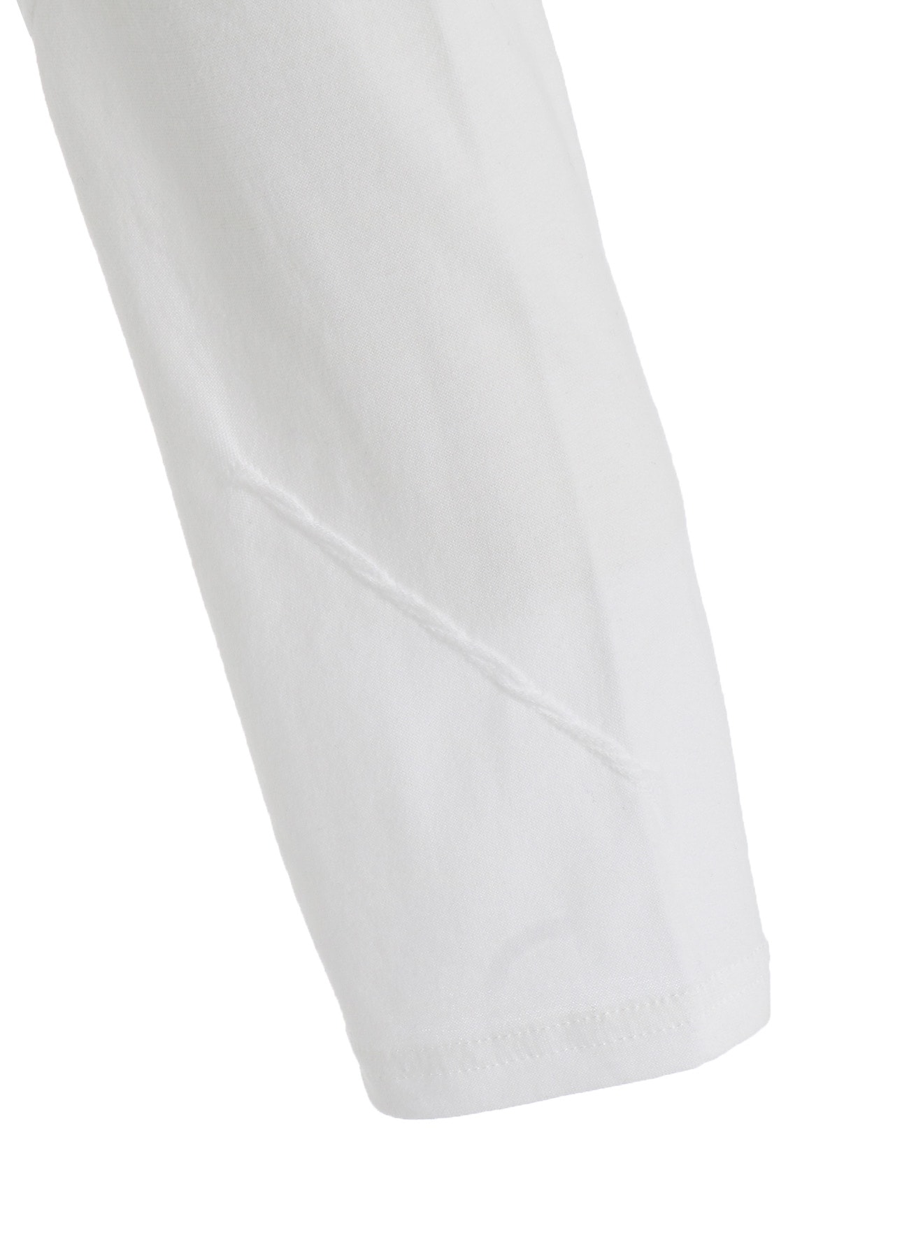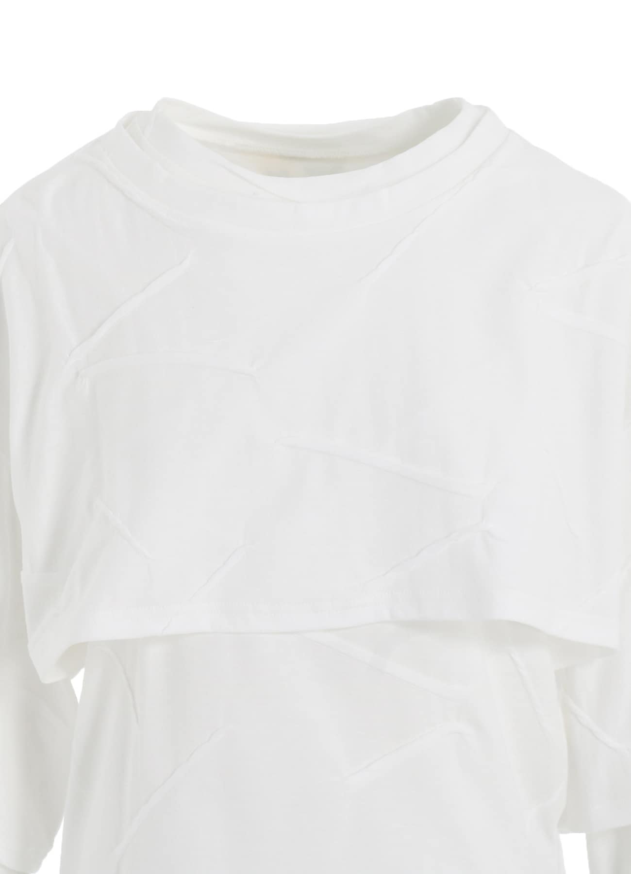 毛羽が少なく、光沢感と柔らかな風合いが特徴の綿コーマ糸を使用しています。ランダムに配置されたタック部分は編み立てが難しく、糸切れが起きないように特殊な機能を使用して編んでいます。シンプルな見た目ながらも、細部にまでこだわって編み立てたジャガードです。レイヤードデザインの為、別々にご着用頂く事ができ、別のカットソーとのレイヤードでもご着用頂けます。