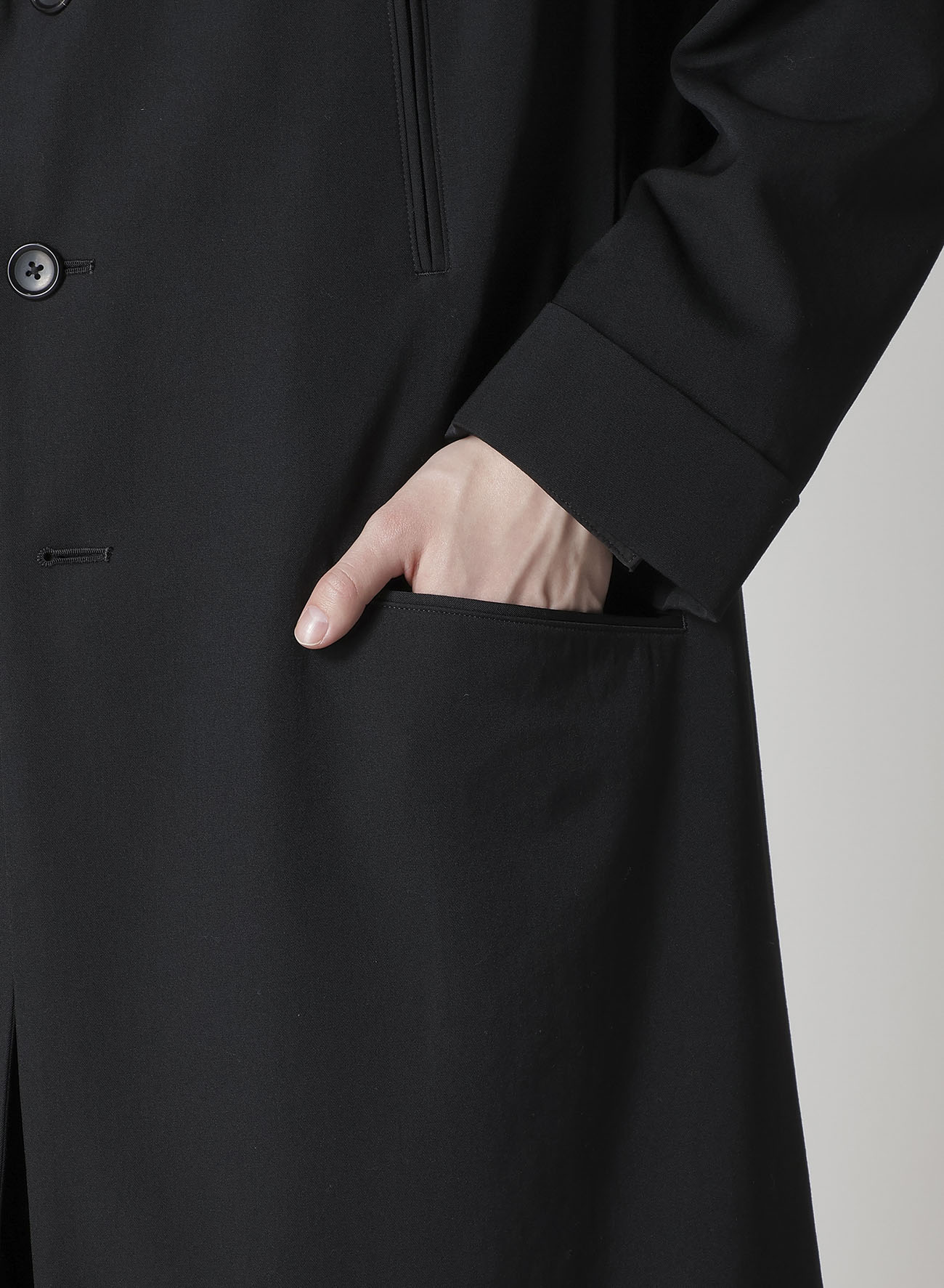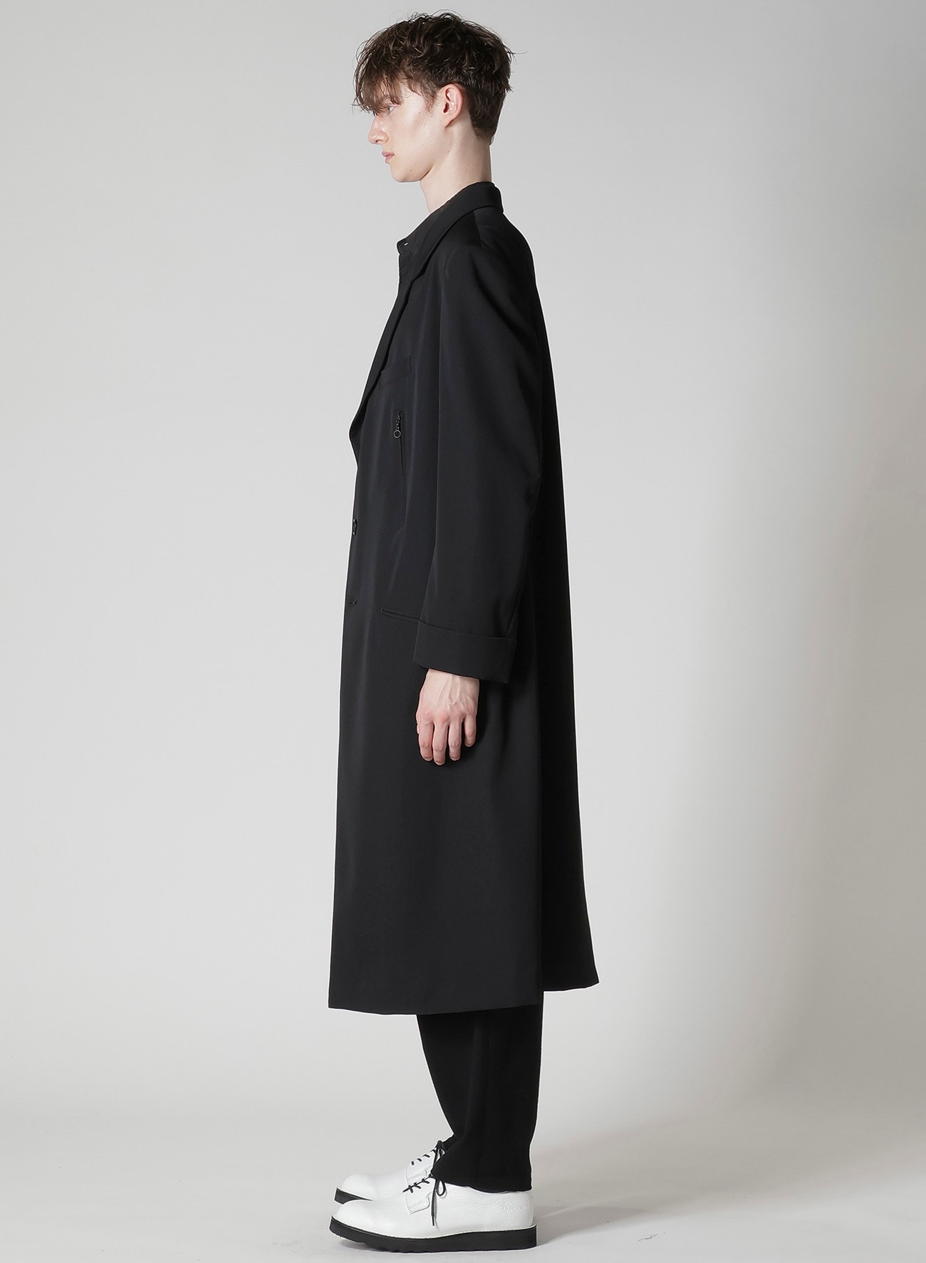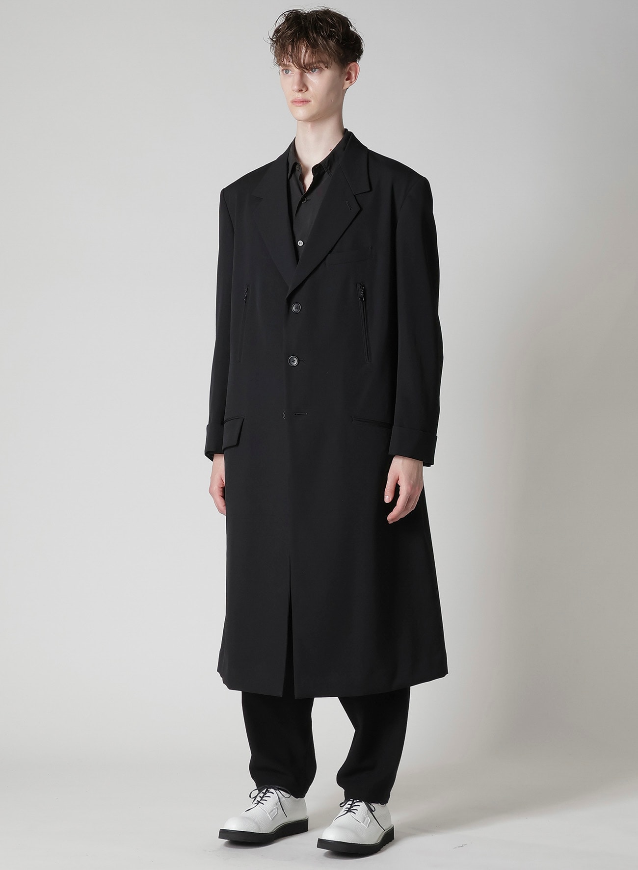 生地は、仕上げの工程でセット性を弱くすることにより織物に軽くシワやシボを付け、ウール本来の風合いに仕上げたヨウジヤマモト社の定番素材であるウールギャバジンを使用しています。袖口を折り返したマッキン仕立てのロングジャケットは、コートとしてもお召しいただけるたっぷりとした分量感が魅力です。