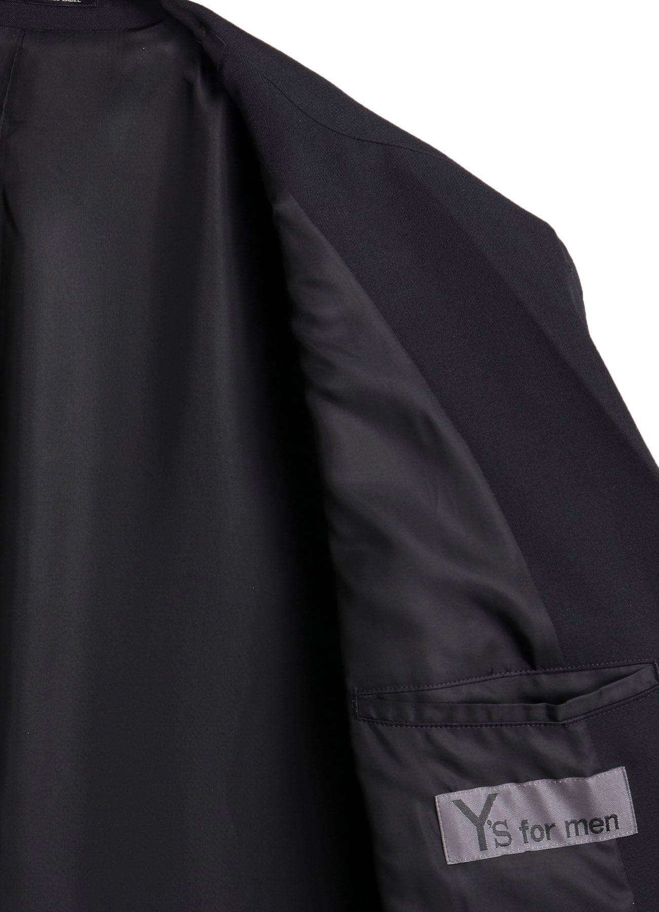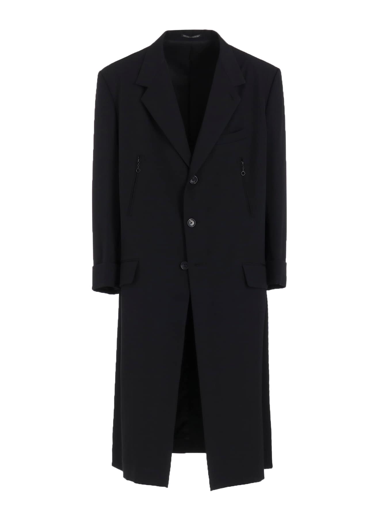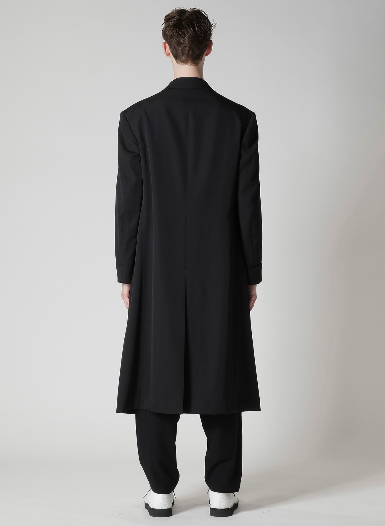 生地は、仕上げの工程でセット性を弱くすることにより織物に軽くシワやシボを付け、ウール本来の風合いに仕上げたヨウジヤマモト社の定番素材であるウールギャバジンを使用しています。袖口を折り返したマッキン仕立てのロングジャケットは、コートとしてもお召しいただけるたっぷりとした分量感が魅力です。