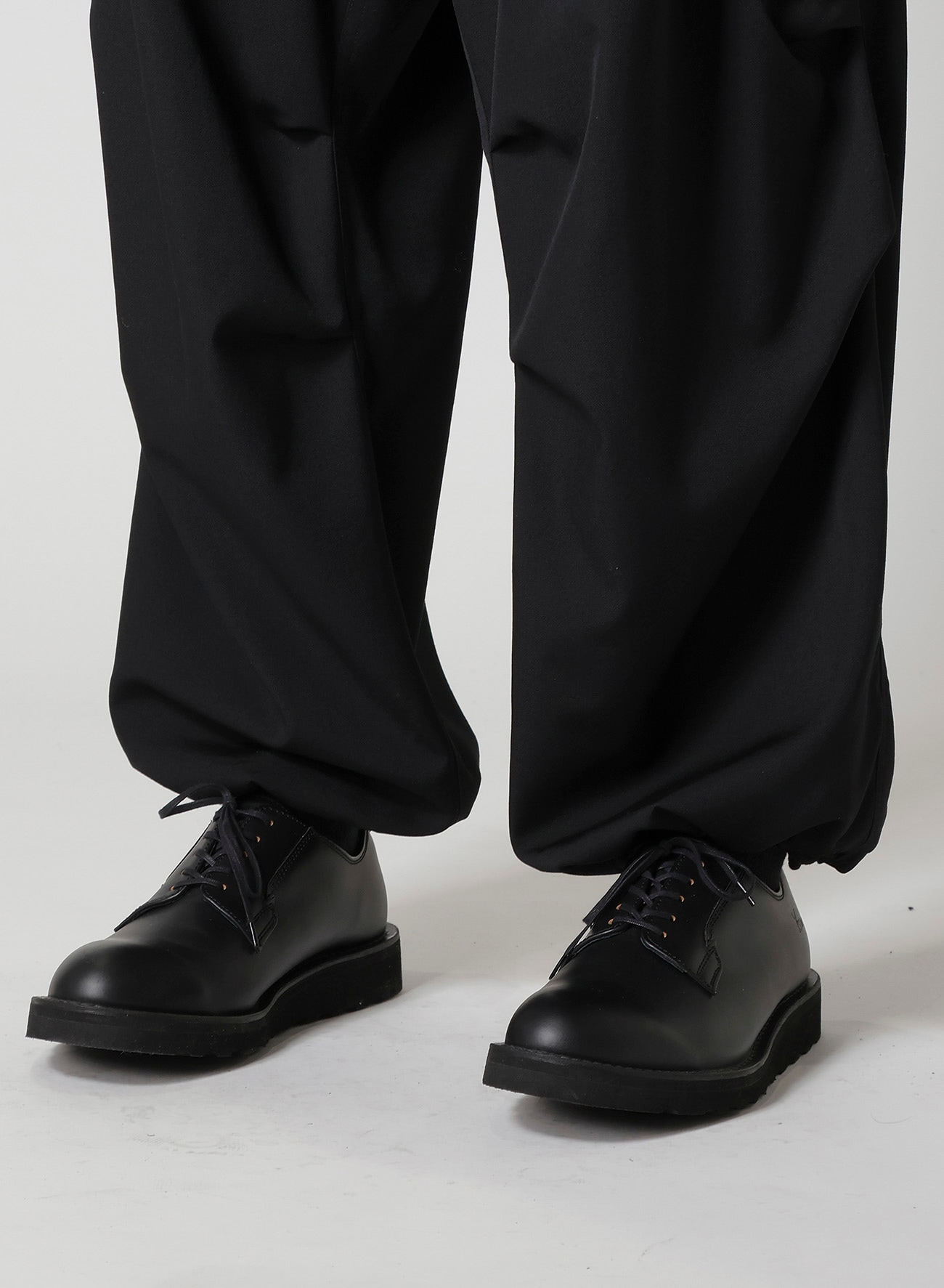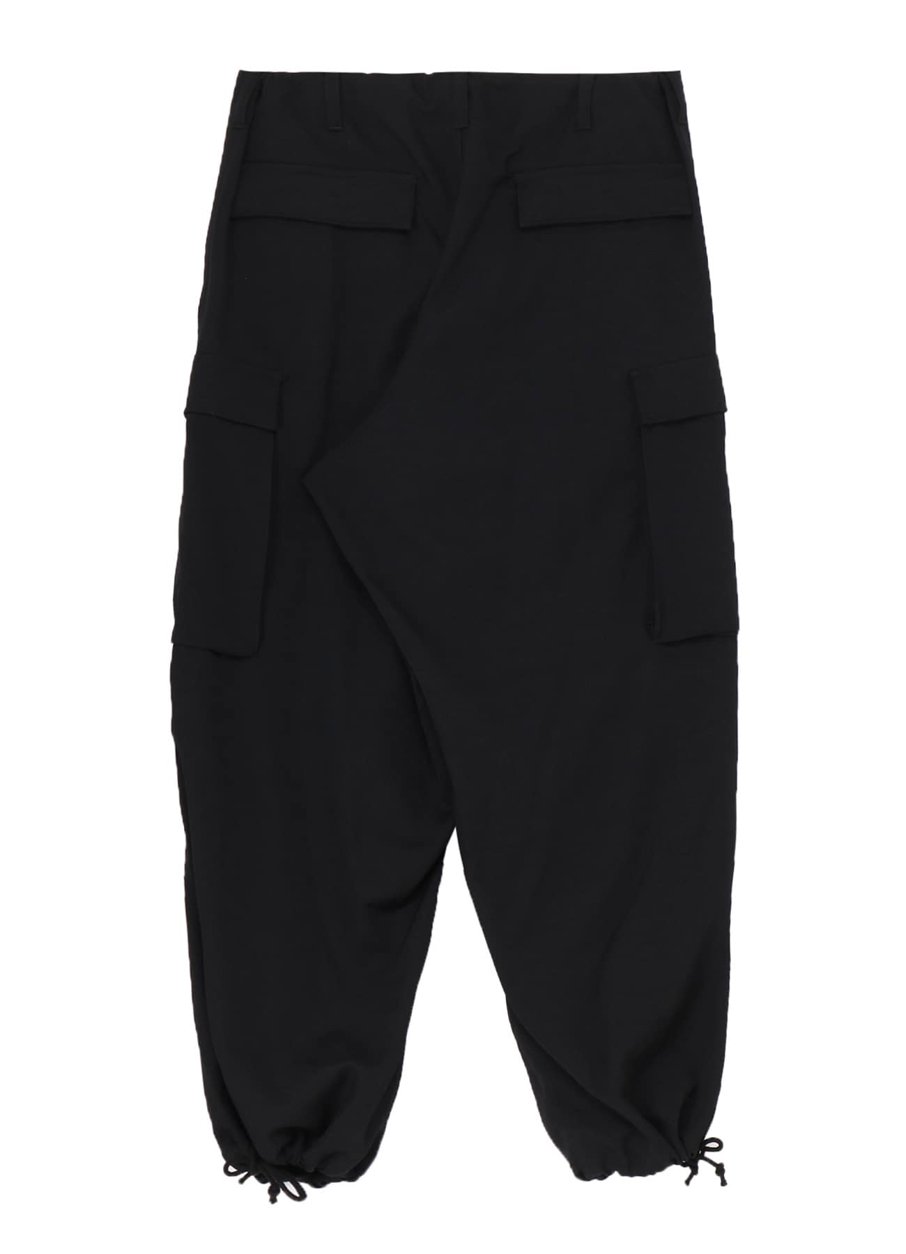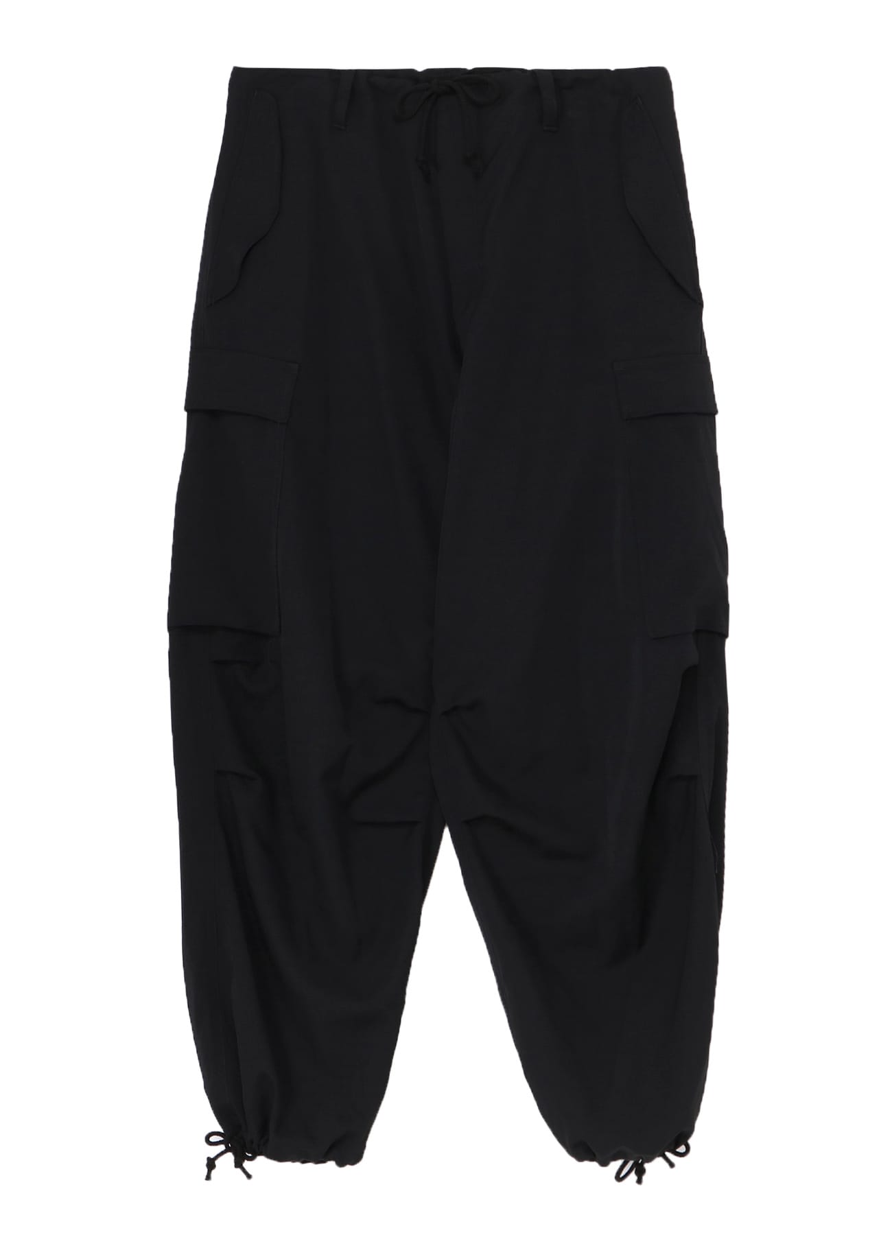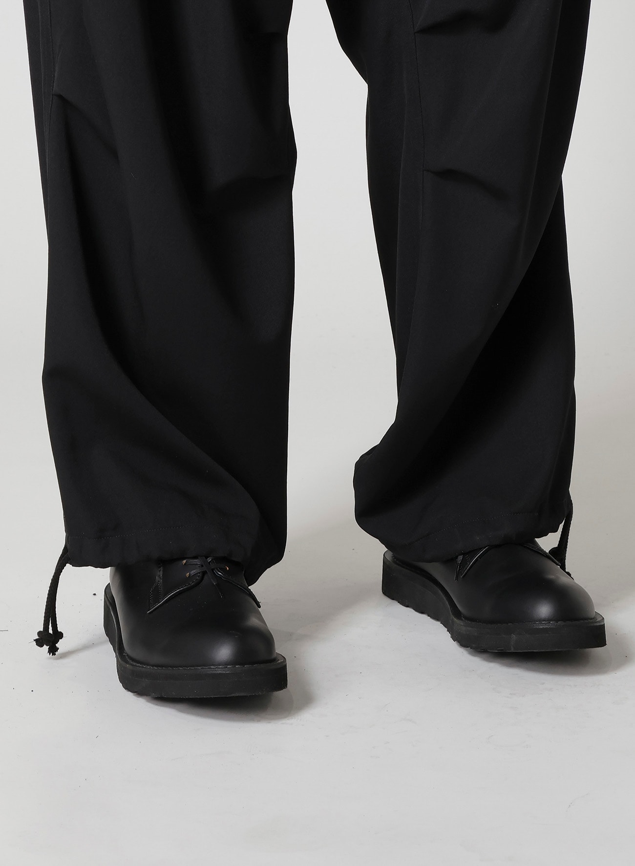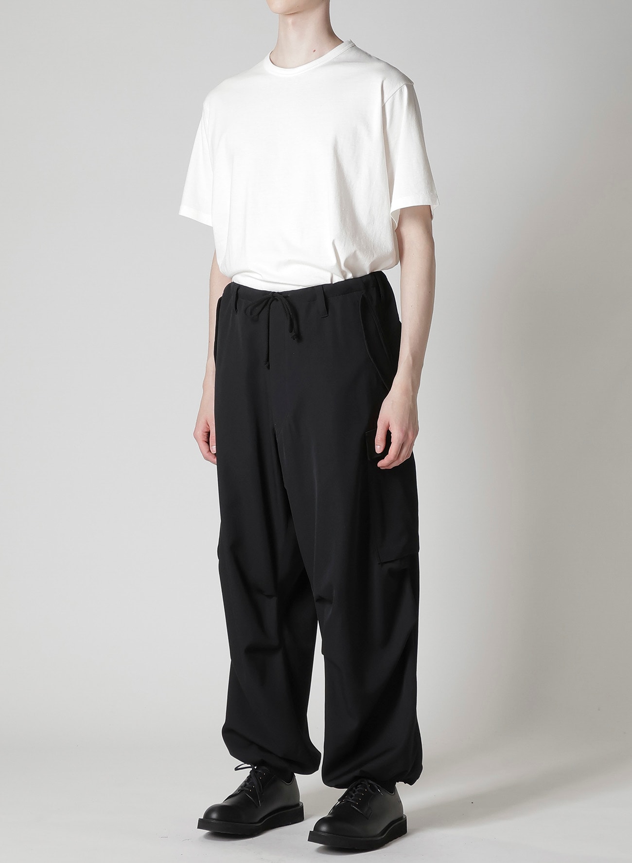 生地は、仕上げの工程でセット性を弱くすることにより織物に軽くシワやシボを付け、ウール本来の風合いに仕上げたヨウジヤマモト社の定番素材であるウールギャバジンを使用しています。カーゴパンツのシルエットに落とし込んだことで、カジュアルからモードまでお楽しみいただけるスタイリングの幅が広がりました。