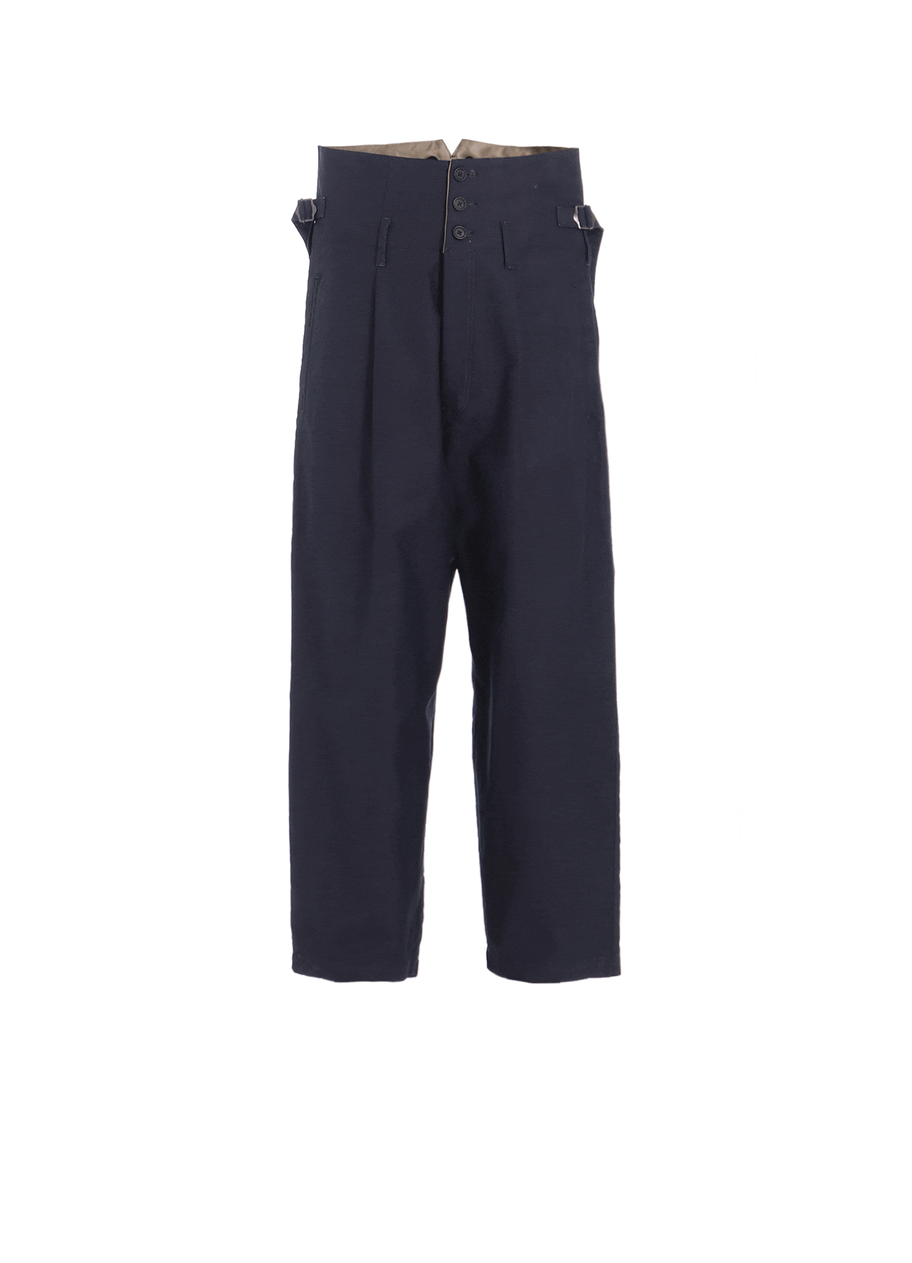 上質なモールスキンクロスを使用した、太めシルエットのハイウエストパンツです。モグラの毛のような短い毛足の起毛が施された生地は、滑らかで高級感のある肌触りが特徴。顔料コーティングと製品洗いによって、ヴィンテージ感のある風合いに仕上げています。リバーシブル仕様で、ウエストや裾を折り返すことで色のコントラストを楽しめるデザイン。脇にはアジャストベルト、ウエストにはサスペンダー用の釦が付いており、様々なスタイリングが可能です。※素材の特性上、ロットで色ぶれの可能性があります。メンズモデル着用サイズ:Mサイズレディースモデル着用サイズ:Sサイズ