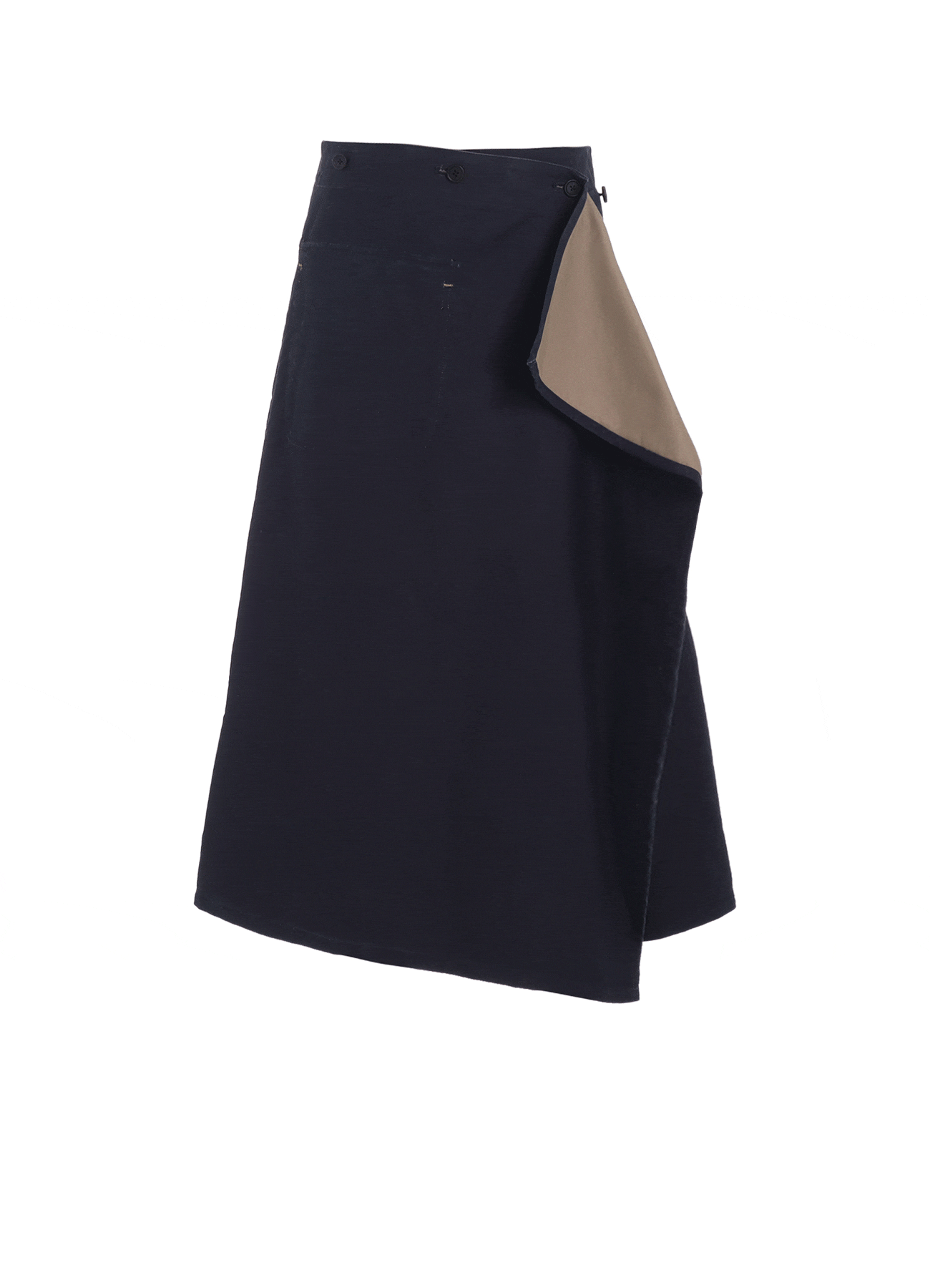上質なモールスキンクロスを使用した、ストライプ柄のラップスカートです。モグラの毛のような短い毛足の起毛が施された生地は、滑らかで高級感のある肌触りが魅力。顔料コーティングと製品洗いにより、ヴィンテージ感のある風合いに仕上げています。釦によってサイズ調整が可能で、幅広い方に着用いただけるデザイン。ポケット付きで実用性も兼ね備えています。リバーシブル仕様で、着用面によってアウトポケットまたは片玉縁ポケットと、異なるポケットデザインを楽しめます。※素材の特性上、ロットで色ぶれの可能性があります。