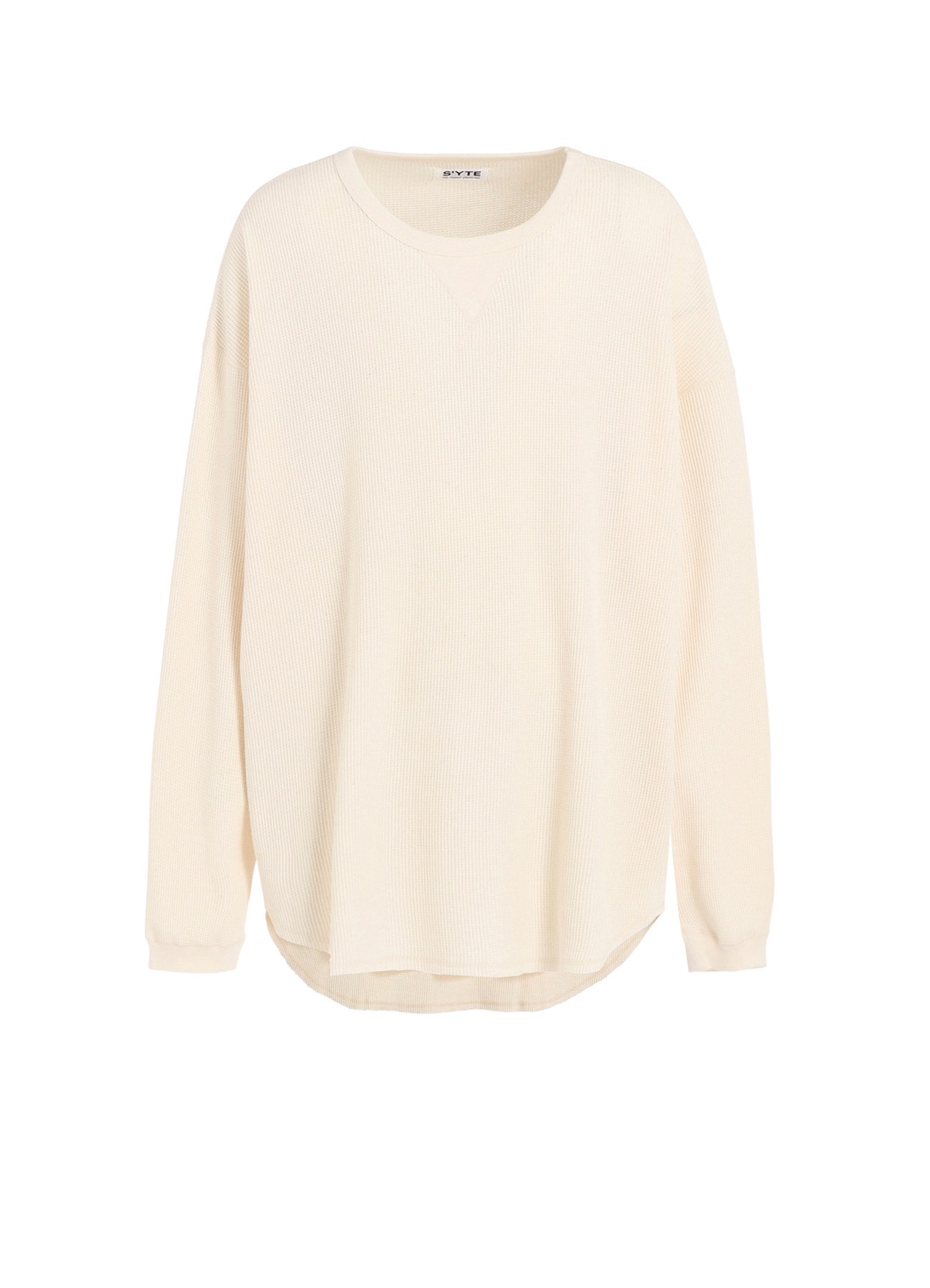 柔らかなコットンワッフルサーマル素材を使用した、ゆったりとしたシルエットのロングTシャツ。首元にはガセットを施し、スポーティなニュアンスをプラス。袖口にはフィット感のあるフライス素材を使用し、切り替え部分に入ったまたぎステッチがさりげないアクセントになっています。裾は裁ち切り仕様で、ラフな雰囲気を演出。着用すると、リラックス感のある着心地と程よいボリューム感があり、一枚でスタイルが決まるアイテムです。白・黒2色展開です。