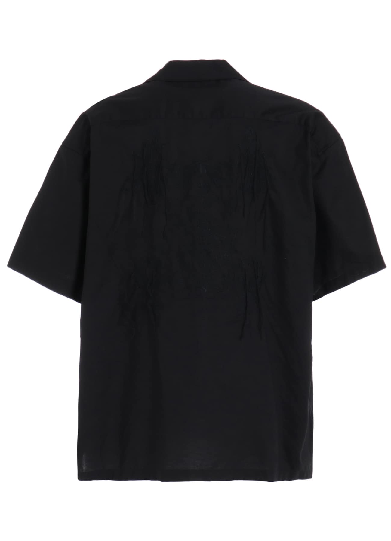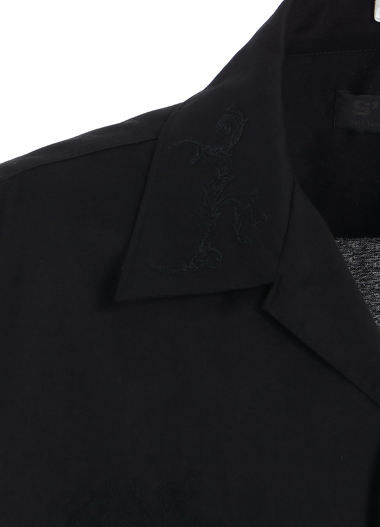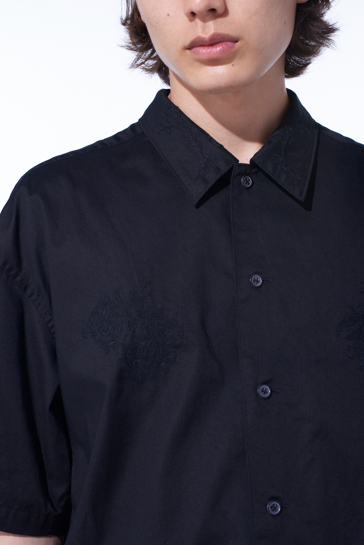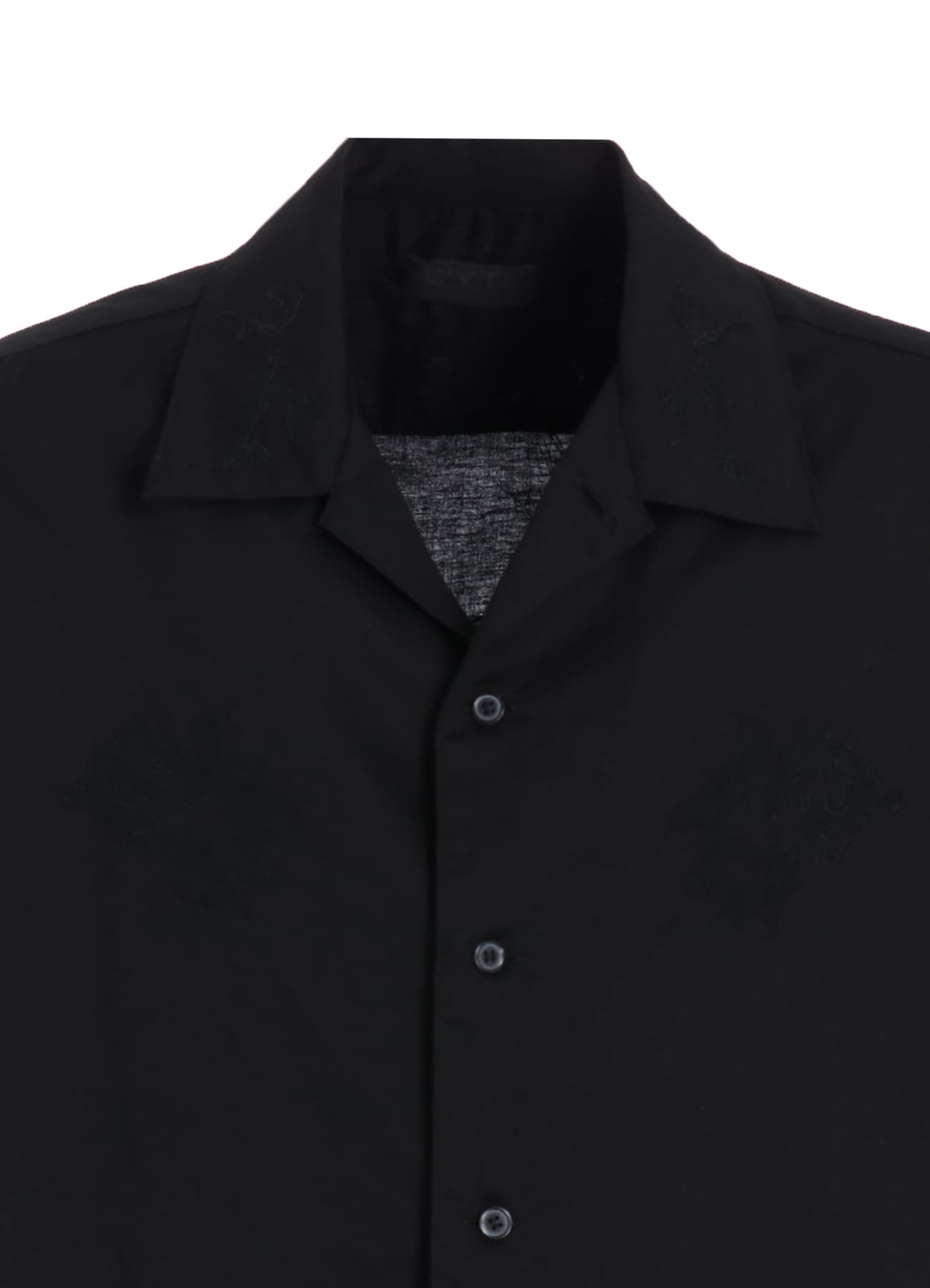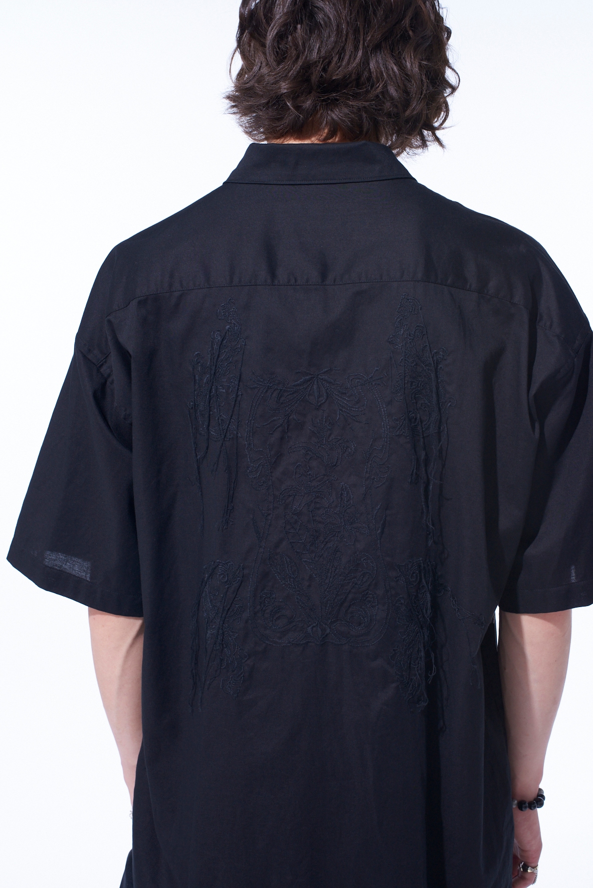華麗で複雑な模様のバロック柄刺繍を襟、胸、背中に入れたオープンカラーシャツ。バックスタイルを飾る大きな構図の刺繍は1本1本の輪郭線にこだわり抜き、あえて刺繍糸を長く垂らすことで風に靡き、スタイリングのアクセントになる独特のニュアンスと華やかさが魅力。胸元を涼やかに演出するオープンカラーはトップボタンを留めることで首元のニュアンスアレンジが可能。柔らかい風合いに仕上げた薄手のコットンツイルは耐久性があり、着用を繰り返すことで綿素材ならではの雰囲気あるヤレ感を楽しめる。クセのないシルエットなのでさまざまなボトムとのコーディネートを楽しめる。